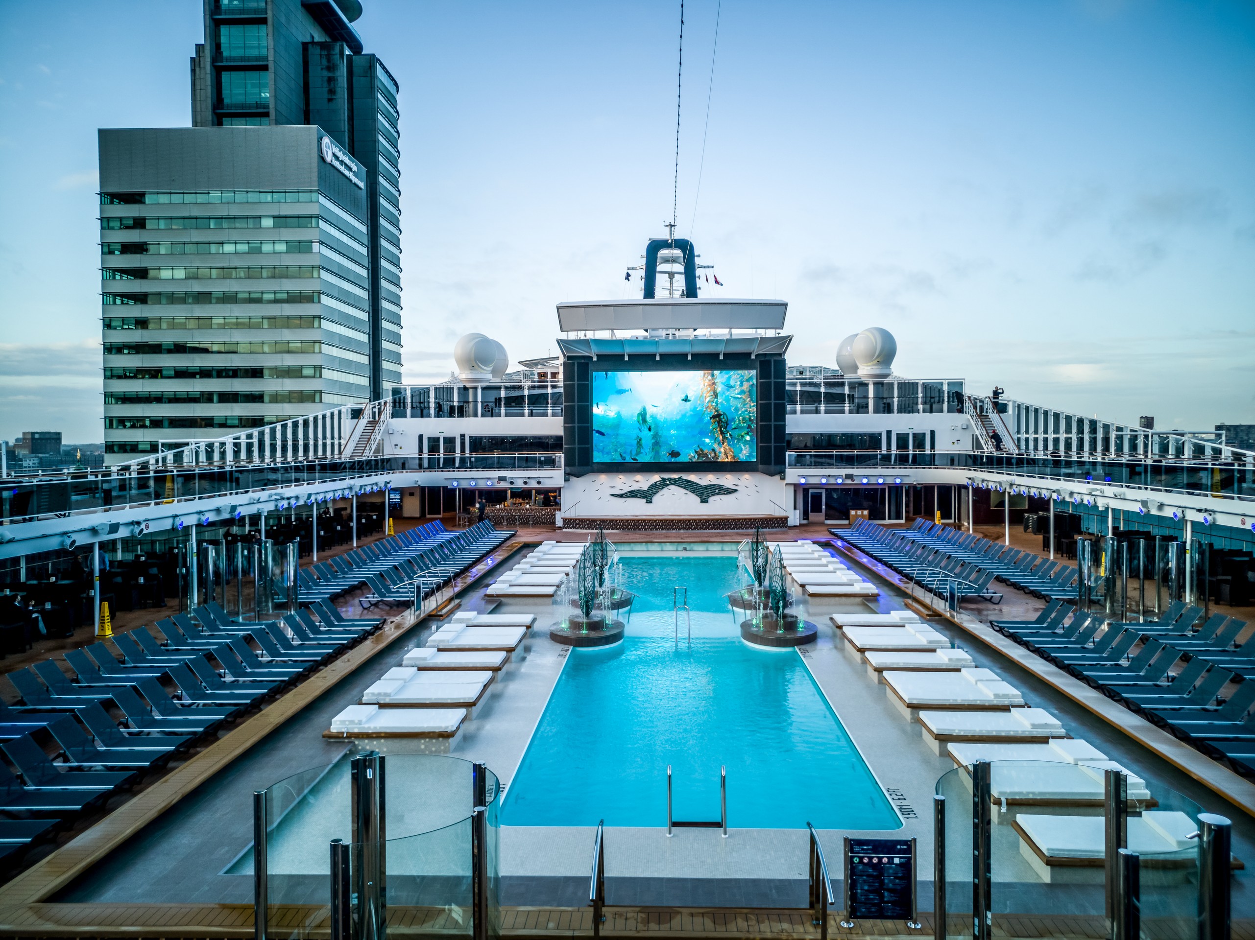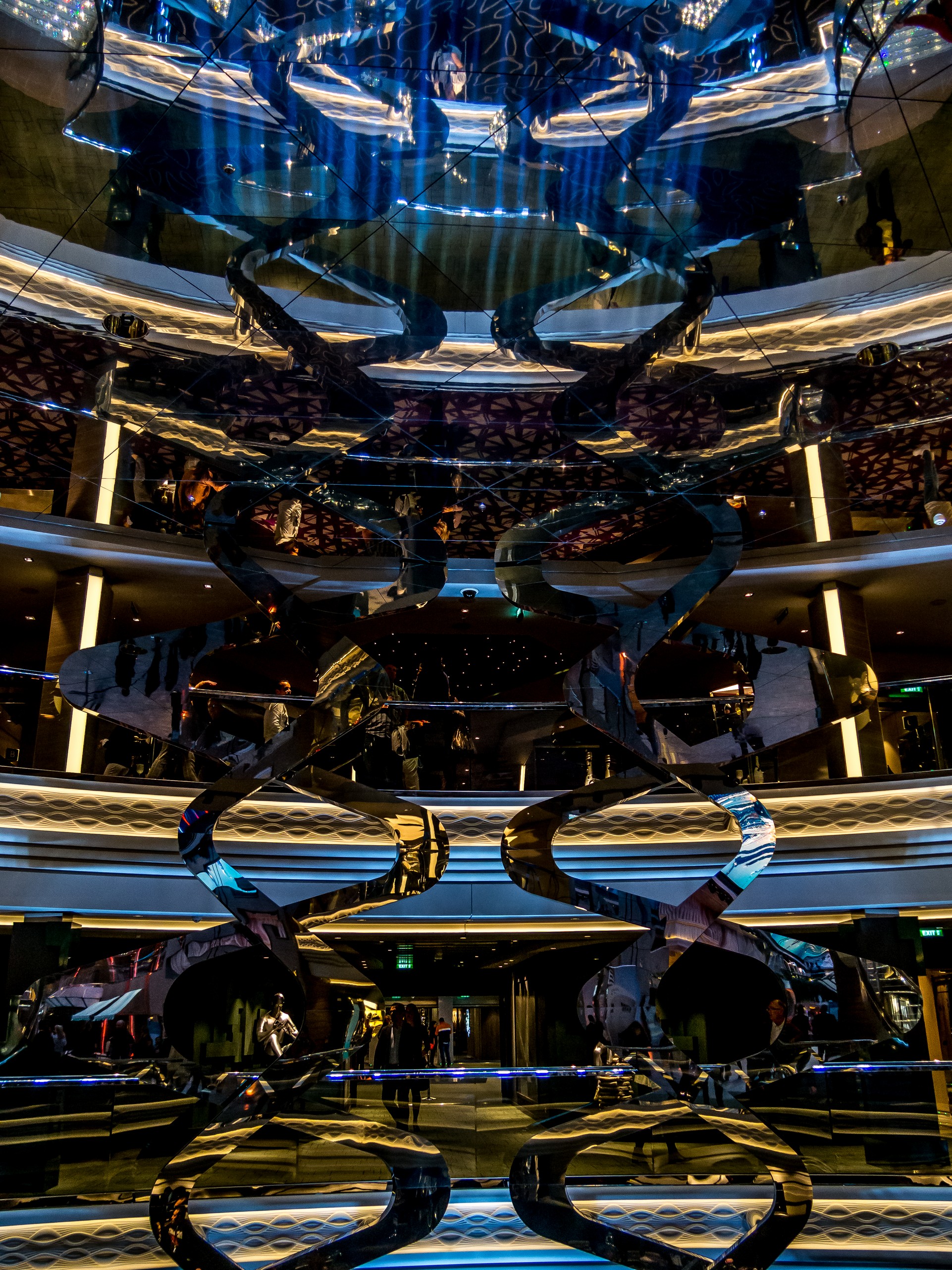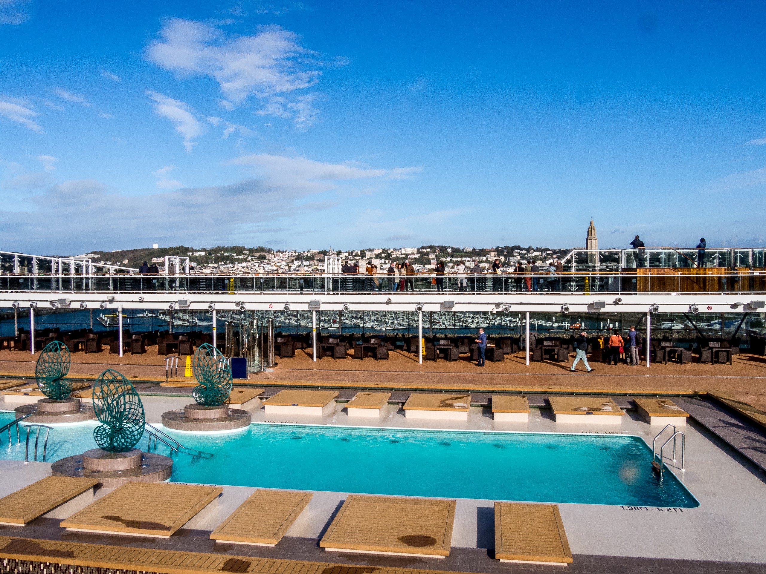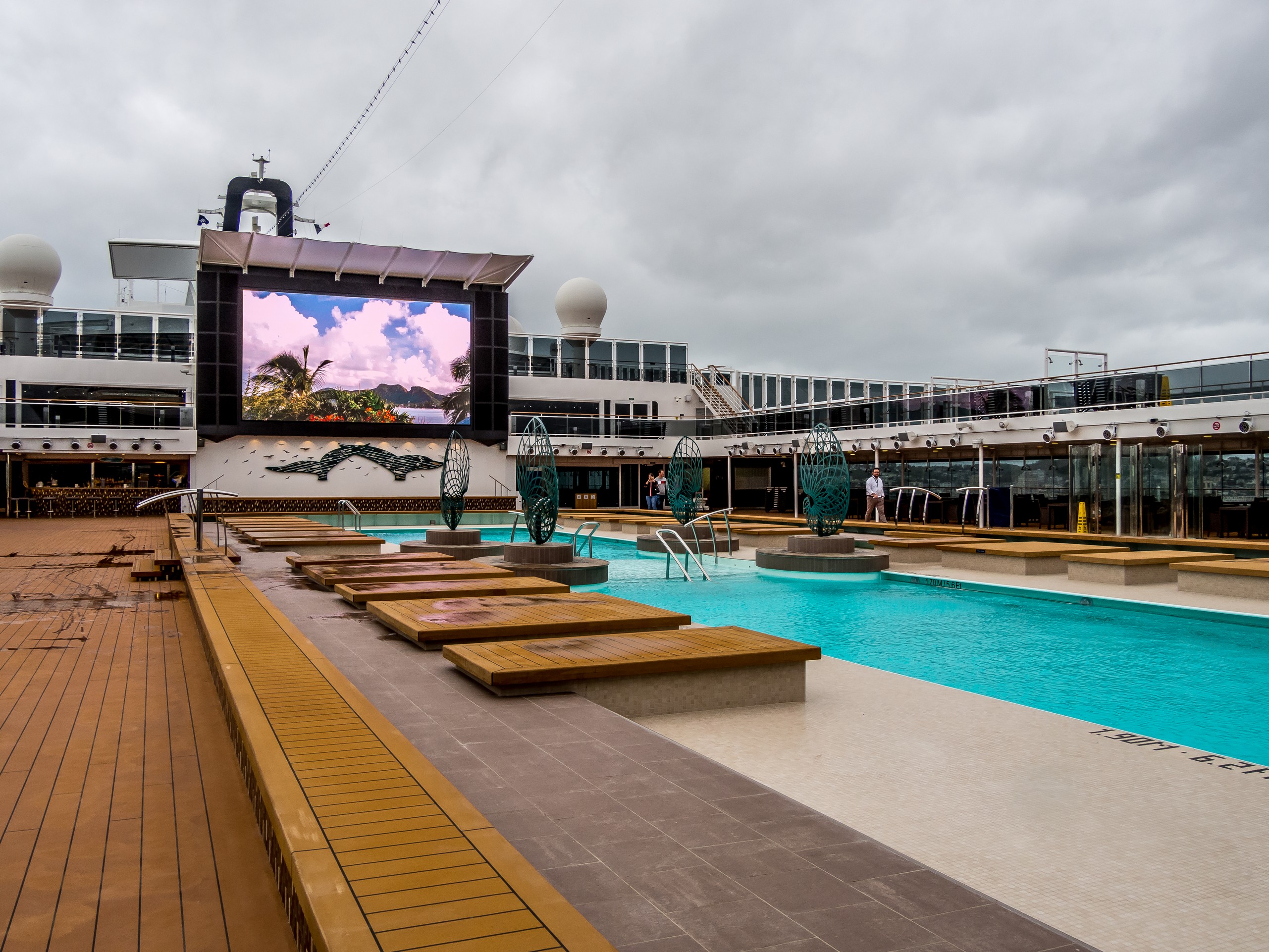 Du côté des grands classiques des bateaux de croisière, on trouve les piscines (3, dont un avec un magrodôme), le théâtre (étrangement petit, je trouve pour un navire de cette taille) où se déroulent des spectacles musicaux (on a l'occasion d'en voir deux), un grand (et rutilant) casino et un Studio TV and Bar qui sert à la fois d'espace pour des spectacles et de divertissement comme des quizes ou des concours...