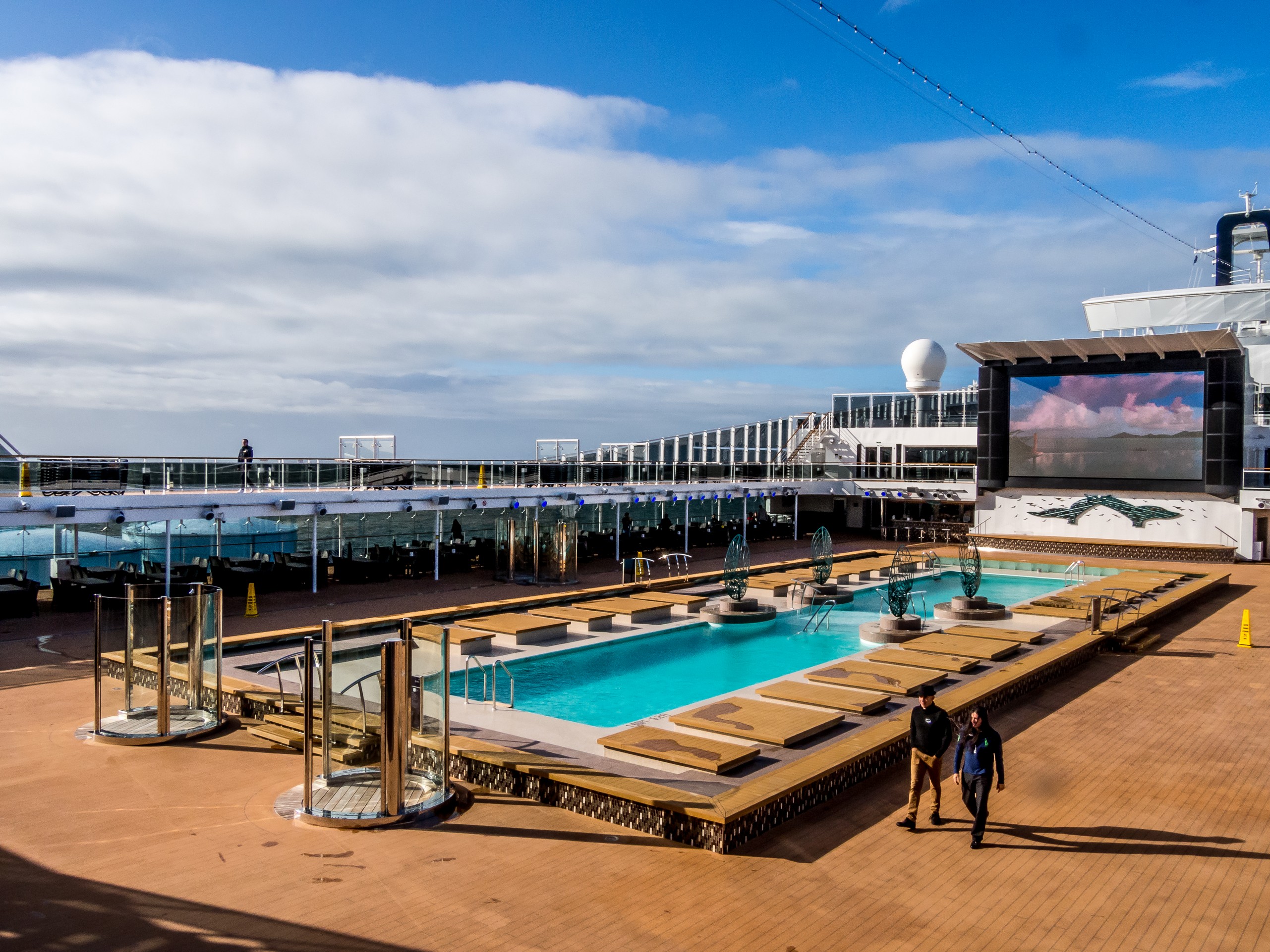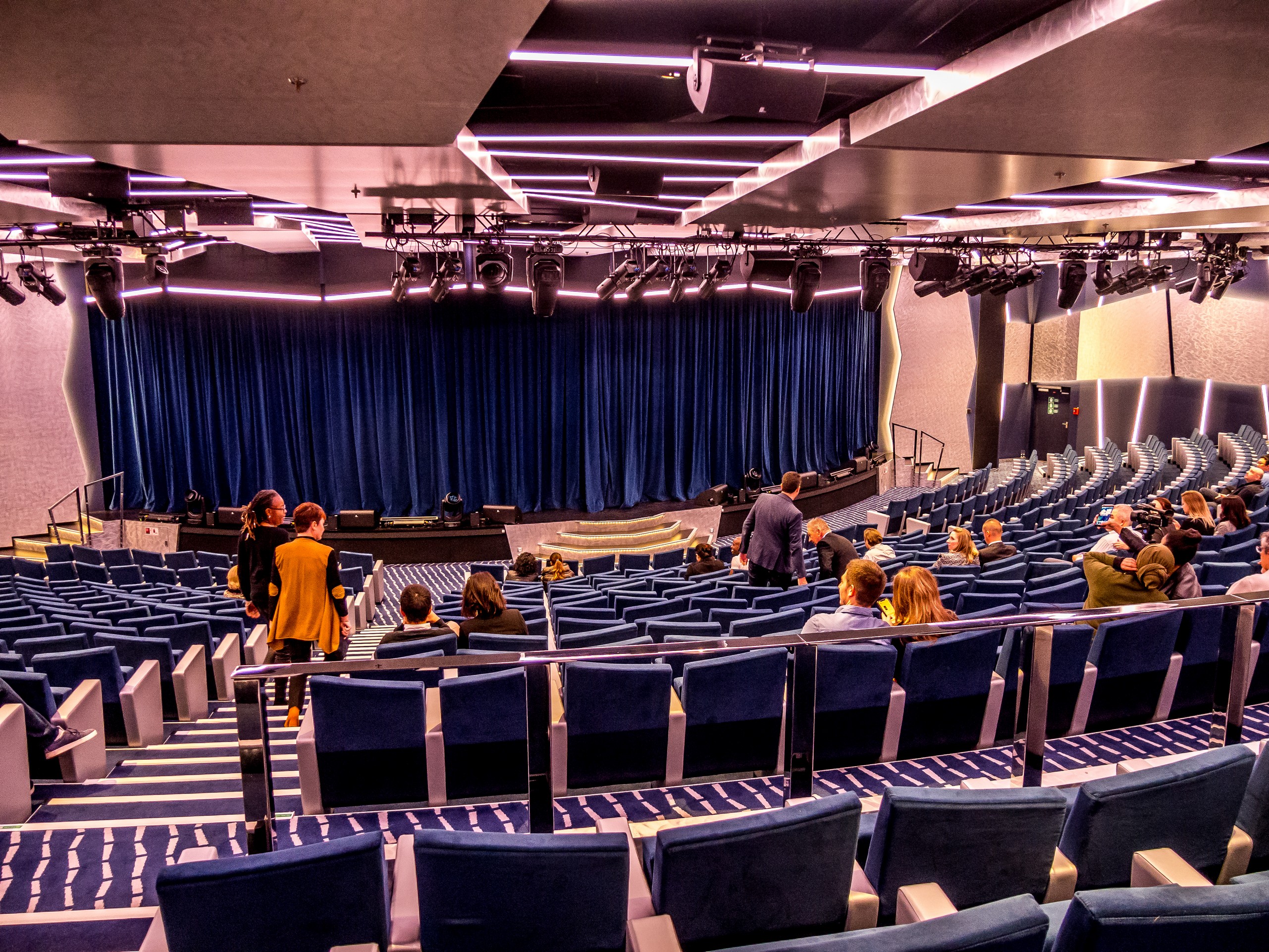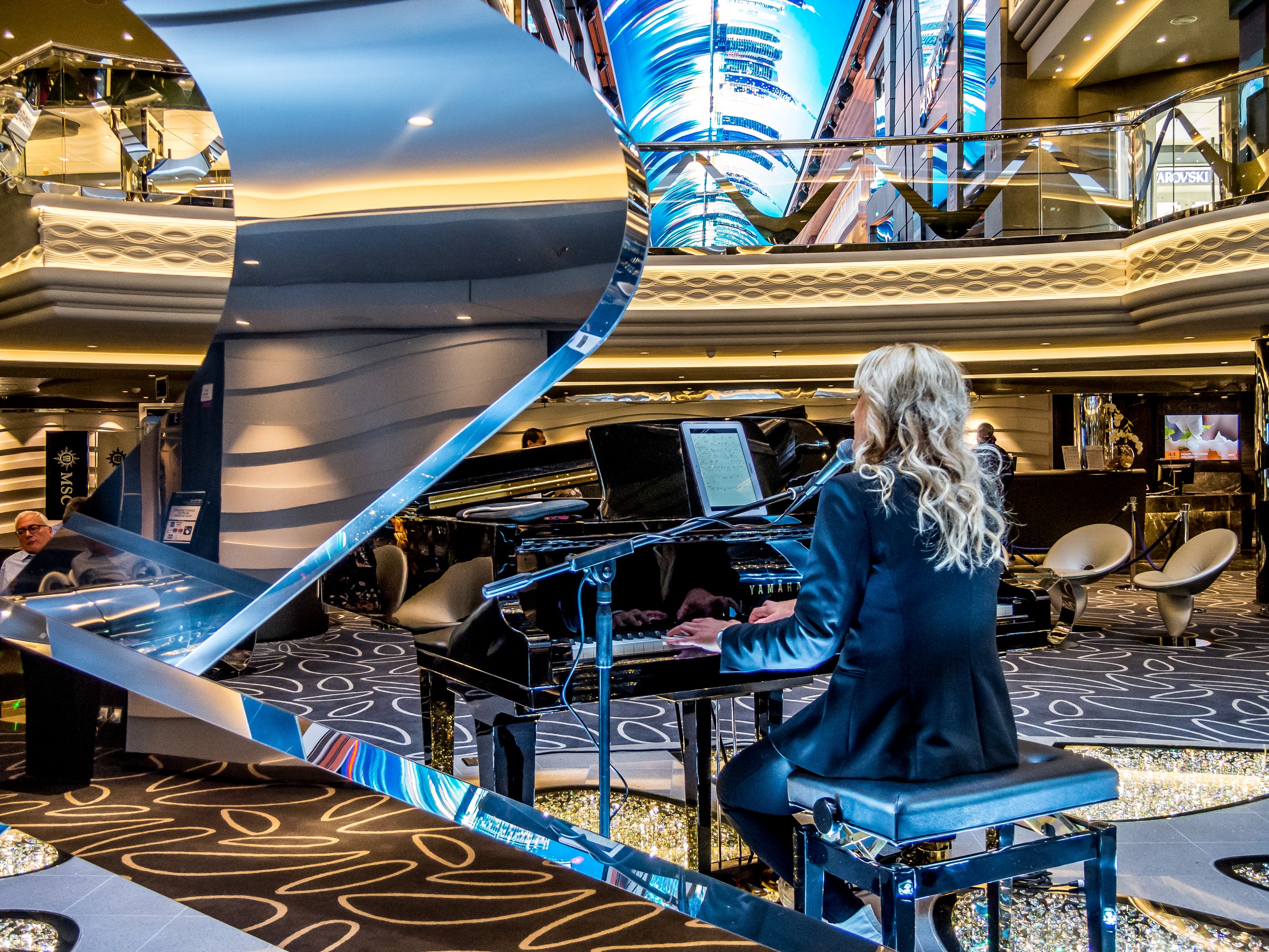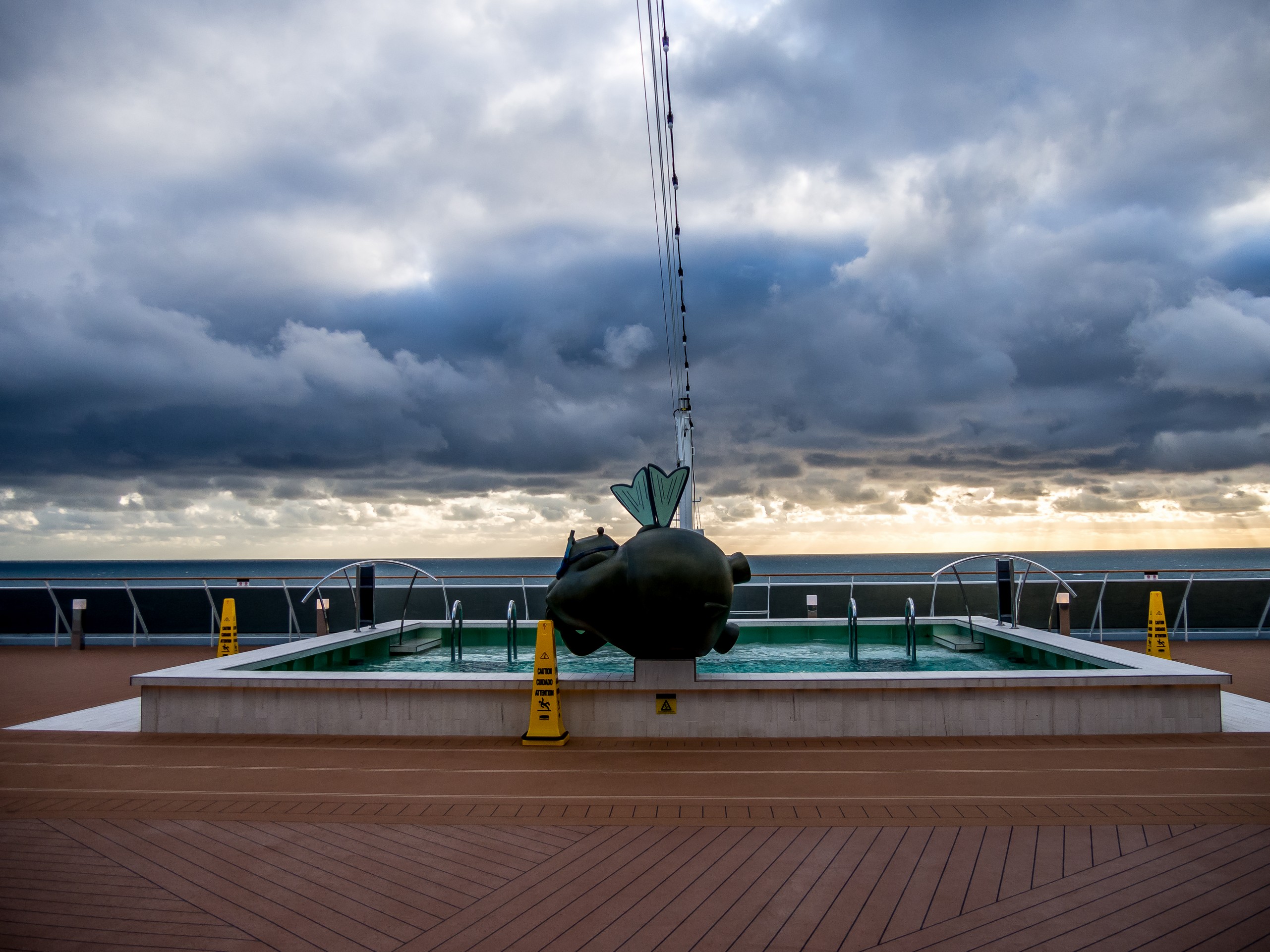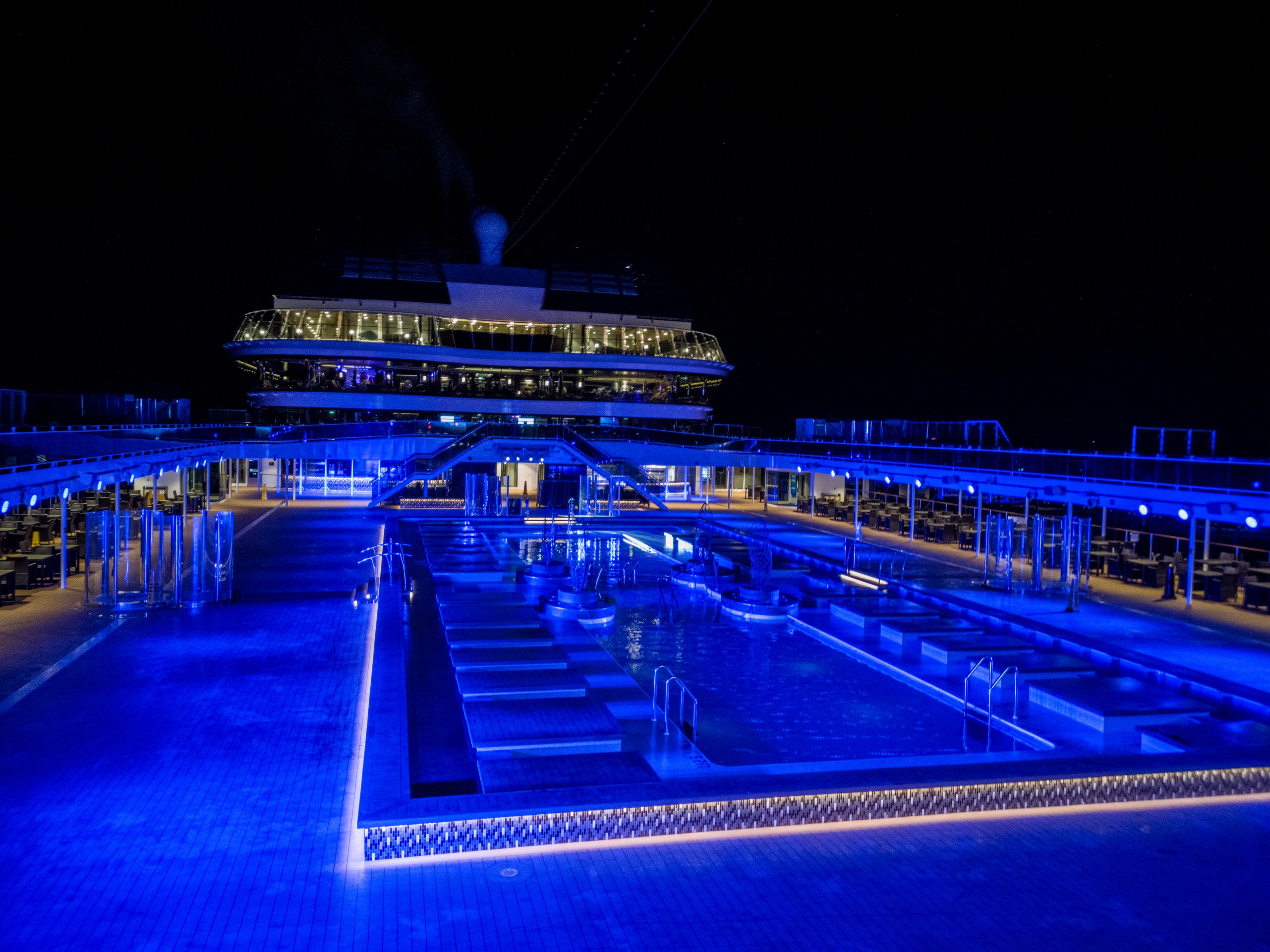 Du côté des grands classiques des bateaux de croisière, on trouve les piscines (3, dont un avec un magrodôme), le théâtre (étrangement petit, je trouve pour un navire de cette taille) où se déroulent des spectacles musicaux (on a l'occasion d'en voir deux), un grand (et rutilant) casino et un Studio TV and Bar qui sert à la fois d'espace pour des spectacles et de divertissement comme des quizes ou des concours...