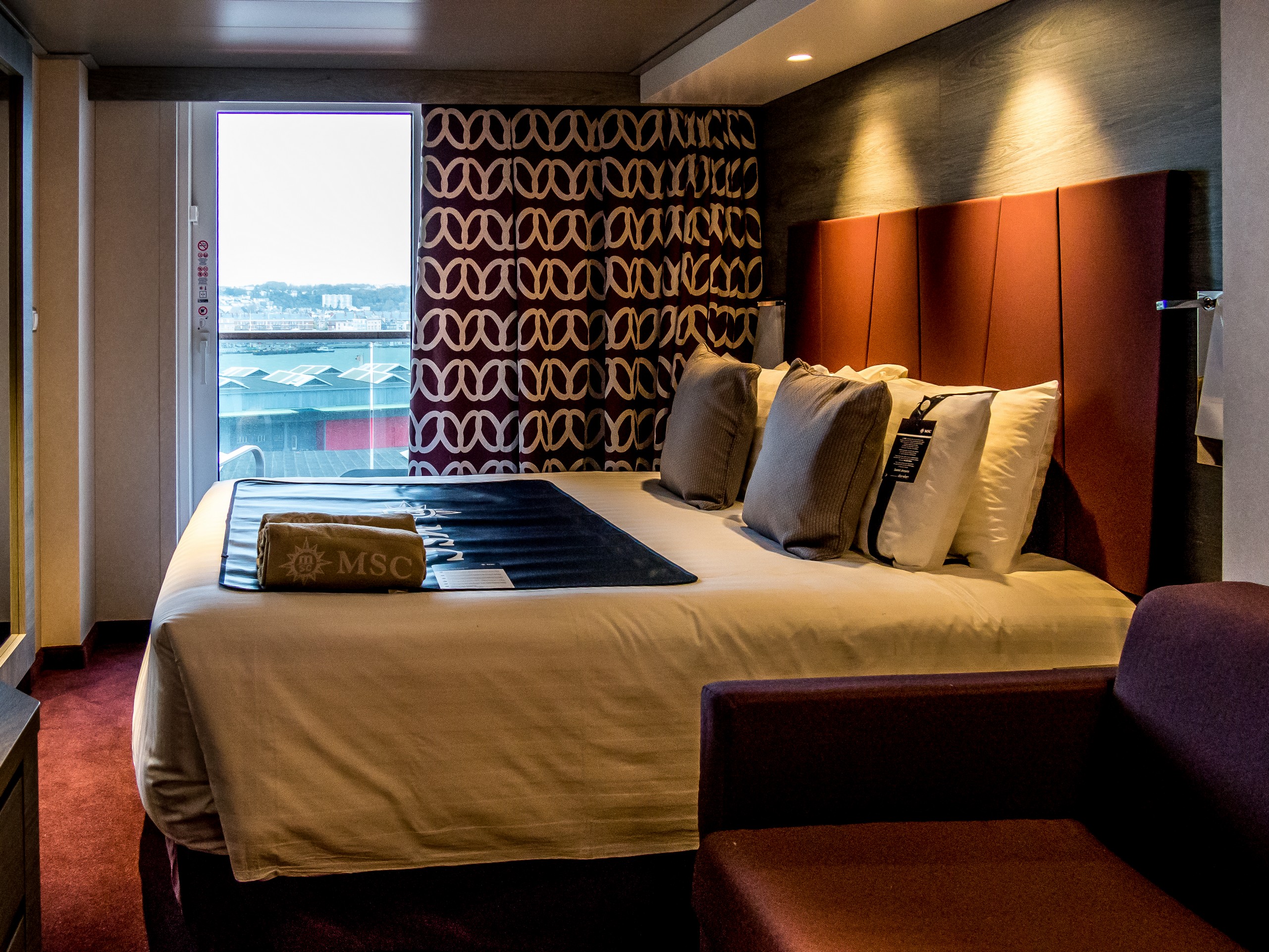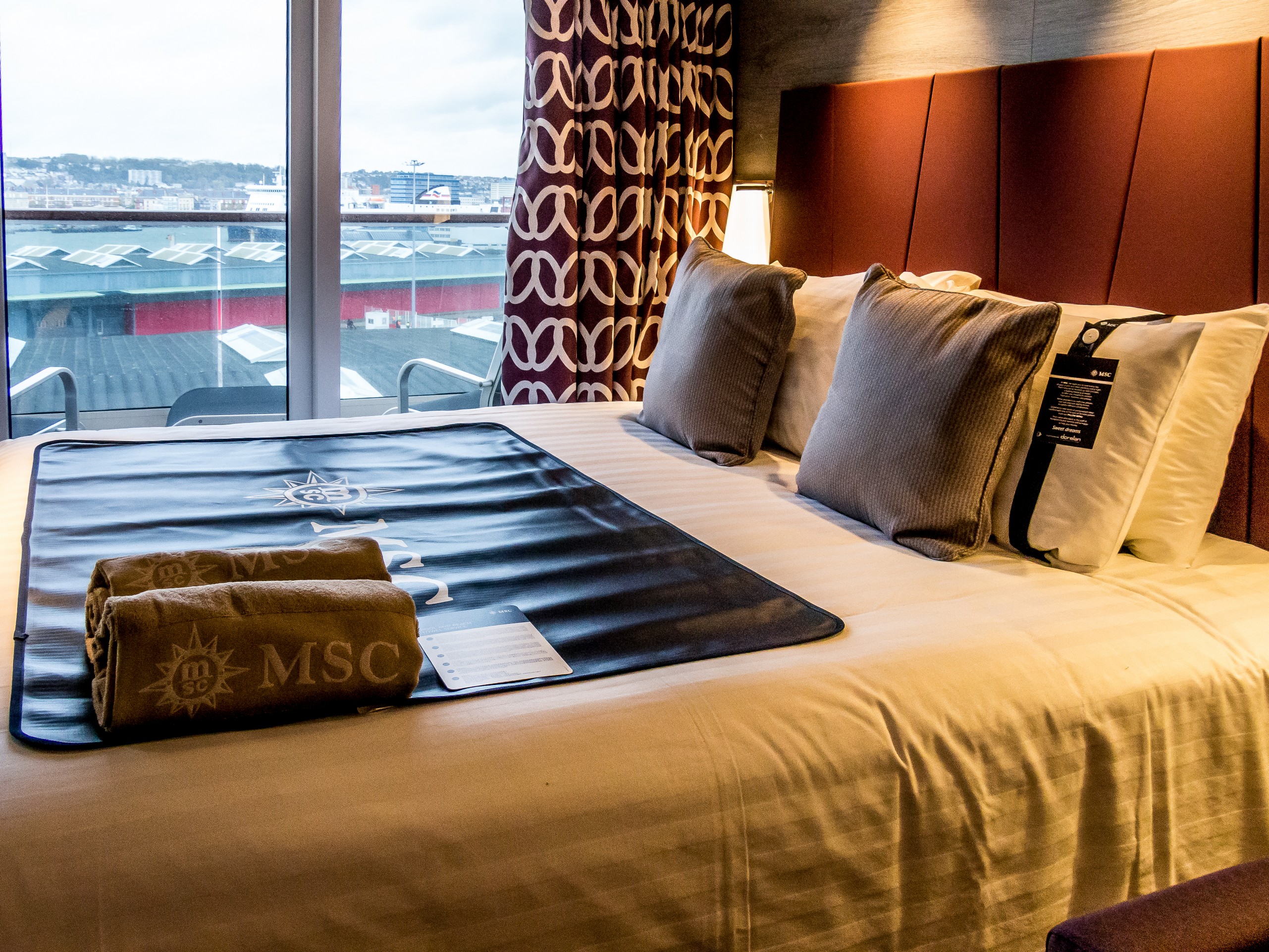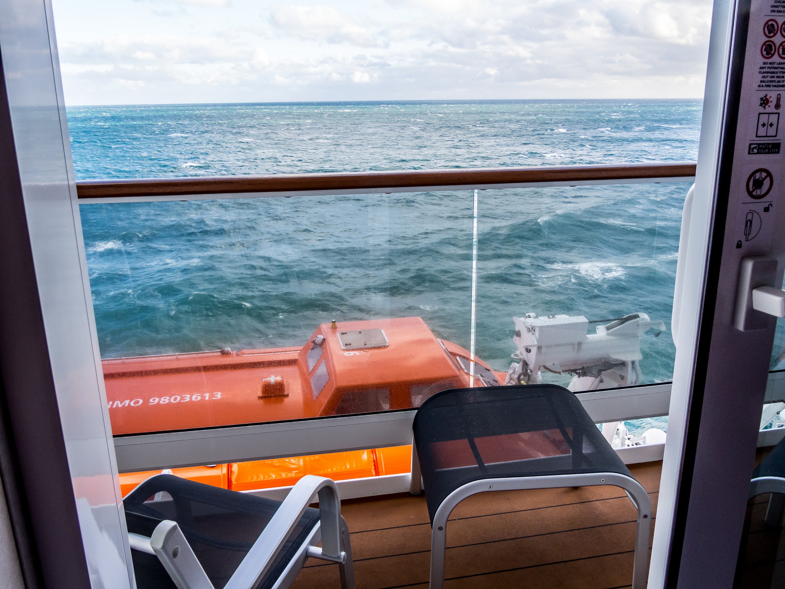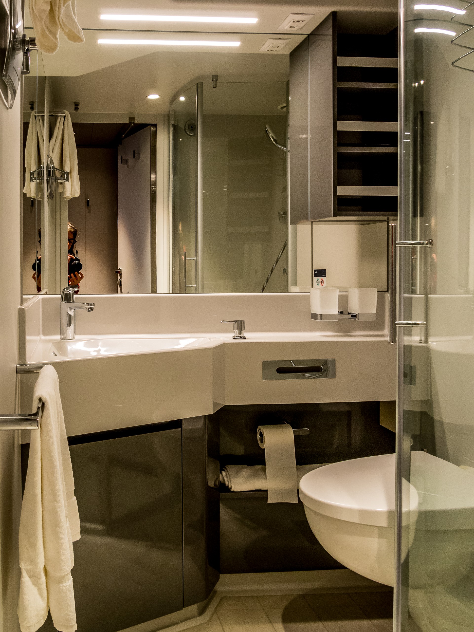 La première chose à faire quand on embarque, c'est d'aller découvrir sa cabine et se délester de son bagage. Et je découvre une chambre de belle taille avec, joie, un balcon. Je râle déjà de ne pas pouvoir l'utiliser plus souvent, nous ne serons à bord que pour deux nuits. Les tons de la cabine sont dans le taupe et le prune et un grand sofa trône devant un bureau qui sert également de coiffeuse. La salle de bain est assez grande aussi pour une cabine et, heureusement, c'est une paroi en verre dans les douches, ouf. On dirait que l'ère du rideau en plastique est définitivement révolue !