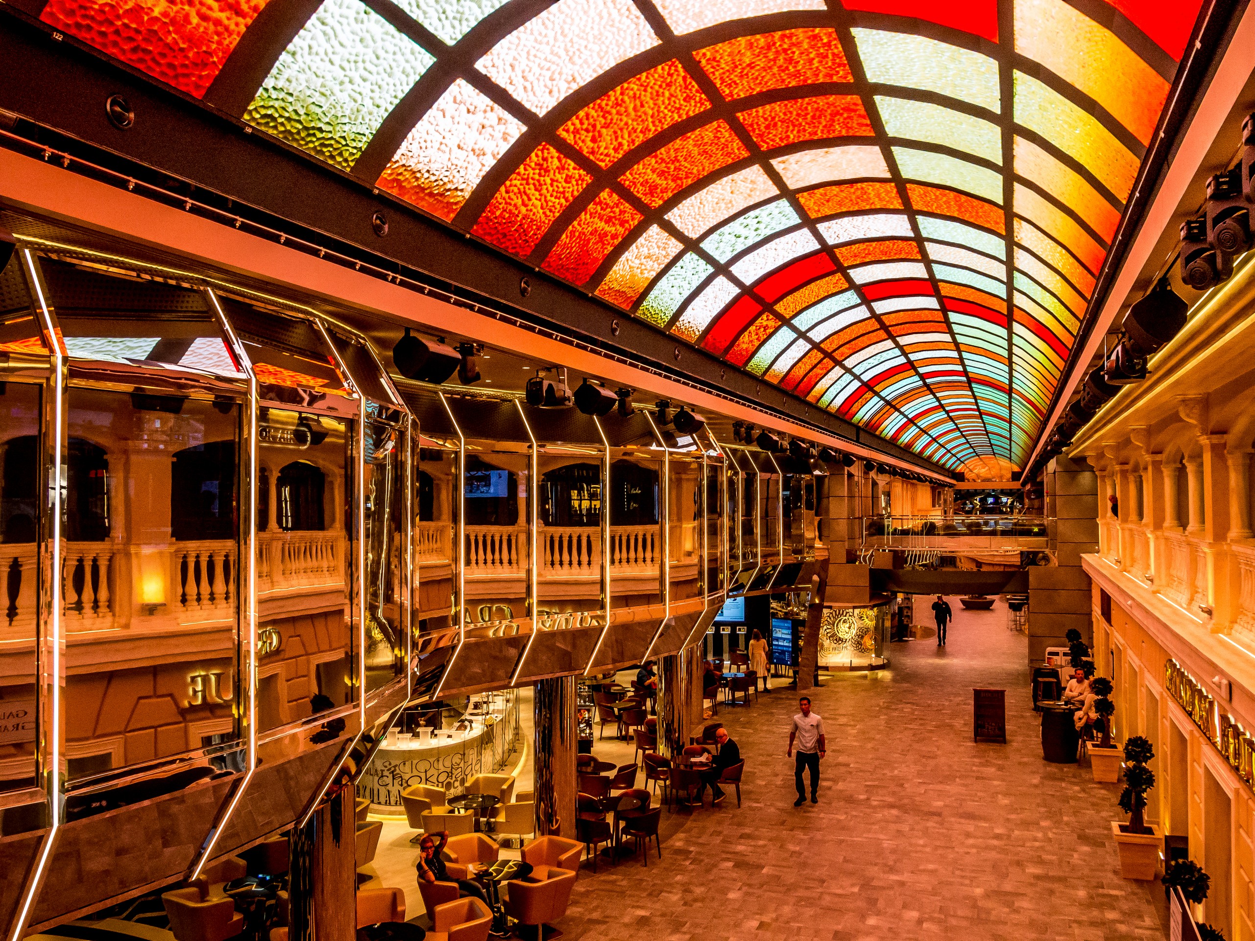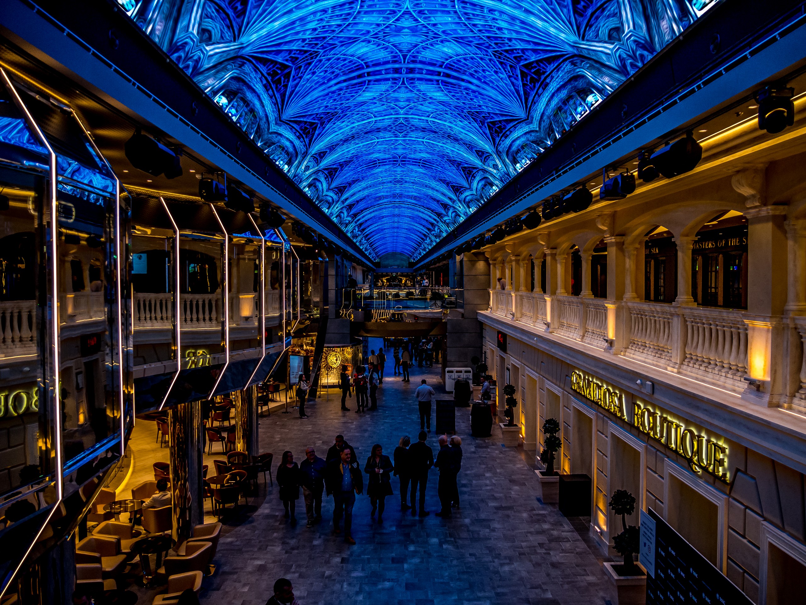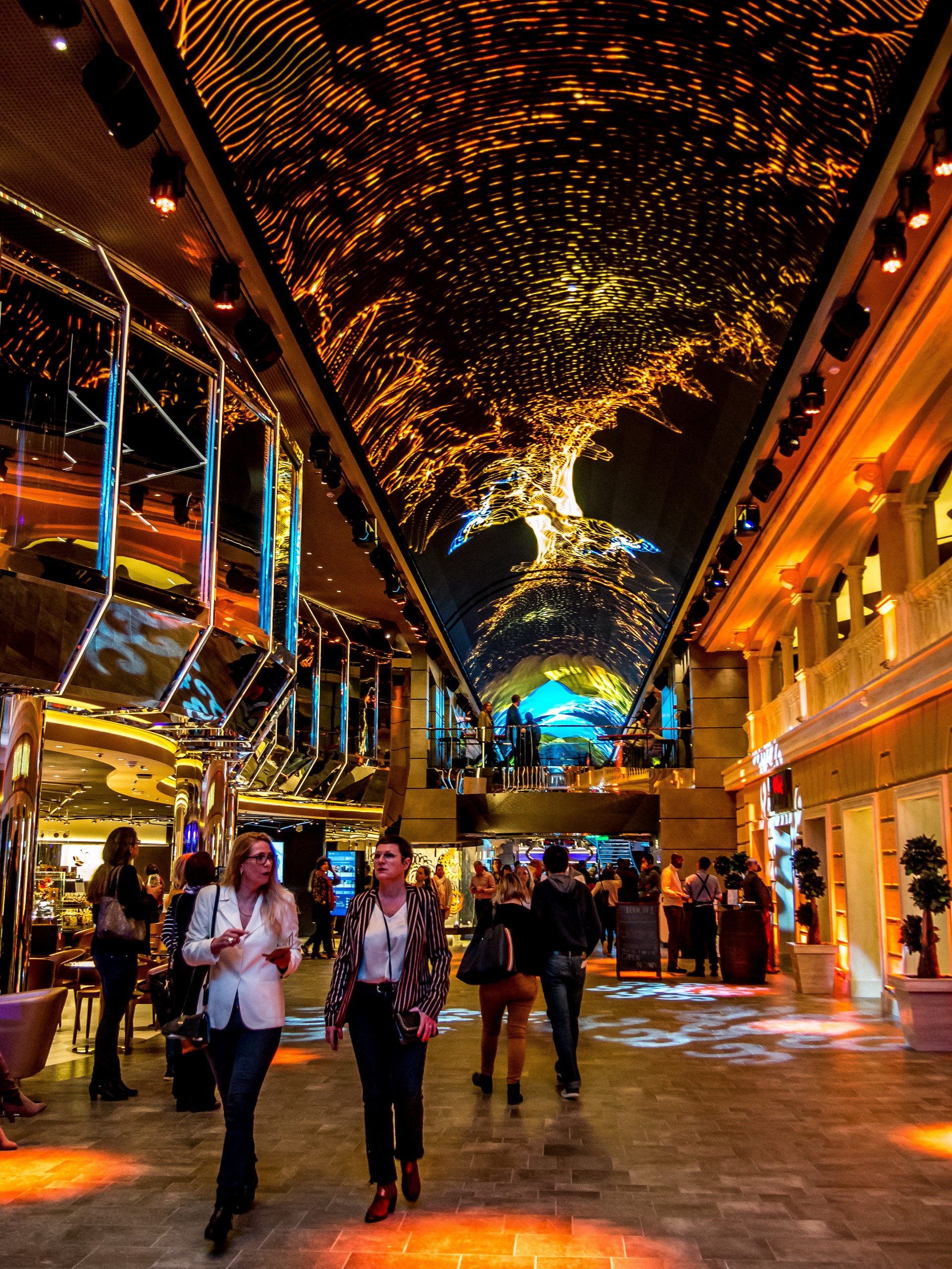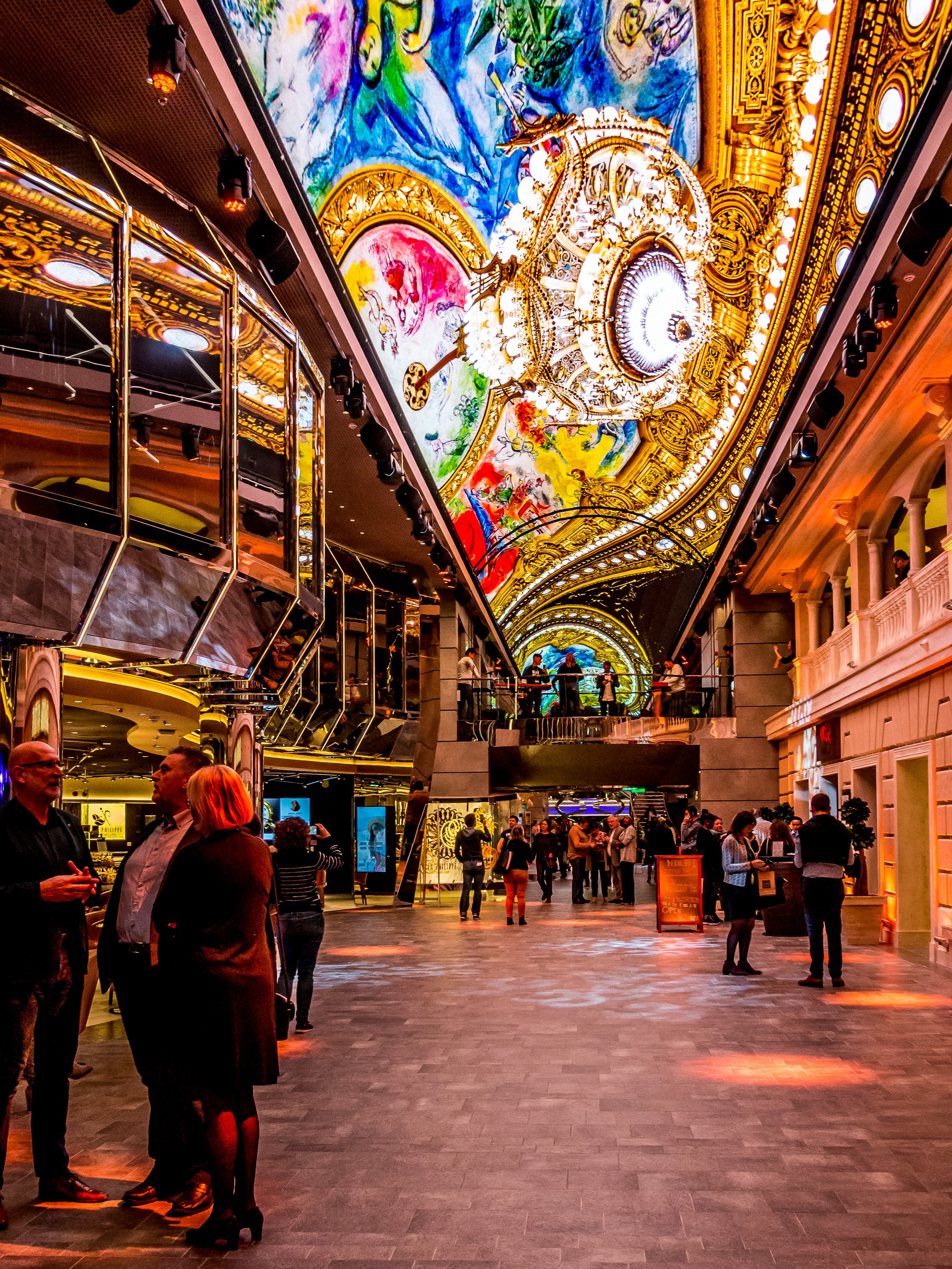 Arrivé la veille et tout frais sorti du chantier naval à Saint-Nazaire, nous serons parmi les premiers à le découvrir, les premiers à dormir dedans et servirons aussi un peu de cobayes pour l'équipage. Le MSC Grandiosa porte bien son nom, il est grand. Très grand. Pas aussi grand que le fameux Symphony of the Seas mais bien plus que le MSC Orchestra visités tous les deux l'année dernière. Dire que je suis un peu excitée est un euphémisme. Découvrir un nouveau navire, c'est pour moi comme déballer un gros cadeau. L'embarquement se fait rapidement puisque nous sommes moins nombreux que dans une croisière classique. Fait exceptionnel, nous allons passer la nuit à quai, au Havre. Je suis bien tentée d'aller refaire un tour dans cette ville que j'avais bien aimé mais il y a trop à faire à bords ! Un paquebot est une vraie petite ville et il a beaucoup de « quartiers » à visiter et le premier à découvrir est celui par où on rentre, une immense galerie façonnée comme une rue pavée avec ses cafés, ses restaurants, ses magasins et au dessus, une immense voute recouvert d'écrans qui changent d'animation selon le moment de la journée. Elle peut même être utilisée comme « illustration visuelle » lors de spectacles qui se tiennent dans la galerie, comme nous allons le découvrir plus tard. C'est vraiment le coeur du navire, là où tout le passe, là où tout le monde se retrouve et se donne rendez-vous.