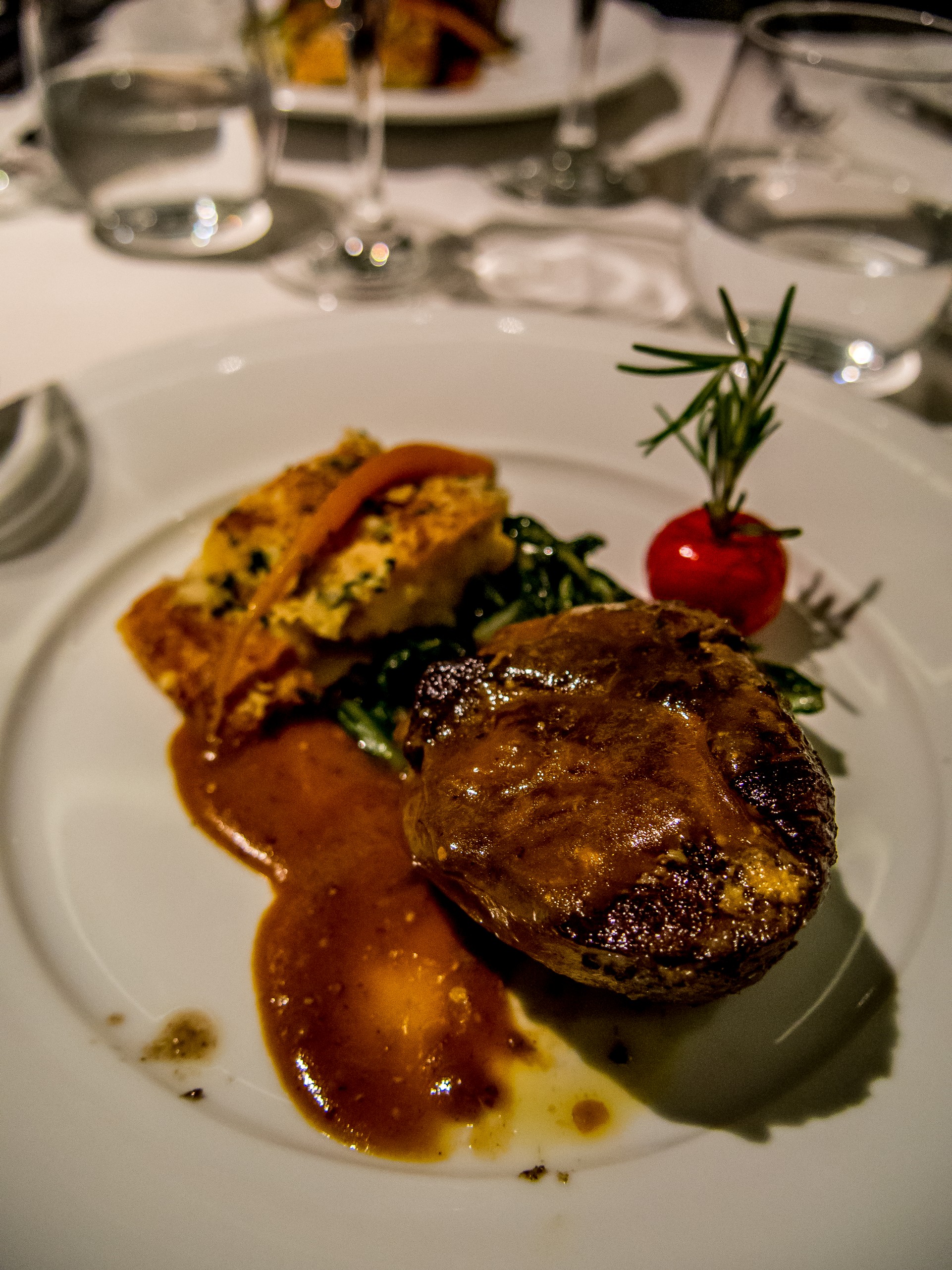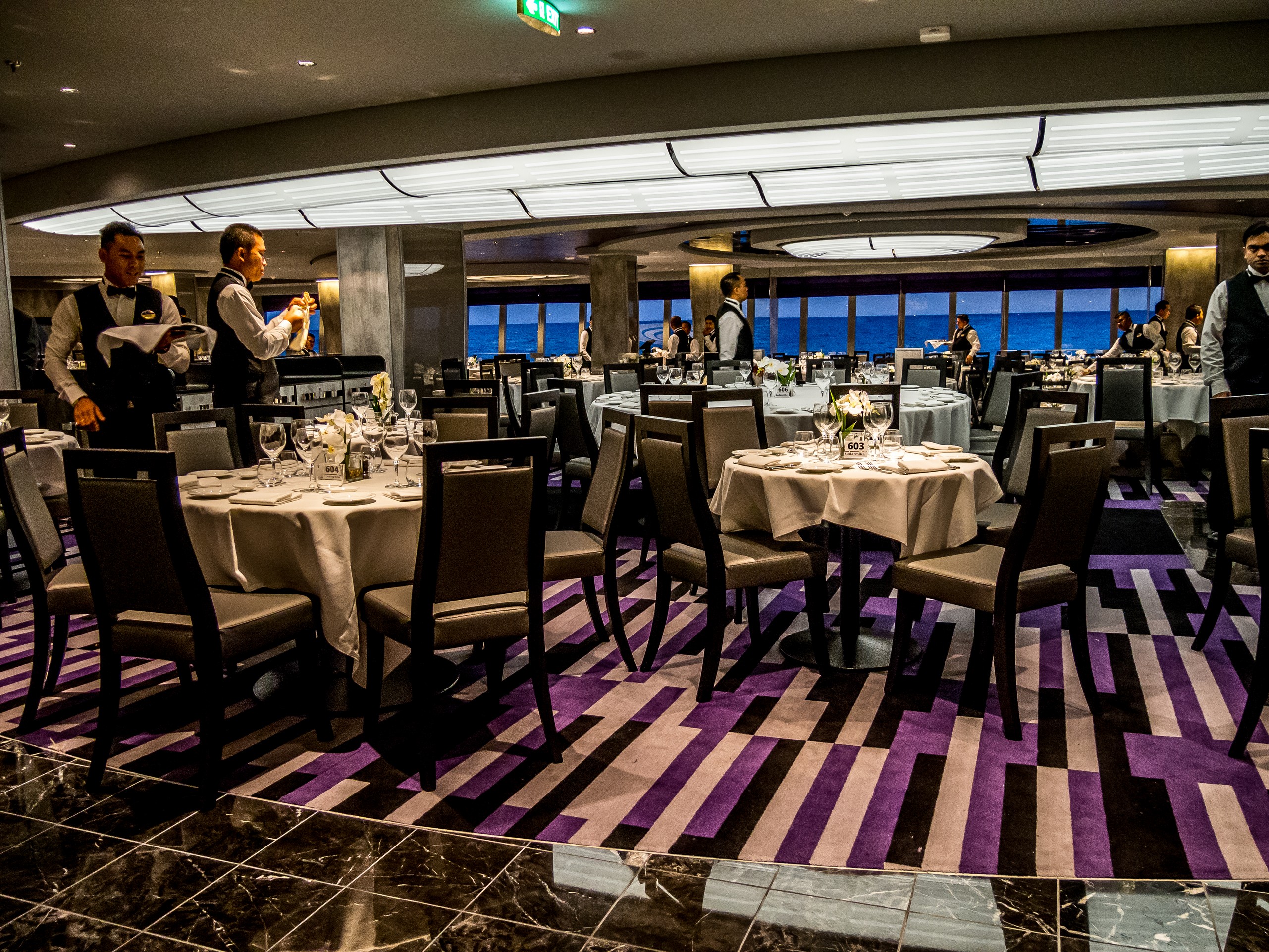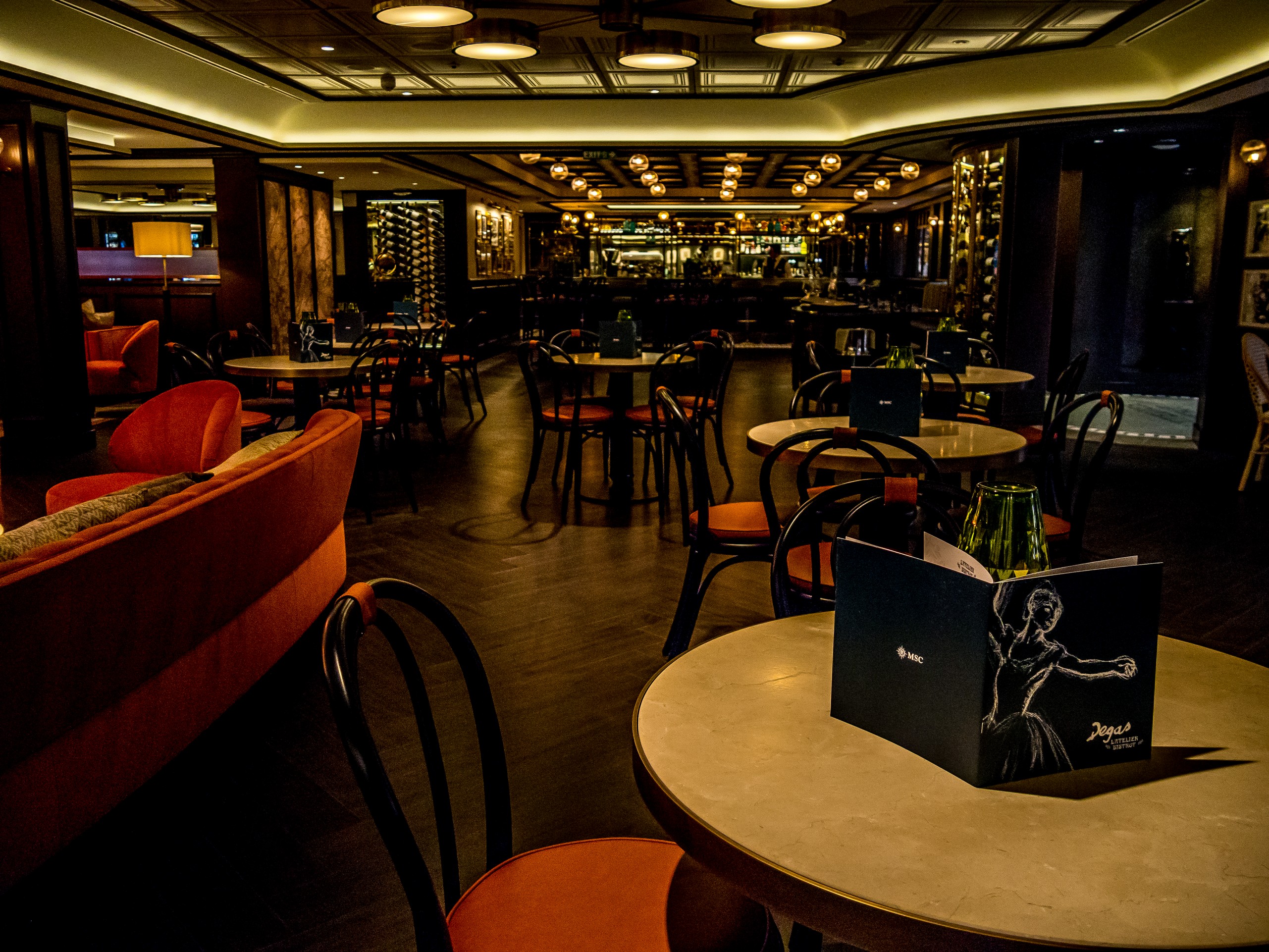 On va commencer par un aspect SUUUPER important dans une croisière : les restaurants. Impossible de rentrer d'une croisière sans avoir pris un peu de poids et sur le MSC Grandiosa, il n'y a pas moins de 11 restaurants (et 20 bars). Cinq d'entre eux sont les restaurants principaux (qui sont compris dans le prix de la croisière) et sauf si vous y aller à l'heure du dîner, vous ne les verrez pas tous car un restaurant, une heure et une table sont attribués par cabine pour le service du soir. C'est rare d'avoir autant de restaurants principaux au sein d'un navire mais il semble que la tendance soit à la multiplication pour que les espaces soient un peu moins impersonnels. Chacun (« Il Campo », « La perle grise », « La perla griggia », « La Loggia » et le « Purple Crab ») ont leur ambiance et leur style mais j'ai une petite préférence pour le Purple Crab, à la poupe du bateau (tout comme La Loggia) mais un pont au dessus. Si jamais ce restaurant ne vous est pas attribué, venez-y pour le petit-déjeuner ou le dîner ! Qu'en est-il des dîners, d'ailleurs ? Eh bien, j'ai été encore fois agréablement surprise par la qualité des plats : savoureux, bien dressés... Comparé aux expériences sur les bateaux américains où c'est passable avec une énorme quantité dans l'assiette, c'est vraiment un gros plus, pour les papilles mais aussi en terme de gaspillage puisque toutes les assiettes sont reparties vides, de l'entrée au dessert.