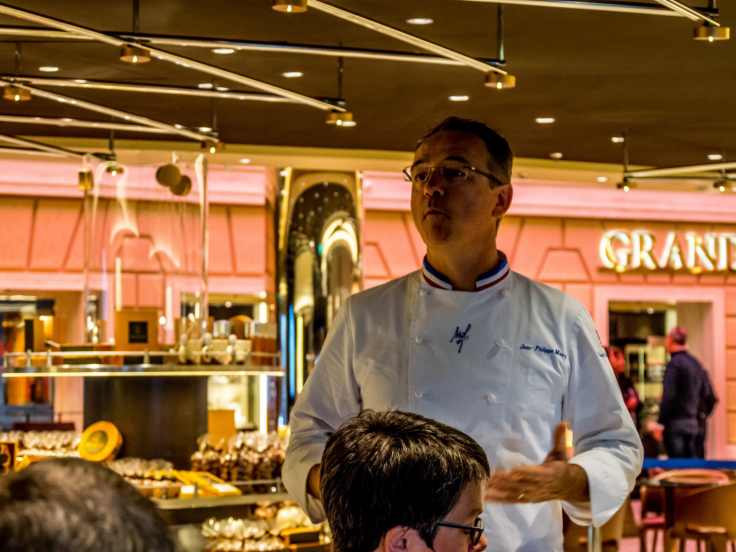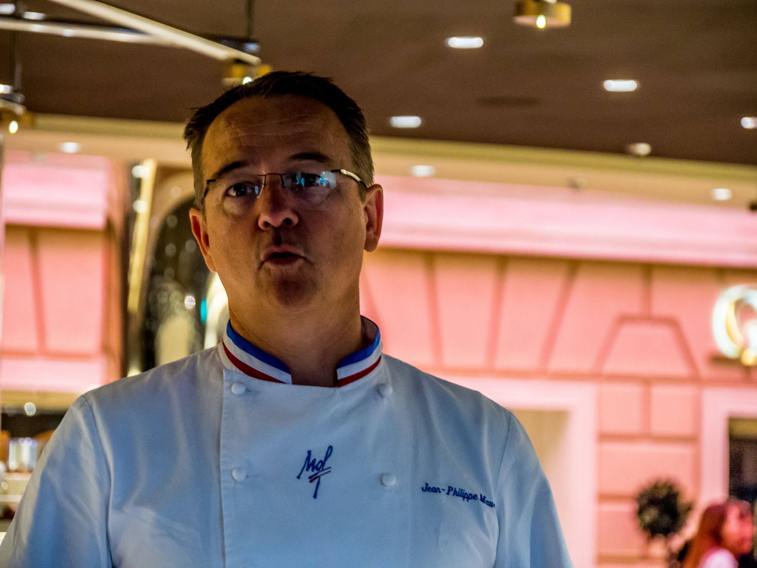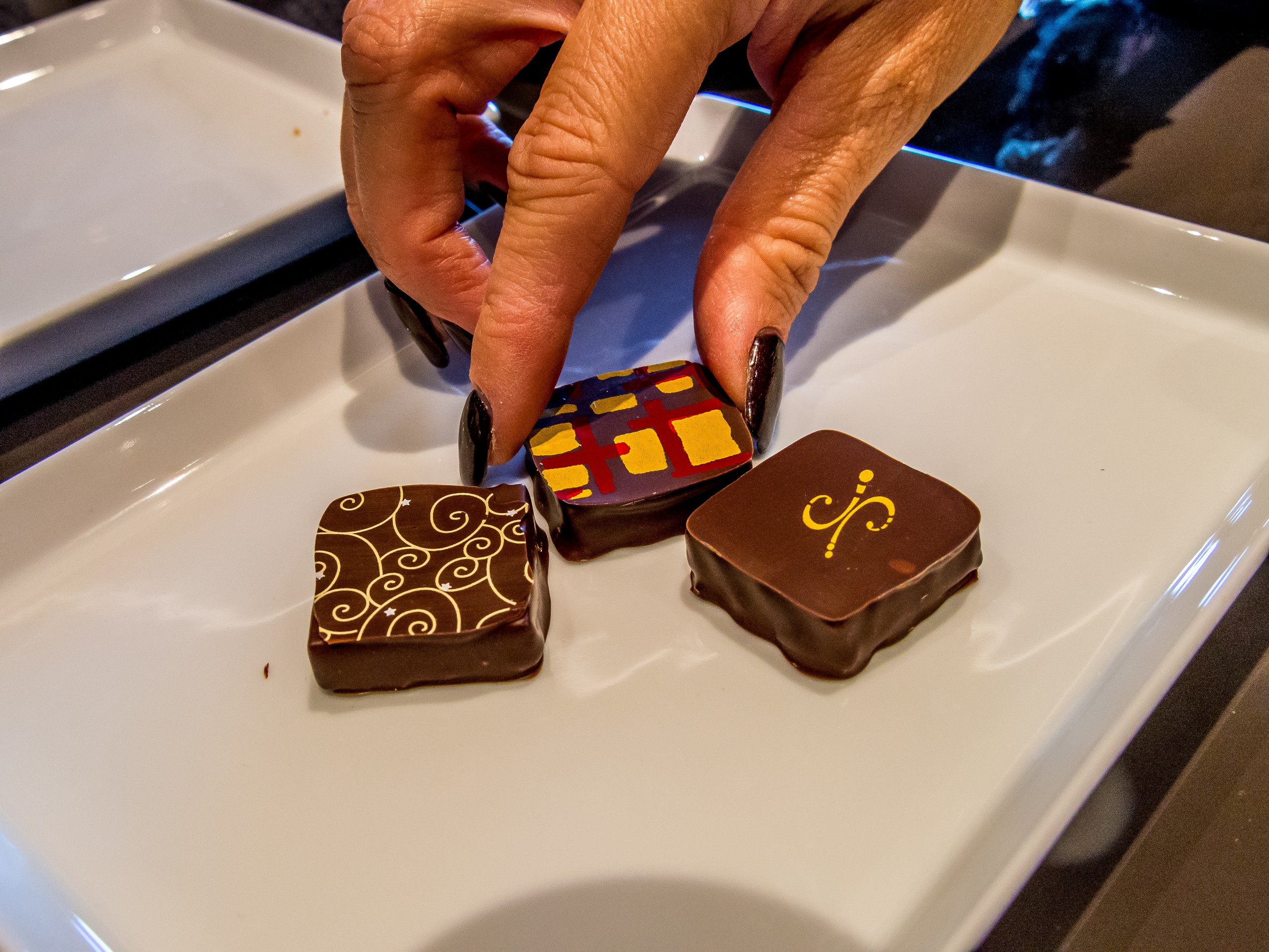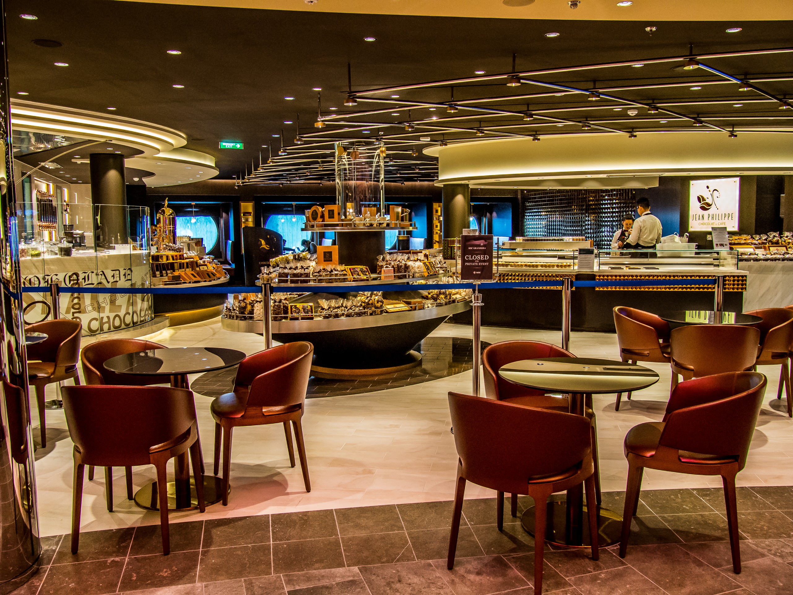 L'un des endroits les plus insolites du bateau, c'est une chocolaterie. Une vraie chocolaterie, on ne fait pas venir le chocolat déjà tout fait, on le travaille à bord et c'est le fruit d'une collaboration avec un meilleur ouvrier de France : Jean-Philippe Maury. Il est d'ailleurs à bord pour l'inauguration et présenter son concept : Chocolaterie Jean-Philippe Maury. Je suis impressionnée, c'est la première fois que j'ai un MOF devant moi ! Evidemment, on ne peut torréfier le cacao sur le bateau mais les petit palets de chocolat Valrhona sont délivrés à bords et tout ce qui est plaquette, bonbons, pralines et autres ganaches (ainsi que des macarons) sont réalisés sur le Grandiosa (on peut même voir les chocolatiers à l'oeuvre). En plus, vous pouvez même imaginer une barre avec votre type de chocolat et de toppings préférés que vous imaginez sur une tablette et quelques heures plus tard, vous êtes invté.e.s à venir la chercher et vous pourrez ramener à la maison. Le chocolatier a aussi créé une crêperie et une glacerie, presque en face de la chocolaterie.