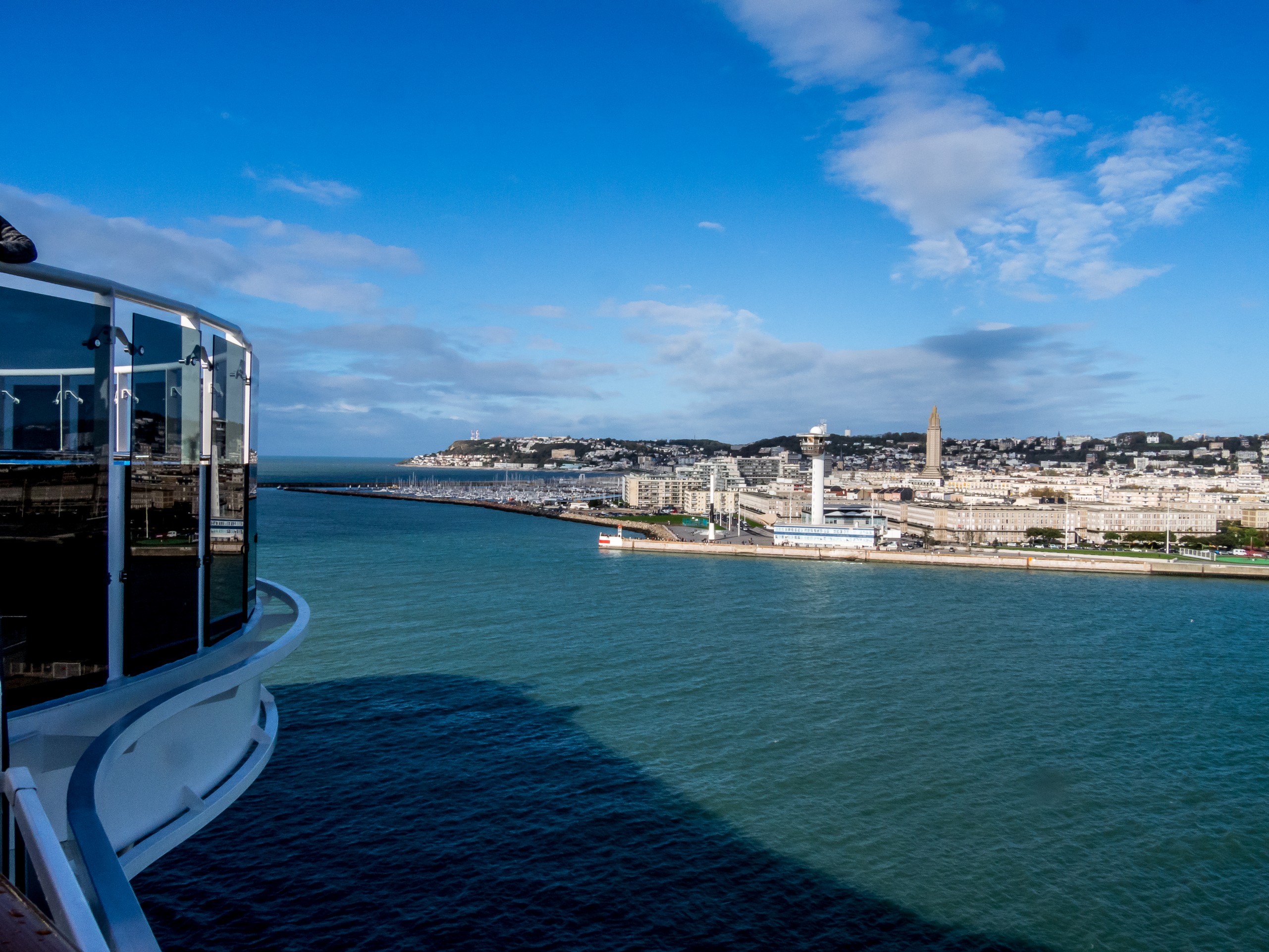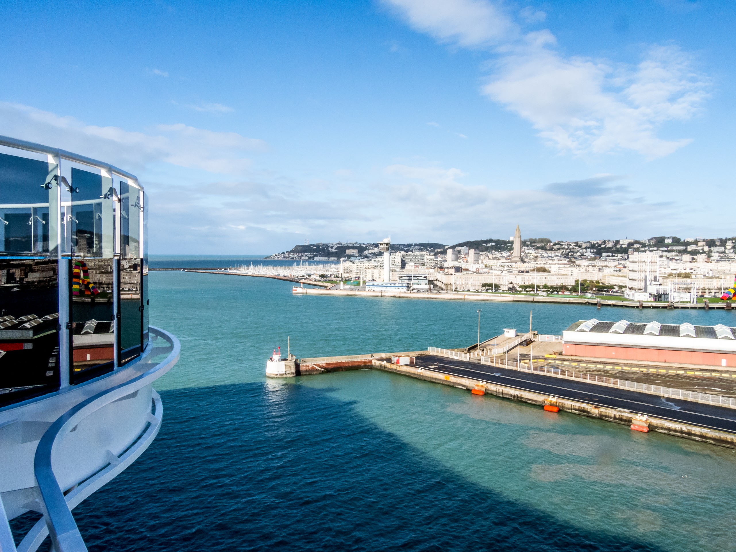 Le bus roulait depuis des heures. Dans un petit matin blême, il avait quitté le parking d'un supermarché à l'extrémité de Bruxelles pour venir chercher journalistes, agents de voyages et autres blogueurs/influenceurs et les amener vers Le Havre. Enfin nous y voilà, entre plusieurs installations portuaires, on aperçoit un géant blanc, le plus grand paquebot européen : le MSC Grandiosa de la ligne de Croisières MSC.