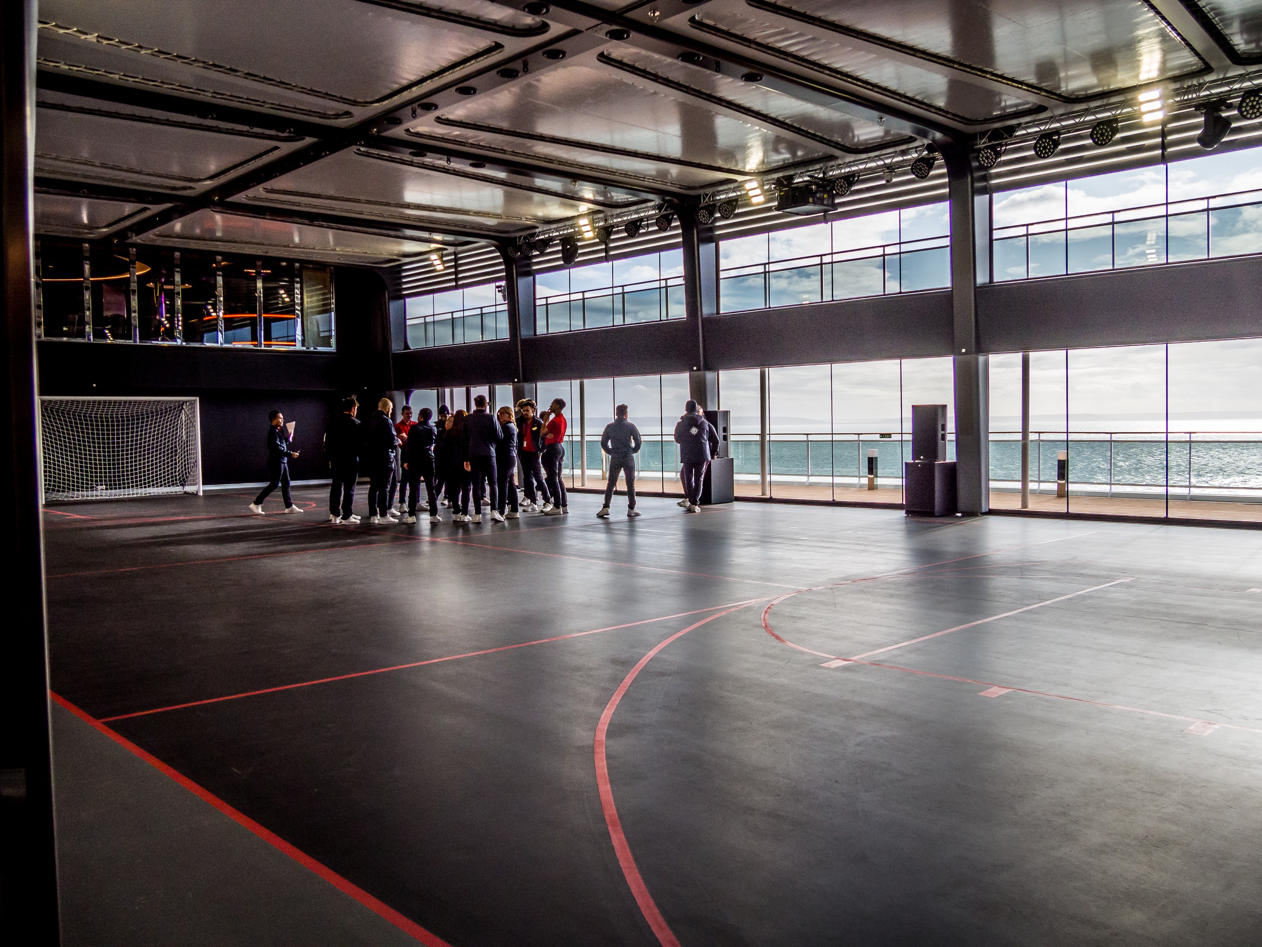 Sur les ponts supérieurs du bateau, on trouve toute une section dédiée aux sports au sens large. En plus d'un terrain pour toute sorte de sports d'équipe, on peut aussi jouer au bowling, s'amuser avec une simulation de courses de Formule 1 ou d'attaque d'aliens sur New York ou chausser un casque de réalité virtuelle et faire tout un parcours de shoot'em up et je dois dire qu'on s'est vraiment bien marrés, surtout avec la simulation d'attaque alien. Je ne vous en dirais pas plus pour ne pas gâcher l'expérience !