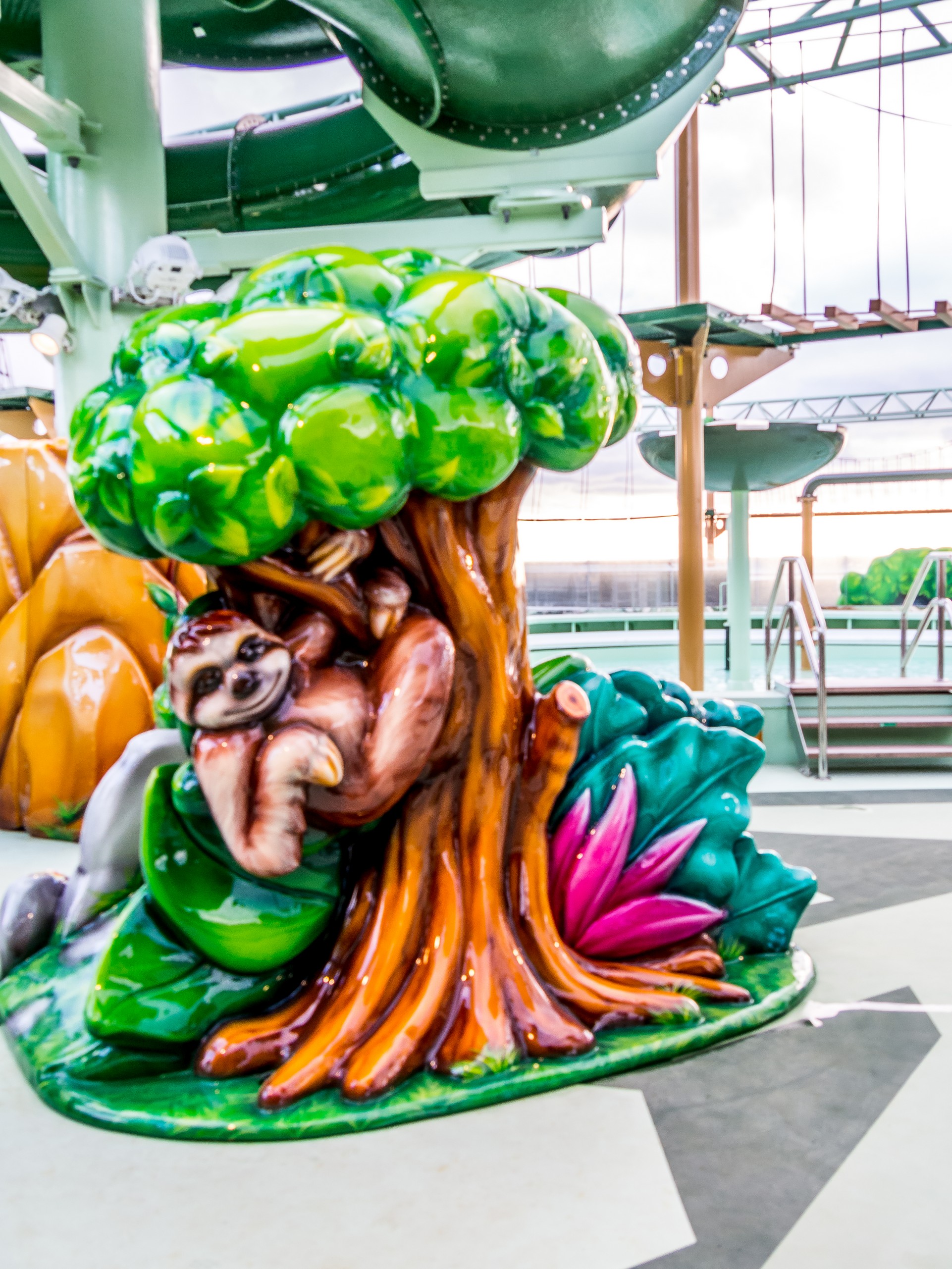 Les enfants et ados ont leurs sections sur le bateau et une des pièces de résistance qui leur est plus spécialement dédiée, c'est l'Aquapark. Avec des toboggans, des bassins, et des jeux d'eau, c'est un vrai espace à la Disneyland ici. Même les grands enfants peuvent s'en donner à coeur joie notamment avec le « sentier de l’Himalaya », un pont de singe situé à l'arrière du bateau avec une vue imprenable sur la poupe du navire et la traine du bateau. Si vous avez le vertige, ce n'est peut-être pas spécialement indiqué pour vous, par contre.