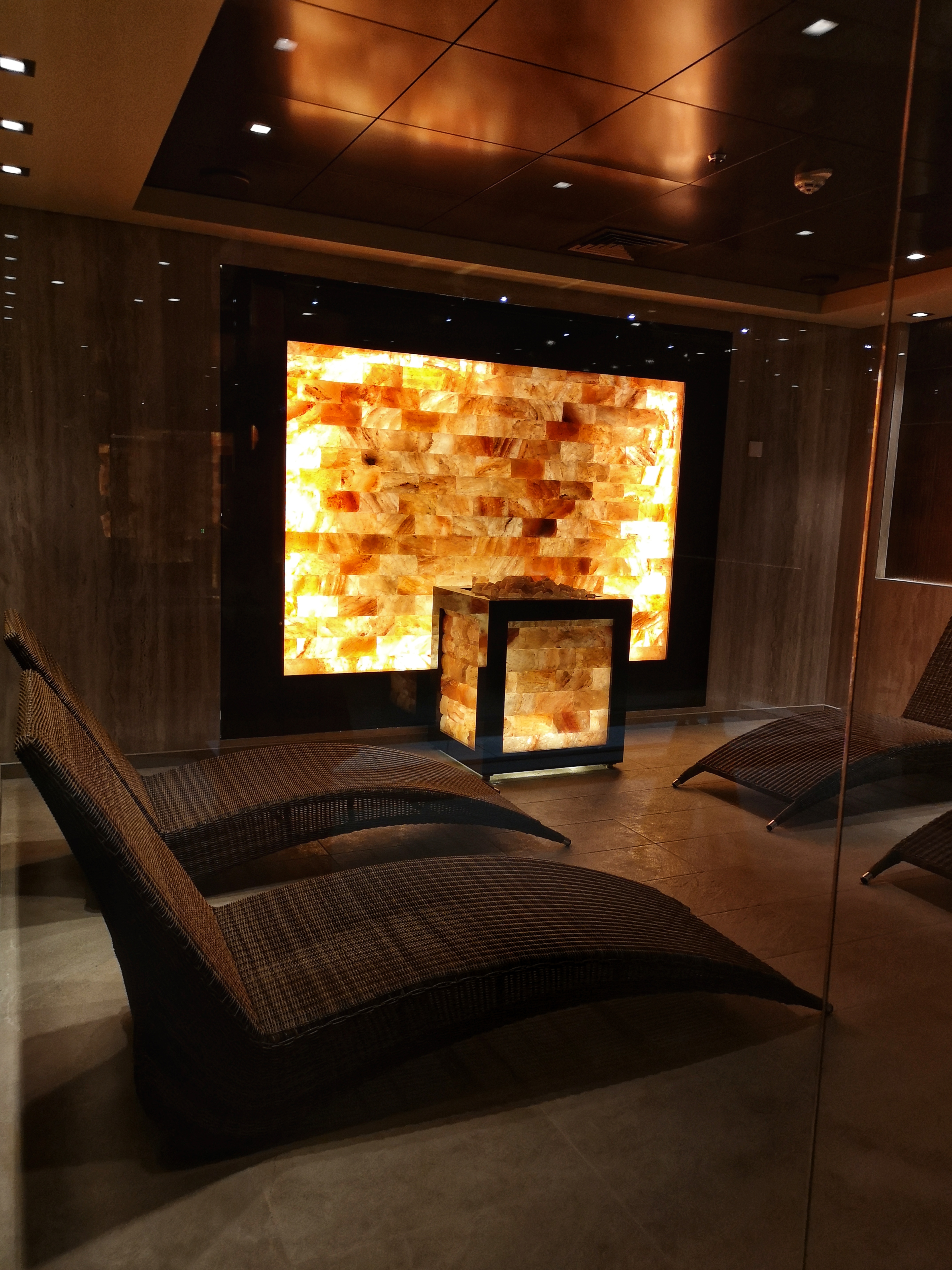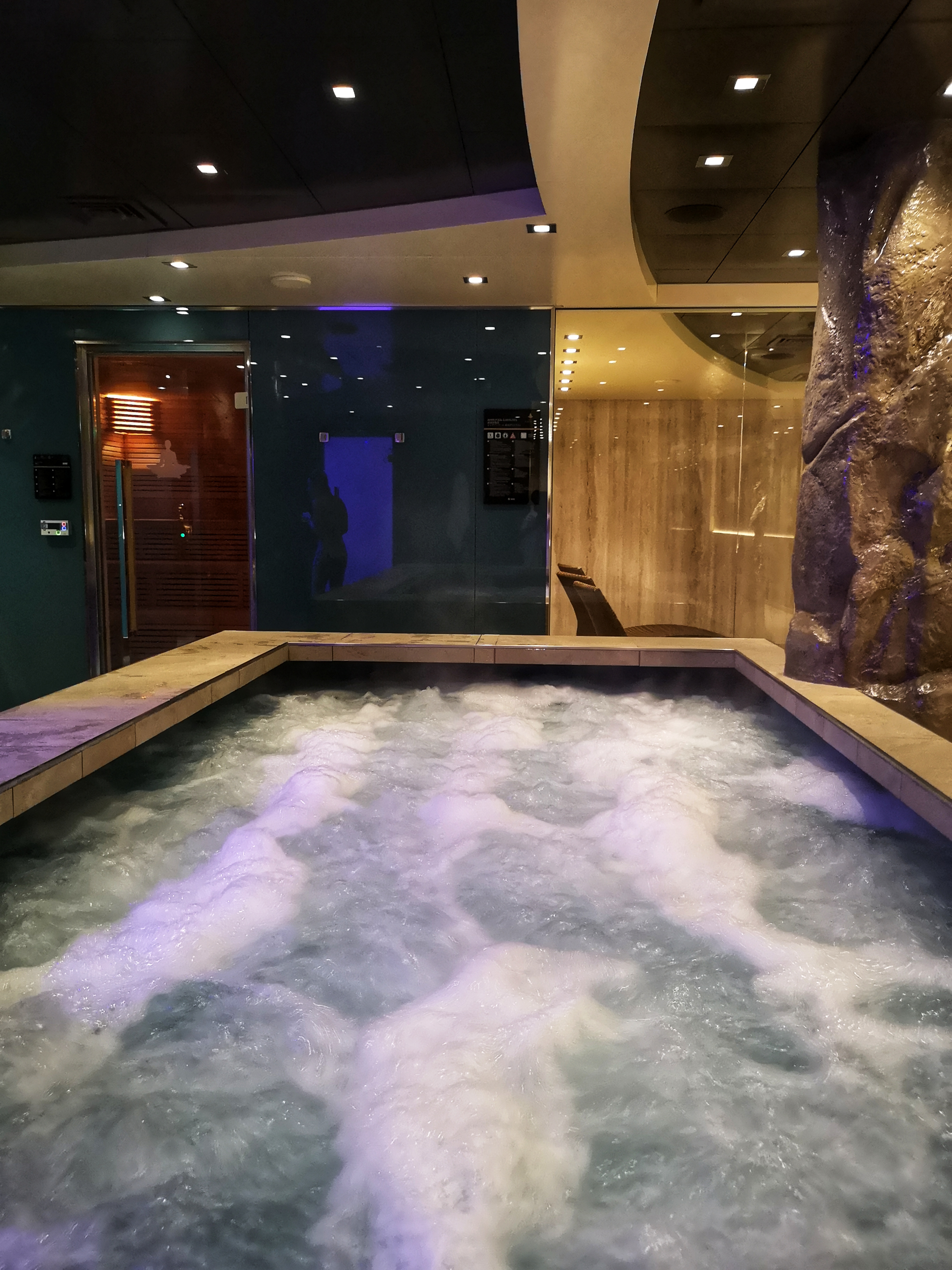 Que serait un paquebot ces jours-ci sans un grand spa ? Et au fur et à mesure que le temps passe, les spas deviennent de plus en plus sophistiqués. Il y a bien évidemment un espace pour la coiffure, les soins de beauté et les message, mais c'est dans les suites thermales qu'on voit les changement. Ce n'est plus seulement qu'un jacuzzi, un sauna, un hammam et une salle de relaxation. A l'Aurea Spa, on trouve plusieurs sortes de sauna, différents types de hammams, plusieurs salles de relaxation dont une avec un mur de sel, un bain turc, un grand jacuzzi, différentes douches sensorielles (ou on peut sélectionner son type de douche qui règle le débit, la couleur de la cabine, le parfum de l'eau et les bruits d'ambiance, ça peut sembler un gadget mais j'ai beaucoup aimé). J'étais un peu sceptique en y allant le matin, sur l'instance de Christine, pensant que j'allais être un peu « trop relaxée » pour la journée mais en fait, non ! Moi qui n'étais pas bien réveillée, je suis sortie de là détende et énergisée pour le reste de la journée.