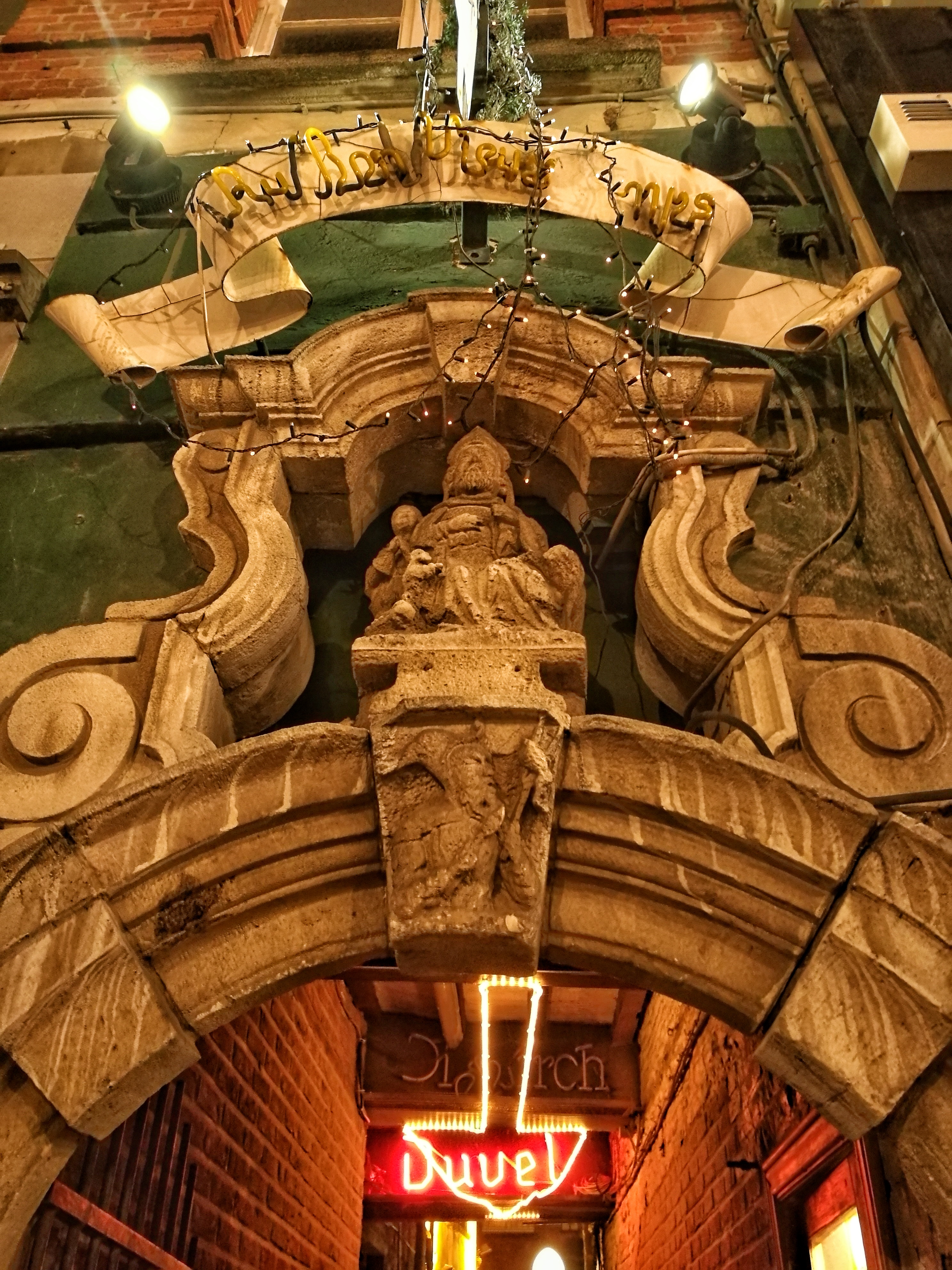 C’est encore le buste de Saint-Nicolas qui trône par-dessus la porte du Roy d’Espagne, le plus célèbre café de la Grand-Place et une cinquantaine de mètres plus loin, rue du Marché aux herbes, à l’entrée de l’Impasse Saint-Nicolas, c’est sa légende qui est illustrée en pierre : Saint-Nicolas vient de ressusciter 3 petits garçons qu’un boucher avait découpé en morceaux et placé en salaison dans les jarres (charmant).