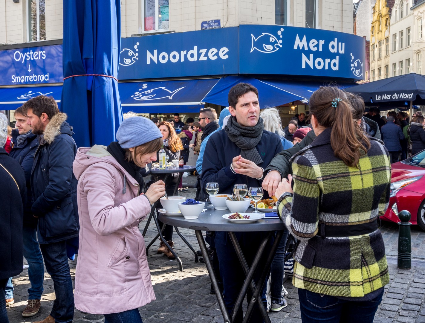 Incontournable Mer du Nord avec ses tables hautes sur les pavés de la Place Sainte-Catherine, ses désormais chaises (hautes, elles aussi, héritée du COVID), ses serveurs en marinière qui crient votre nom quand votre commande de croquette de crevettes et de poissons à la plancha est prête… C’est un incontournable bruxellois d’y manger mais Mer du Nord est plus que ça : c’est aussi une vraie poissonnerie. Juste à côté du comptoir où on passe commande, côté rue Sainte-Catherine, l’étal présente ses soles, raies, coquilles Saint-Jacques, etc. Fraîcheur et qualité absolue !