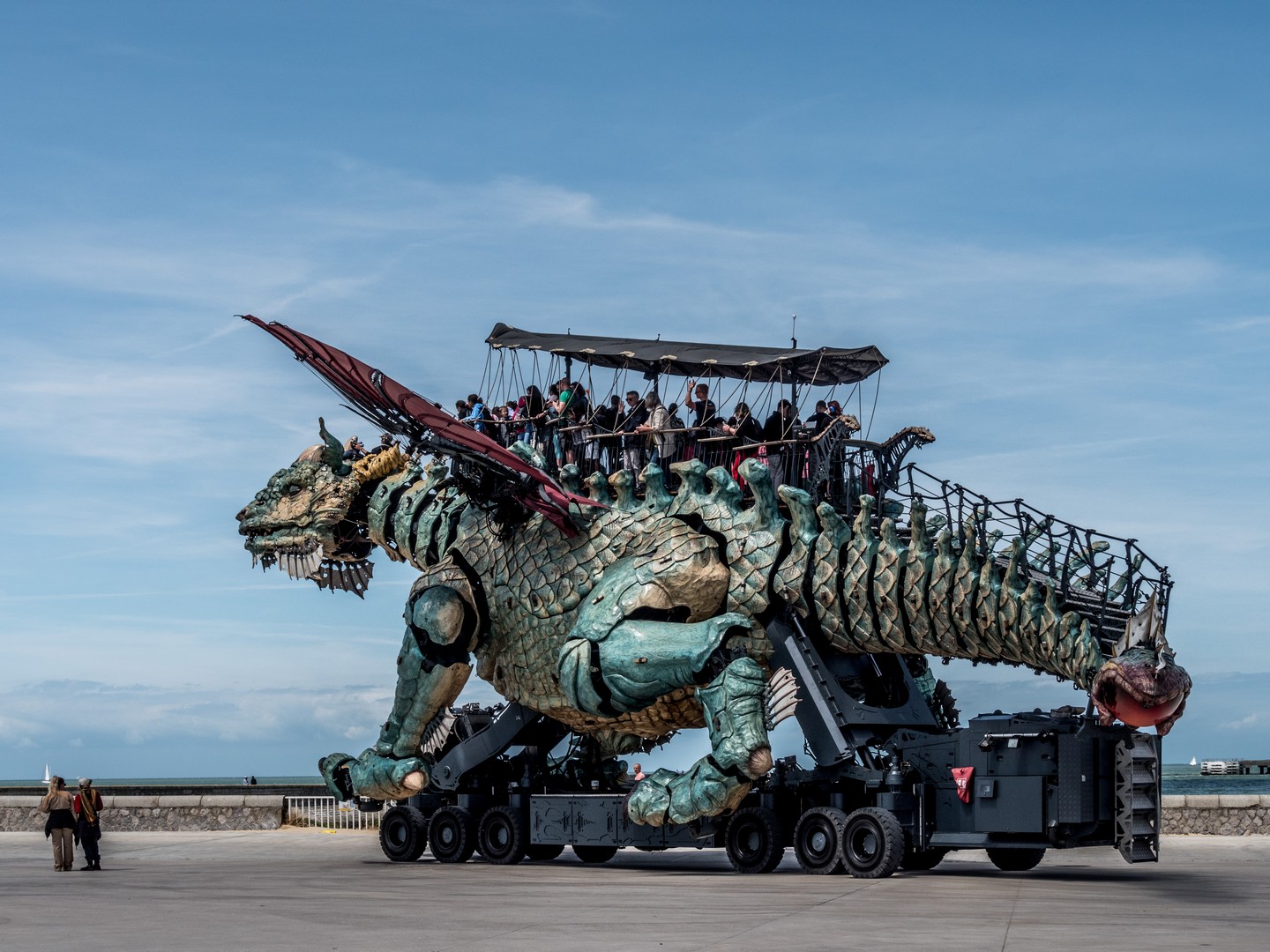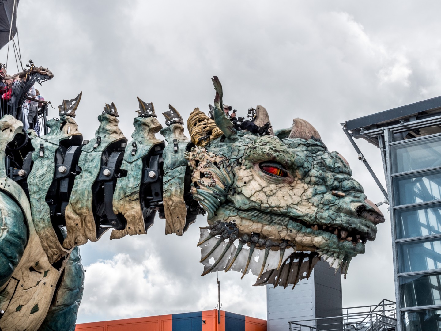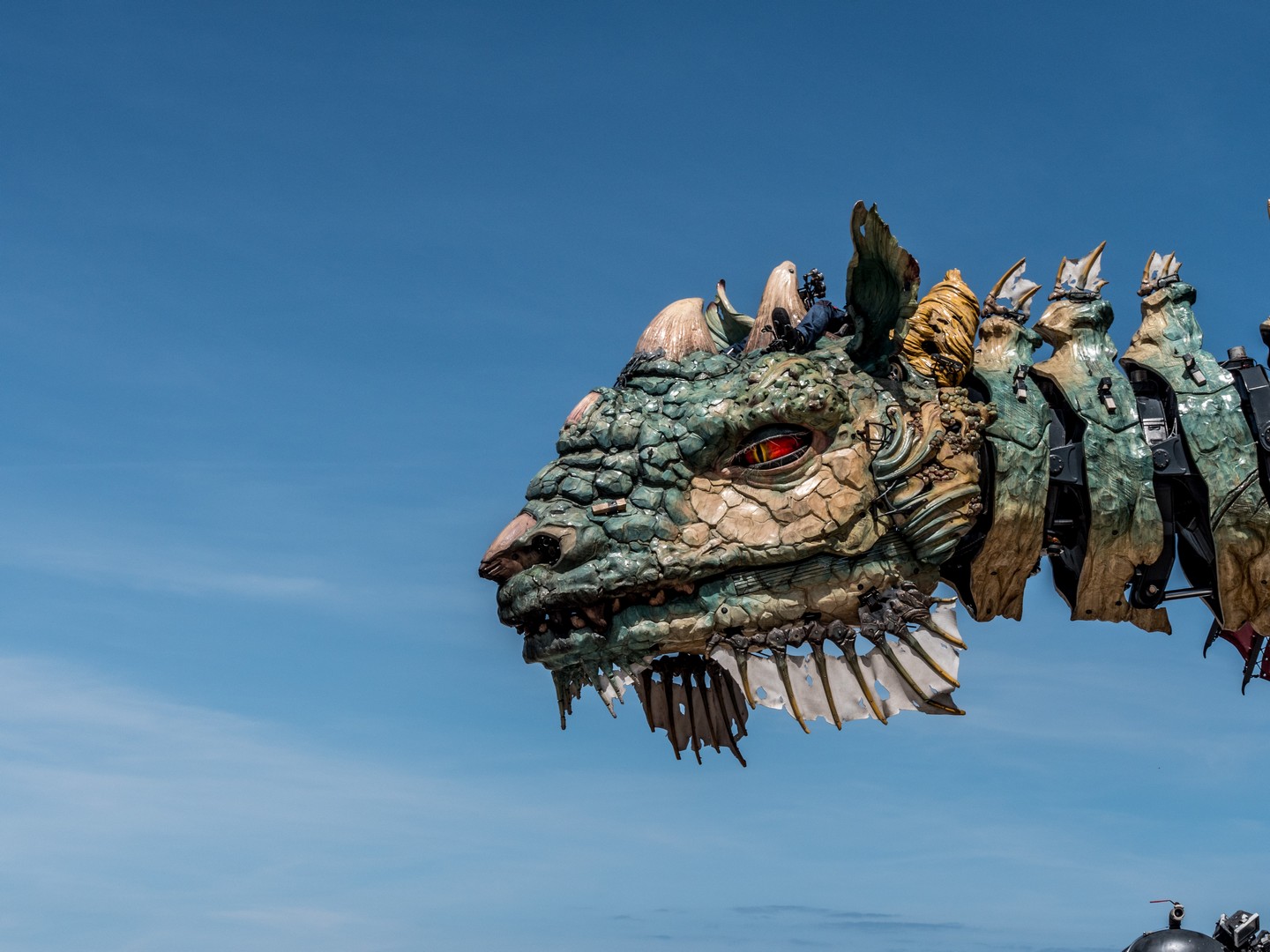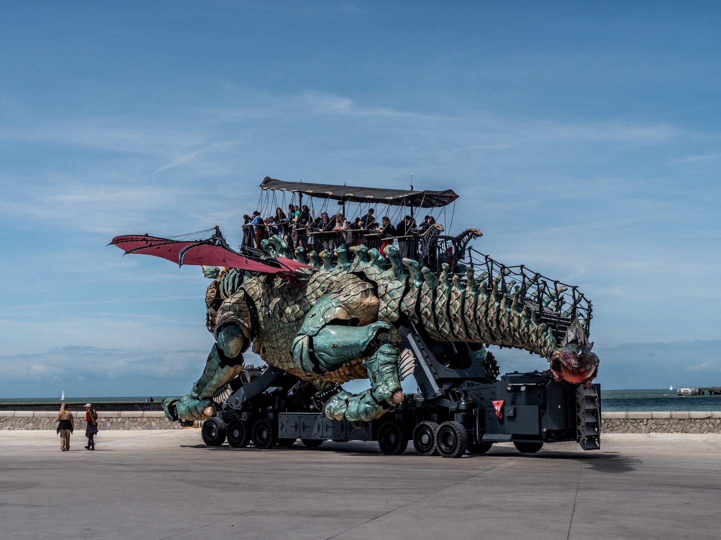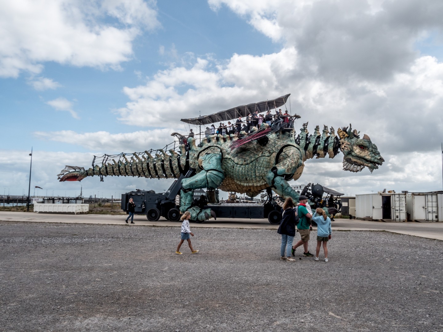 Le conte est bien joli mais évidemment, le Dragon bleu est une grande machine, née de l’imagination de François Delaroziere, l’un des cerveaux derrière les fameuses Machines de Nantes (entre autres). Et ce dragon est une vraie merveille. Aussi grand que ce que l’on imagine, sa cuirasse qui mélange du bleu, du vert et du jaune, rappelle les couleurs de la plage de Calais. Comme tout dragon qui se respecte, il crache de la fumée, du feu et même de l’eau ! En cours de visite, il déploie ses ailes pour le plus grand plaisir de tous et sa queue, qui se termine un peu comme une queue de scorpion, brille comme si une braise permanente y résidait. Mais outre la taille, ce qui est le plus impressionnant, que sont les expressions du visage du dragon. Il tourne la tête, plisse des deux et quand lorsque ses yeux se sont posés sur moi, pendant une seconde, je me sentie comme Jaime Lannister face à Drogon et un frisson a couru sur mon échine !