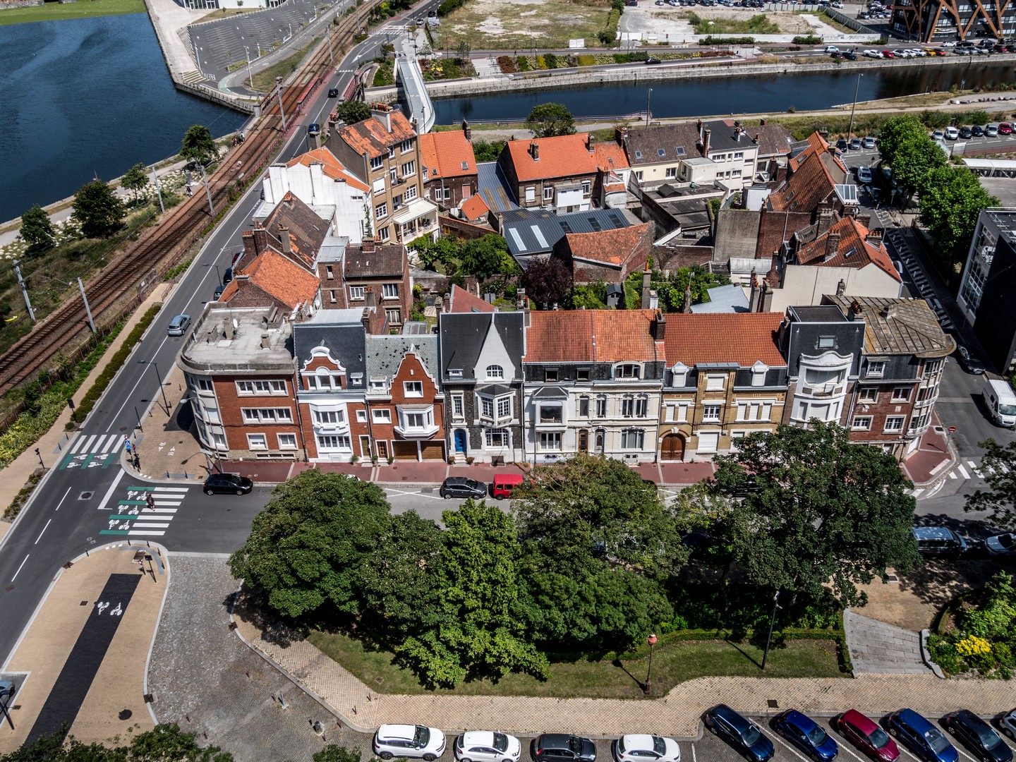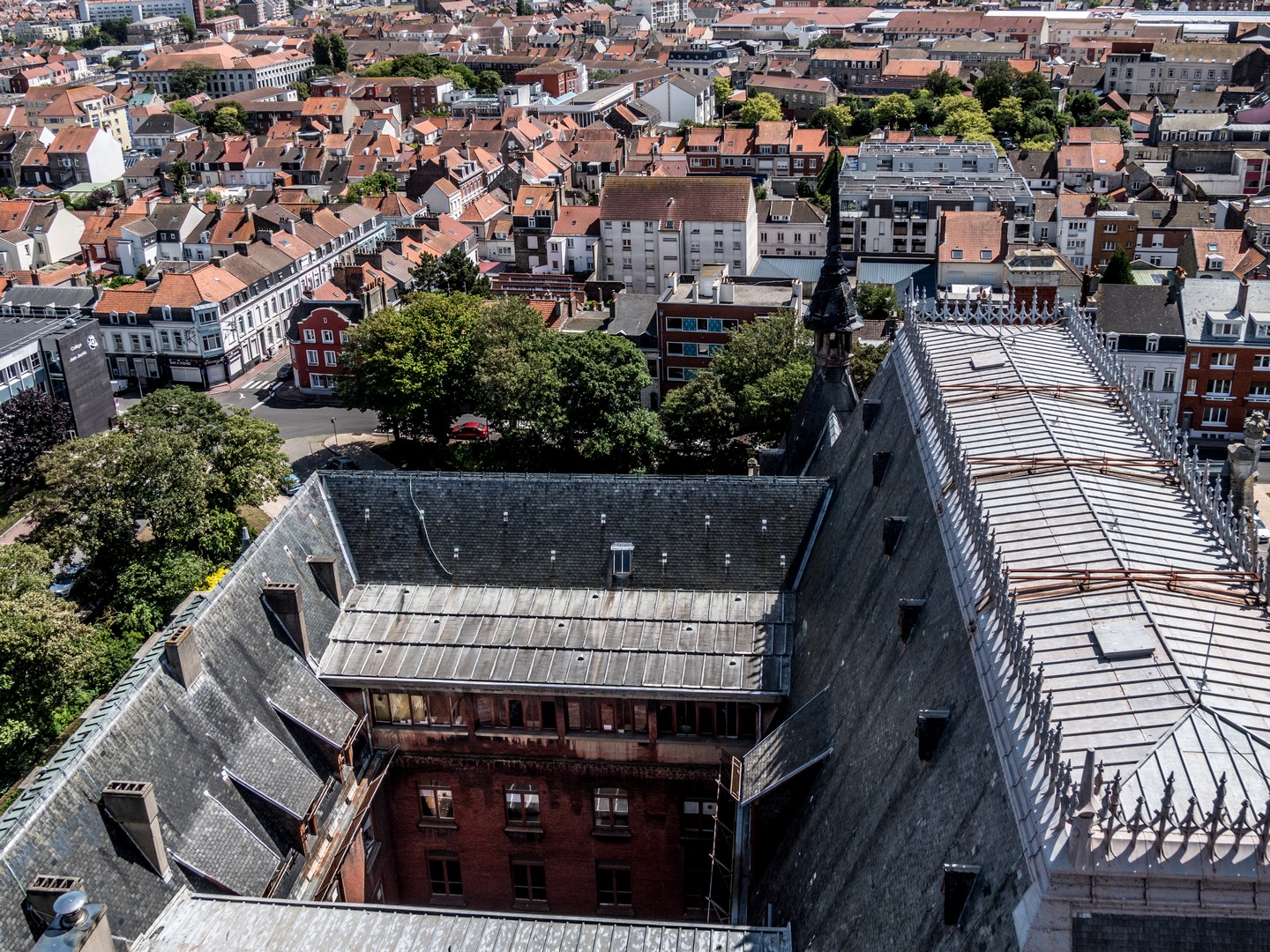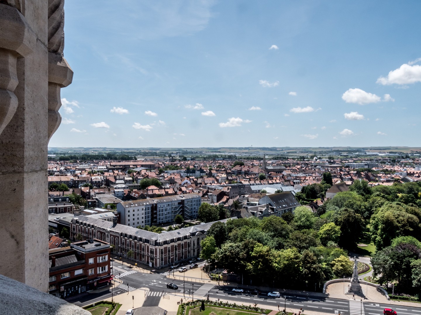 En fait, cet Hôtel de ville avait déjà été planifié depuis la fin du XIXe siècle. A cette époque, les communes de Calais et de Saint-Pierre fusionnent. Calais est une ville tournée vers la mer, pour le commerce et pour la pêche. Saint-Pierre, elle, est une commune relativement nouvelle, une ville-champignon qui a grandi autour des manufactures de dentelle, avec une population largement ouvrière. Bien que Saint-Pierre compte plus d’habitants que Calais, la nouvelle ville portera le nom de Calais mais l’union de ses deux communes est rappelée sur une cartouche au-dessus de la porte de l’Hôtel de ville, avec un C et S-P unis dans le même blason. Vu depuis notre nid d’aigle, on voit bien la « séparation » entre les deux communes originales. Presqu’au pied du beffroi, on aperçoit une rue avec une rangée de maison qui ont survécu à la guerre, ça peut donner une idée du Calais d’antan.