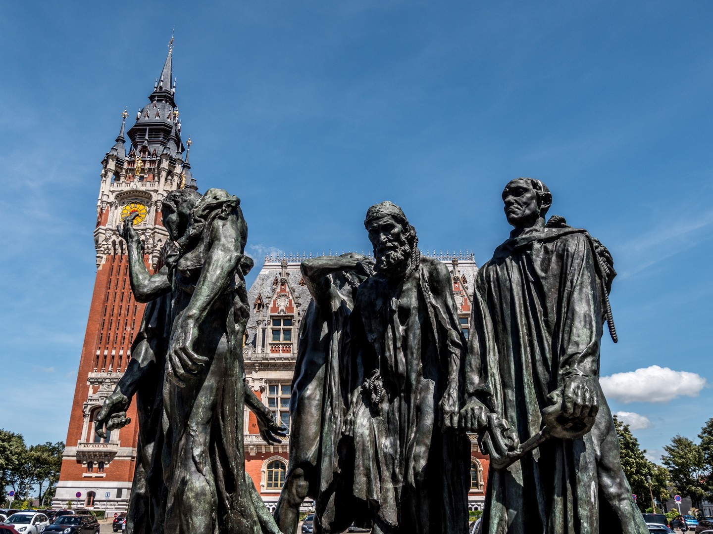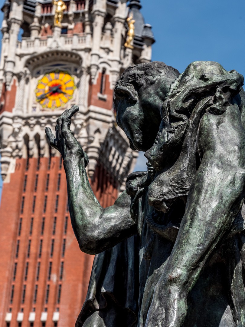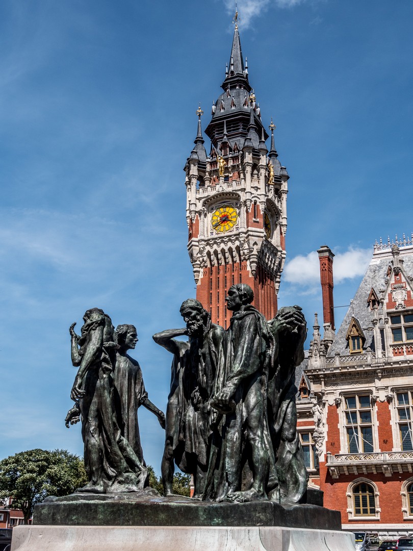 Enfin, avant de quitter la ville, nous allons saluer le plus bel ornement de l’Hôtel de ville : le groupe de statues en bronze des Bourgeois de Calais par Auguste Rodin.