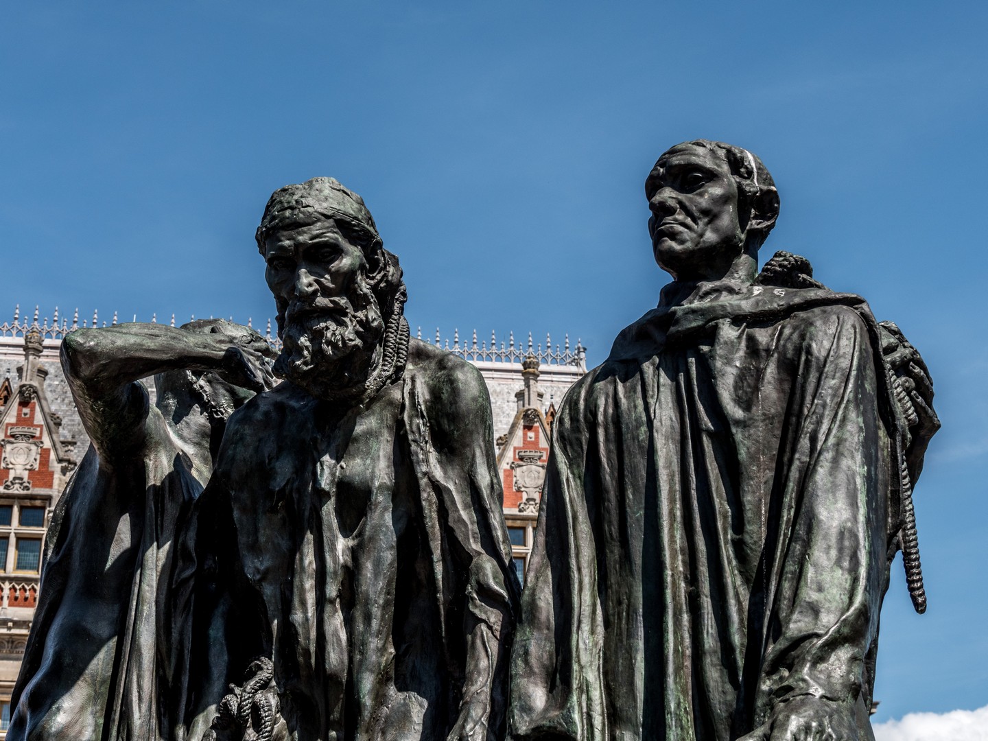 En 1347, les Anglais assiège Calais. La situation devenant intenable, les habitants pressent le gouverneur, Jean de Vienne, de traiter avec le roi d’Angleterre Edouard III. Il propose une reddition de la ville, en échange de la vie sauve pour les Calaisiens. En retour, le roi exige que six bourgeois se présentent à lui, en chemise, pieds nus, et la corde au cou pour lui présenter les clés de la ville. Ce qui fut fait. Les six bourgeois se présentèrent devant le roi et c’est la scène de ces 6 hommes, en route vers l’humiliation et l’échafaud, que Rodin a représenté. Chacun avec sa posture et son état d’esprit. L’un est résigné, l’autre à peur, un autre se tient fier… C’est très expressif et puissant. Ces six bourgeois auront la vie sauve grâce à Philippa de Hainaut, l’épouse d’Edouard, qui se jetât en pleurs aux pieds de son mari pour demander leur pardon. Calais restera anglaise pendant 2 siècle après ça.