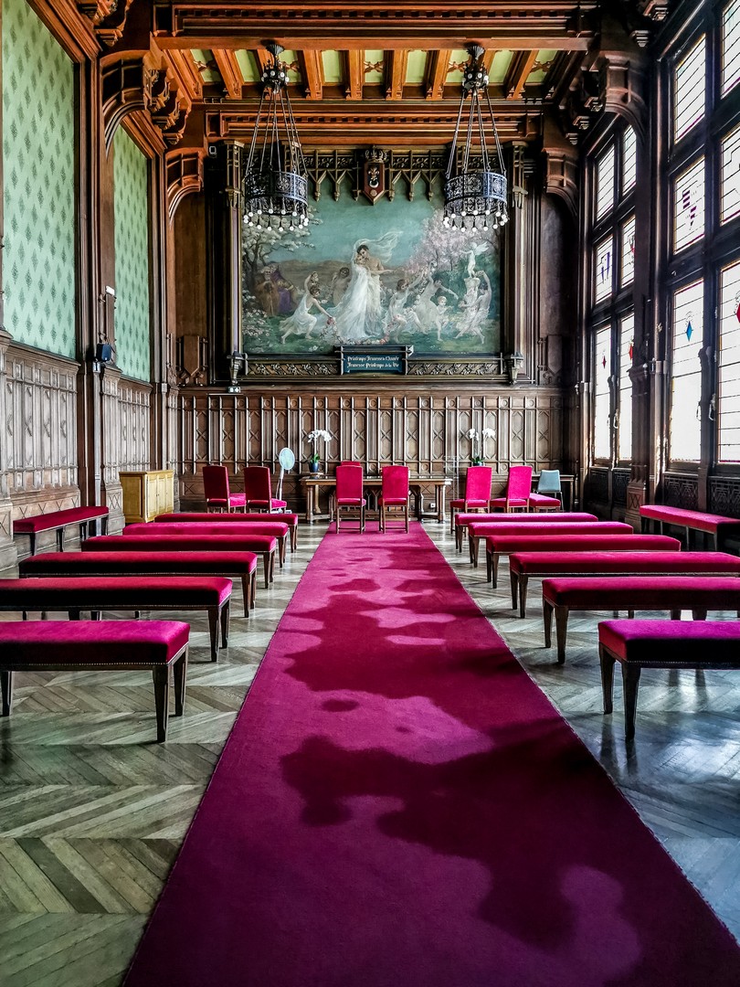 A l’intérieur, le hall d’honneur est recouvert d’une très jolie verrière. En montant les escaliers, on peut en profiter pour admirer de très beaux vitraux qui reprennent des épisodes importants de l’histoire de Calais. A l’étage, les salles semblent sortir d’un conte de fée avec des poutres en bois, des plafonds travaillés, de profondes cheminées… Un vrai décor de film !