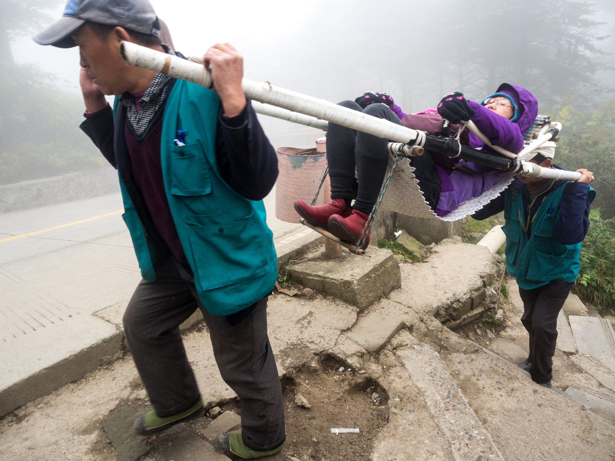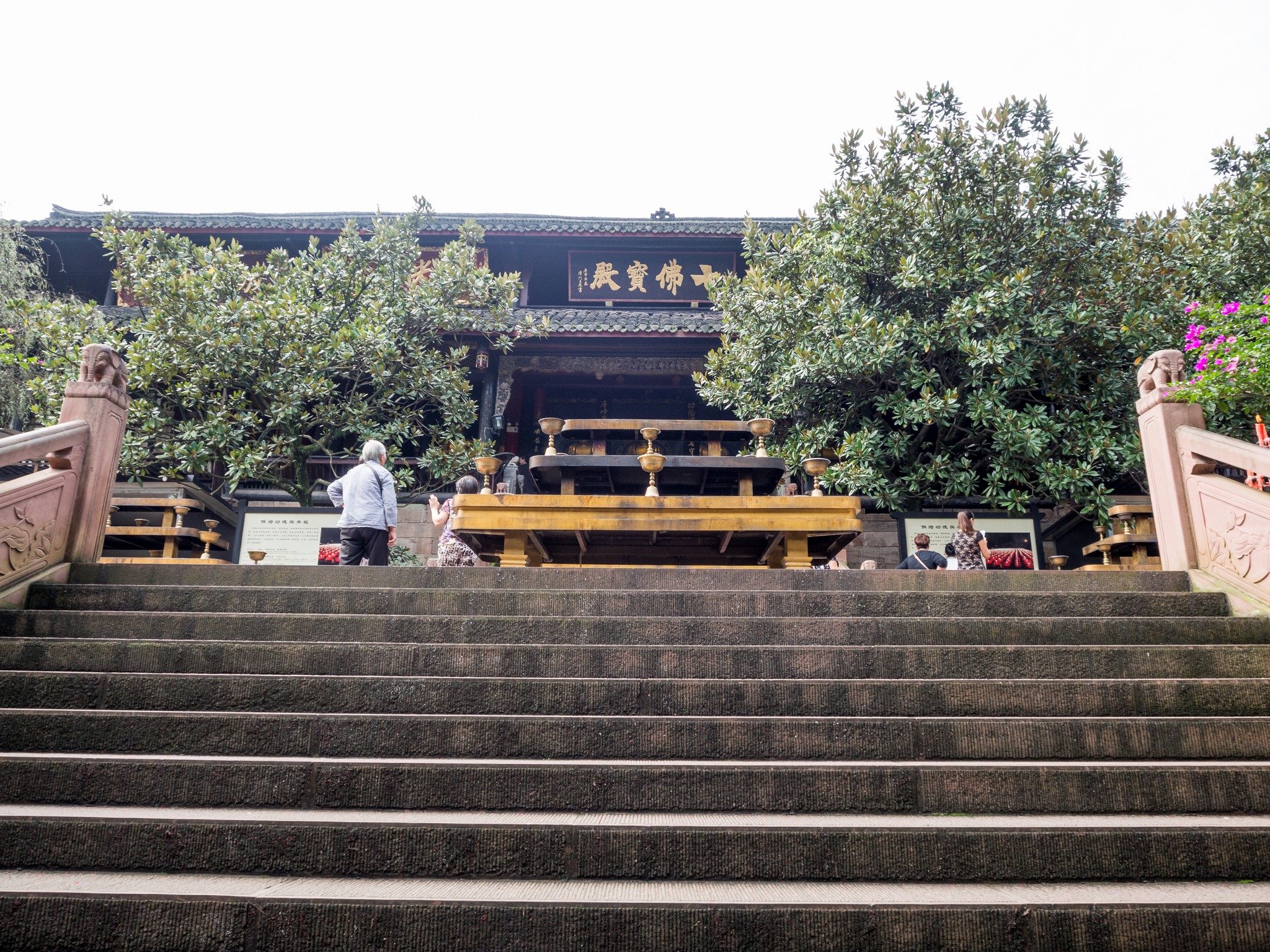 Le lendemain, nous prenons le chemin du sommet d’Emeishan. On peut y accéder de différentes manières : en bus, avant d’emprunter de grands escaliers et un téléphérique ou… à pied (la plupart optent plutôt pour la descente à pied, puisque le chemin vers le sommet est assez ardu). La beauté du Sommet Doré du Mont Emei est chantée à travers toute la Chine et le meilleur moment pour y être est peu avant le lever du soleil pour avoir une chance d’admirer le spectacle (et avec un peu de chance, la « mer de nuages » fera son apparition. Pas de chance pour nous, les prévisions météo ne sont pas au top, nous irons donc là-haut en matinée. Attention, partez avec polaires et manteau car même en été, il ne fait pas vraiment pas chaud là-haut !