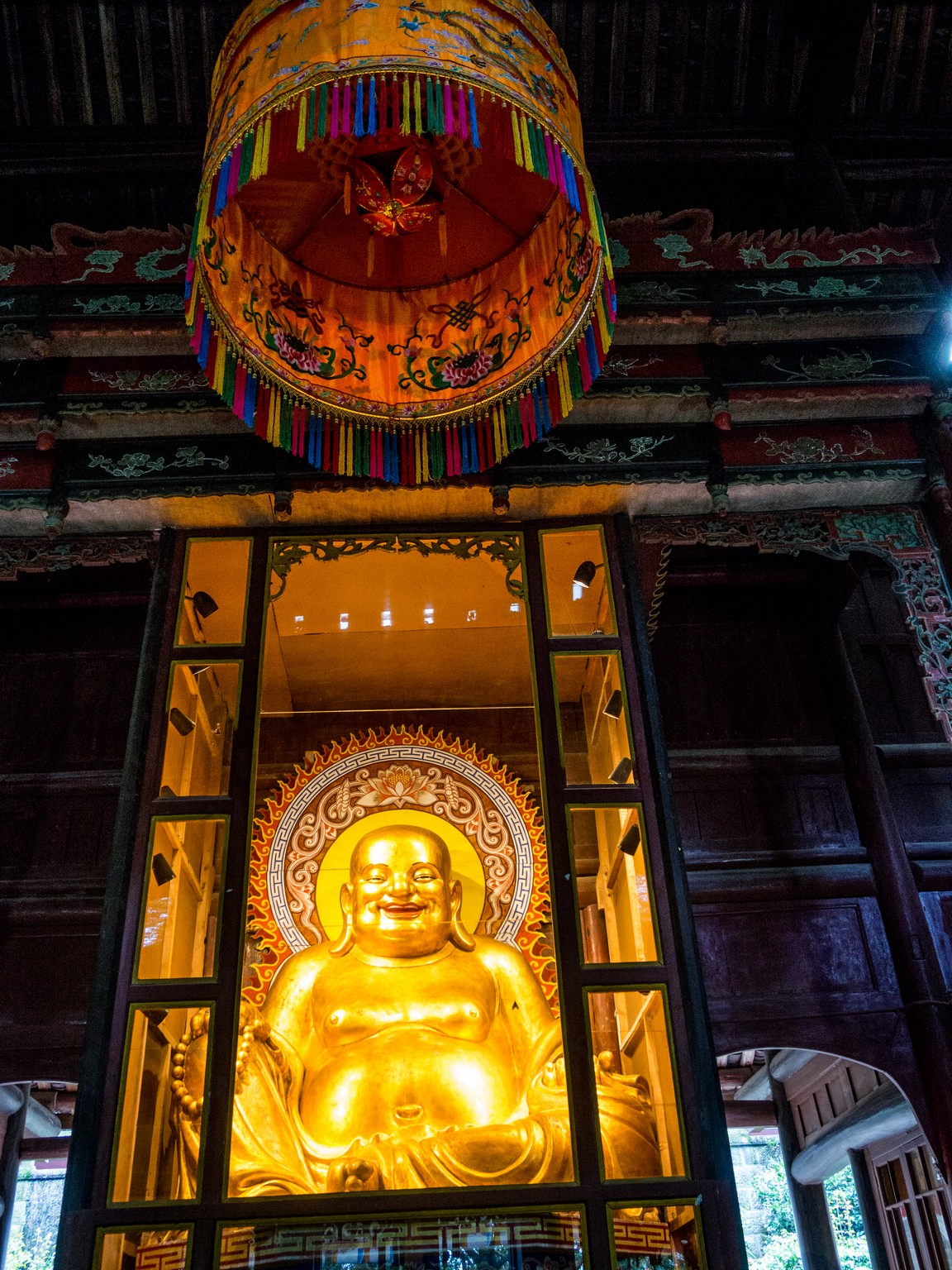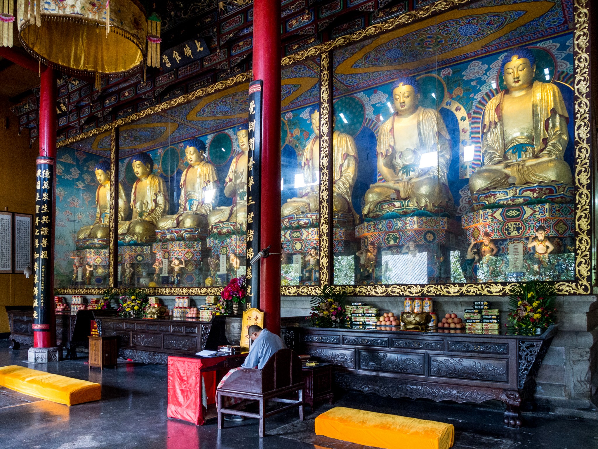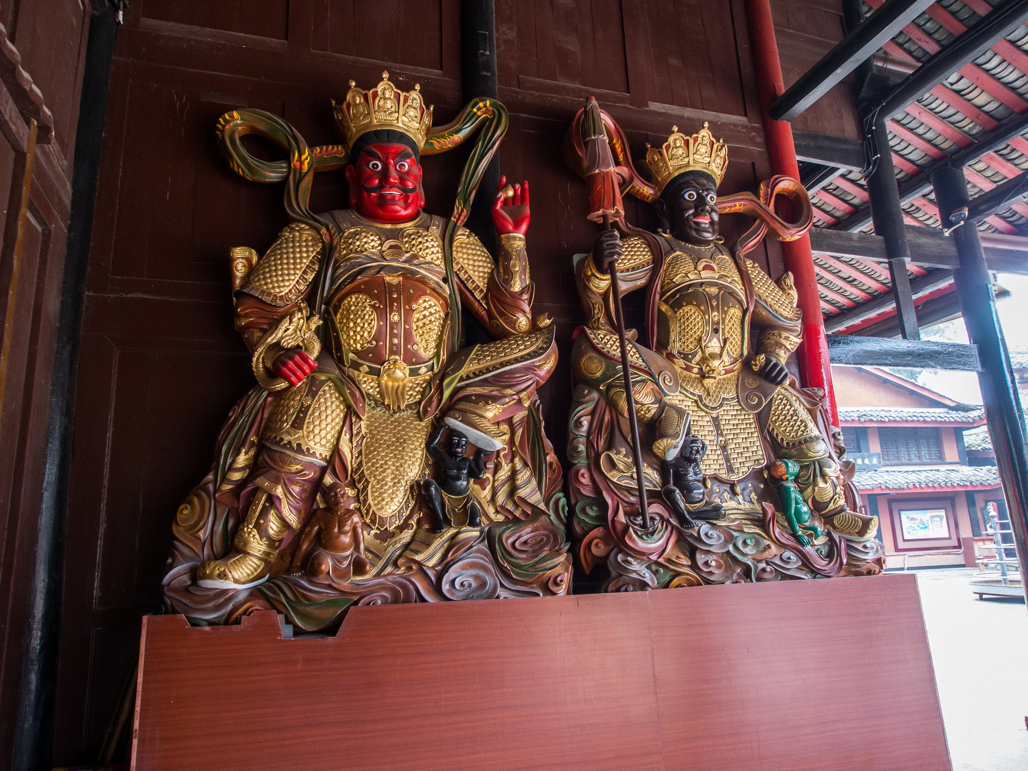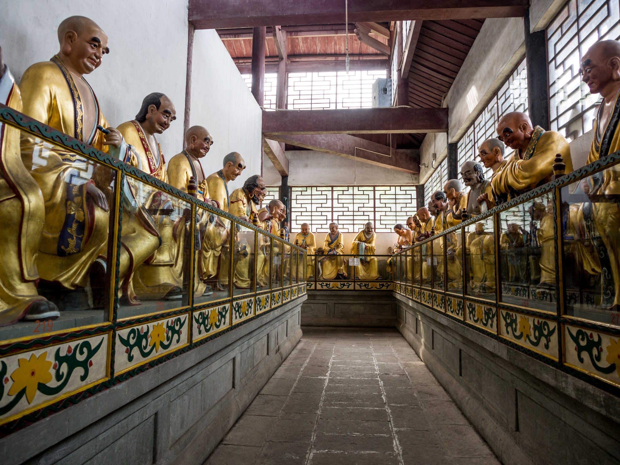 Ses pavillons en tuiles lui donnent un côté vraiment charmant et il est largement délaissé par les autres touristes (ce qui est étonnant, puisque c’est le plus grand temple du complexe). Depuis ses terrasses, on peut admirer ses toits et la montagne qui donne son nom au temple et qui ressemble à un tigre au repos. Il est encore plus calme et serein que Baoguo mais compte moins d’objets d’art. Par contre, ses jardins sont remplis de papillons énormes tous plus beaux les uns que les autres. On y trouve une très belle pagode de cuivre couvertes de bas-reliefs et d’inscriptions bouddhiques mais aussi un pavillon impressionnant qui ne compte pas moins de 500 « arhats », des méritants et des disciples du Bouddha à un état avancé sur le chemin du nirvana. Les statues sont à taille réelle et sont toutes différentes les unes des autres, chacun des arhats avec une attitude, une expression et des attributs bien à eux.