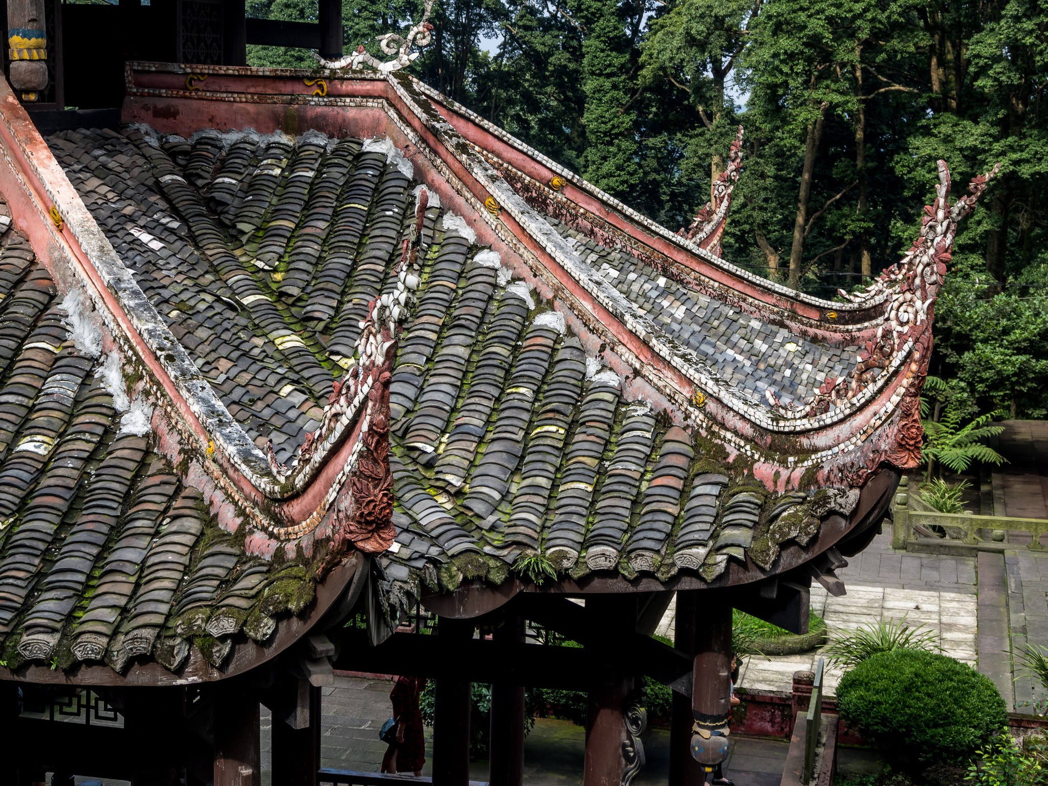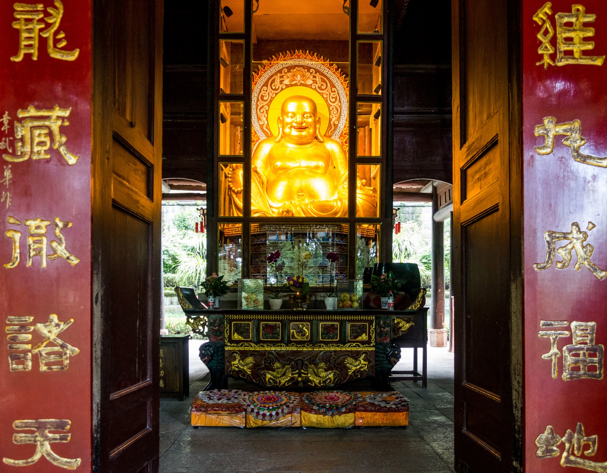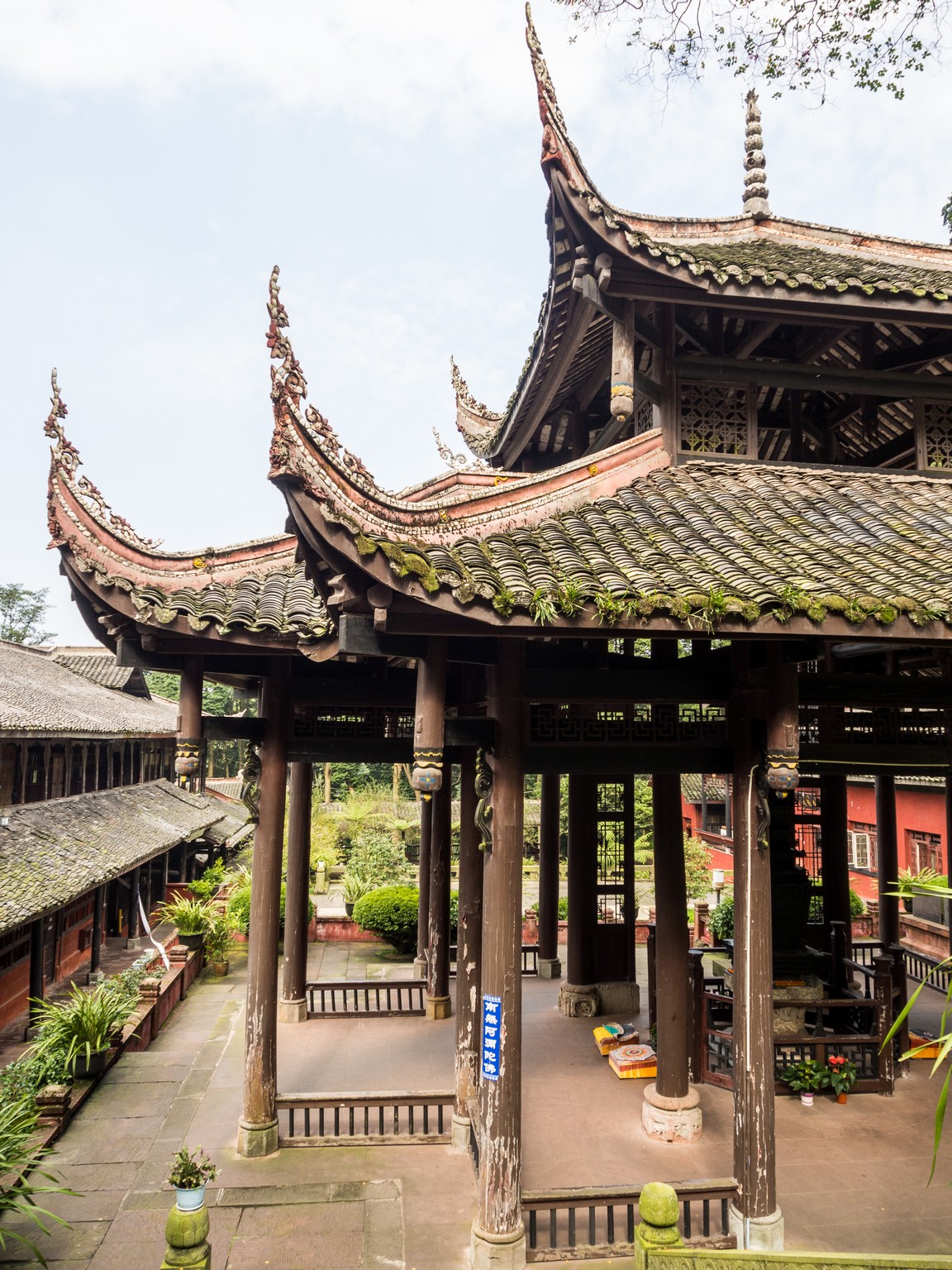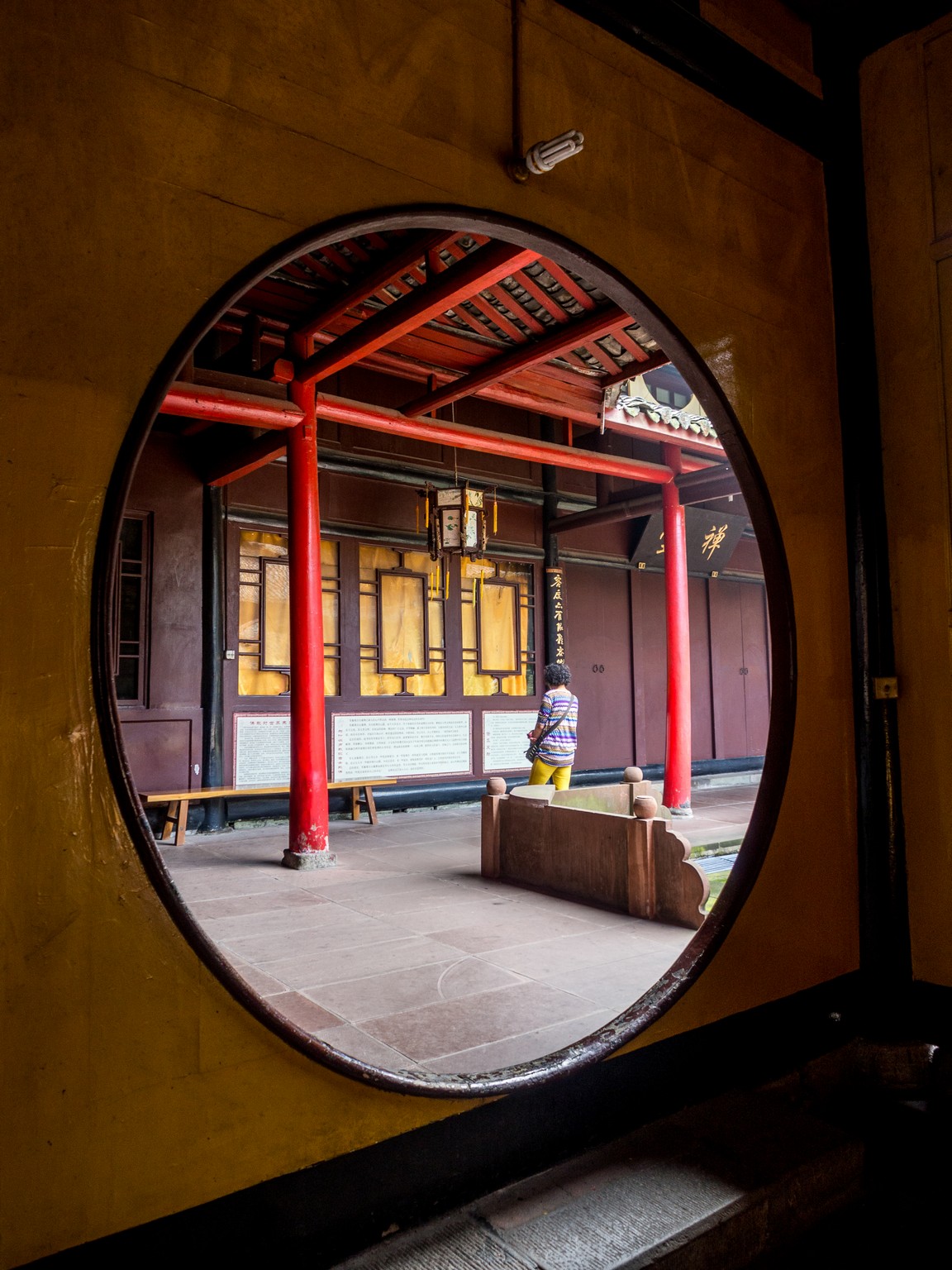Ses pavillons en tuiles lui donnent un côté vraiment charmant et il est largement délaissé par les autres touristes (ce qui est étonnant, puisque c’est le plus grand temple du complexe). Depuis ses terrasses, on peut admirer ses toits et la montagne qui donne son nom au temple et qui ressemble à un tigre au repos. Il est encore plus calme et serein que Baoguo mais compte moins d’objets d’art. Par contre, ses jardins sont remplis de papillons énormes tous plus beaux les uns que les autres. On y trouve une très belle pagode de cuivre couvertes de bas-reliefs et d’inscriptions bouddhiques mais aussi un pavillon impressionnant qui ne compte pas moins de 500 « arhats », des méritants et des disciples du Bouddha à un état avancé sur le chemin du nirvana. Les statues sont à taille réelle et sont toutes différentes les unes des autres, chacun des arhats avec une attitude, une expression et des attributs bien à eux.