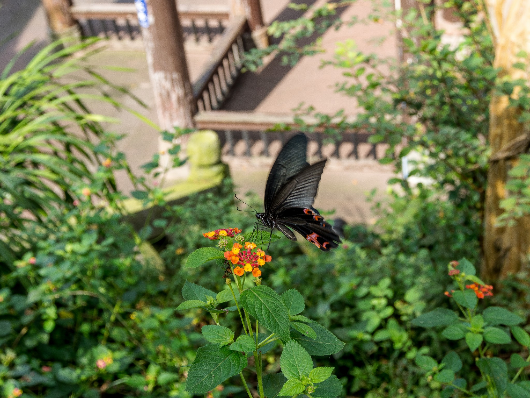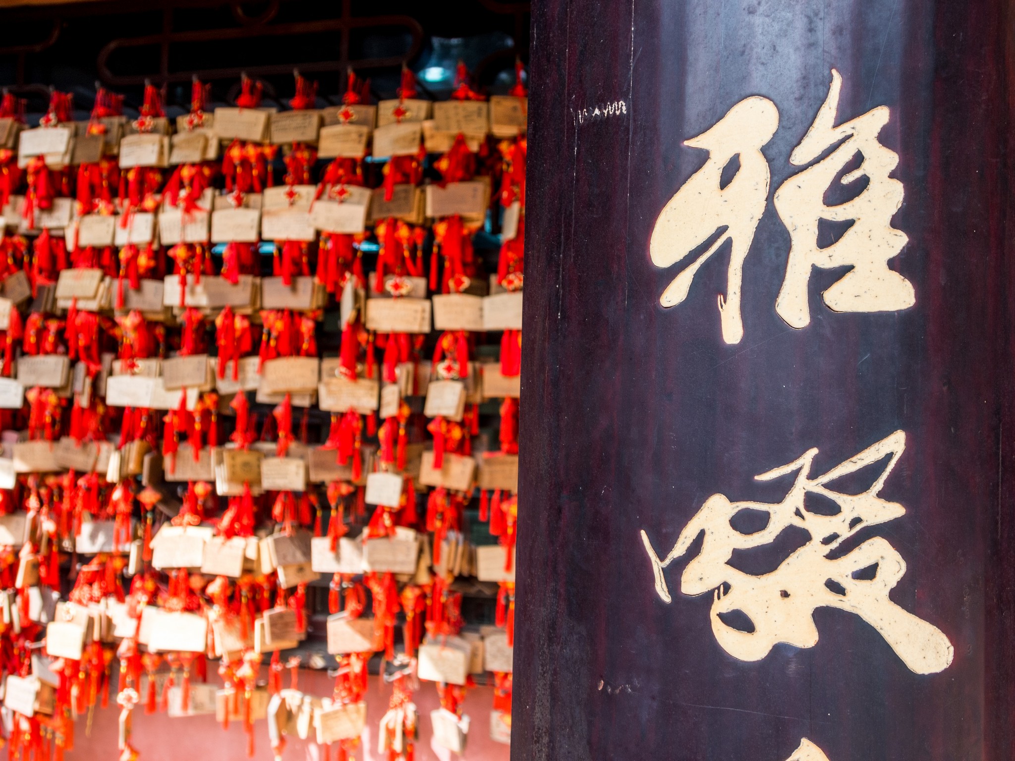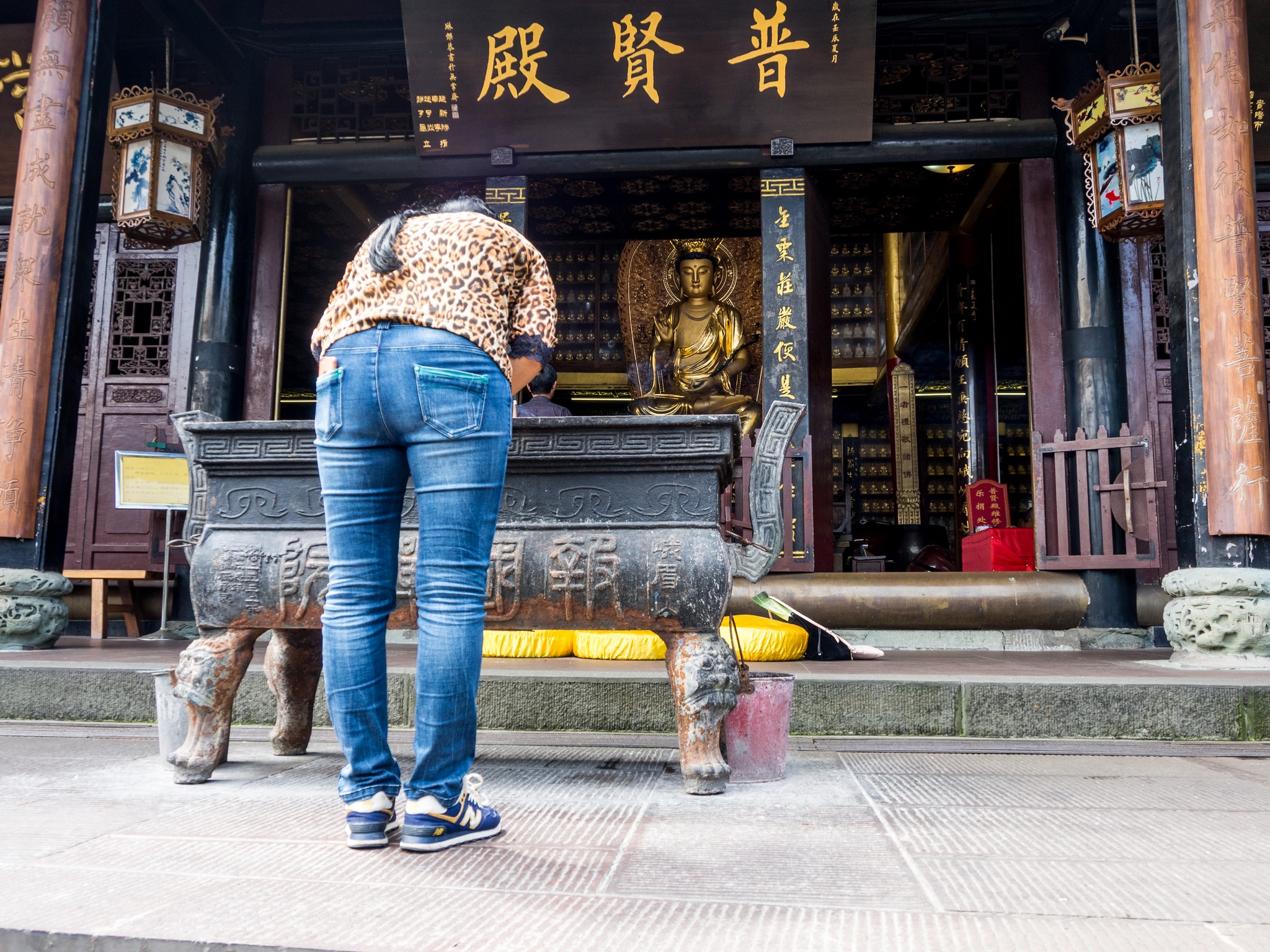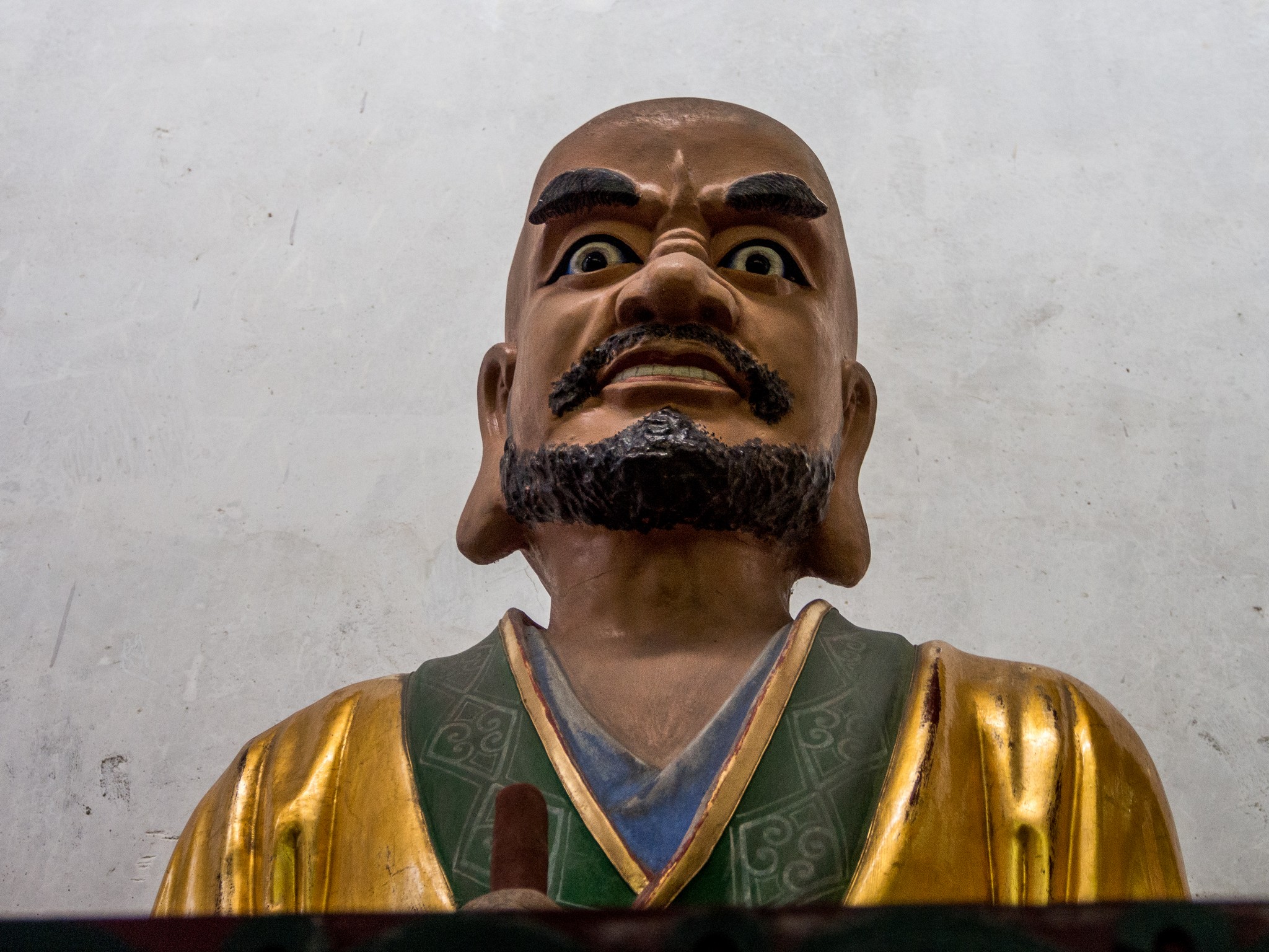 Ses pavillons en tuiles lui donnent un côté vraiment charmant et il est largement délaissé par les autres touristes (ce qui est étonnant, puisque c’est le plus grand temple du complexe). Depuis ses terrasses, on peut admirer ses toits et la montagne qui donne son nom au temple et qui ressemble à un tigre au repos. Il est encore plus calme et serein que Baoguo mais compte moins d’objets d’art. Par contre, ses jardins sont remplis de papillons énormes tous plus beaux les uns que les autres. On y trouve une très belle pagode de cuivre couvertes de bas-reliefs et d’inscriptions bouddhiques mais aussi un pavillon impressionnant qui ne compte pas moins de 500 « arhats », des méritants et des disciples du Bouddha à un état avancé sur le chemin du nirvana. Les statues sont à taille réelle et sont toutes différentes les unes des autres, chacun des arhats avec une attitude, une expression et des attributs bien à eux.