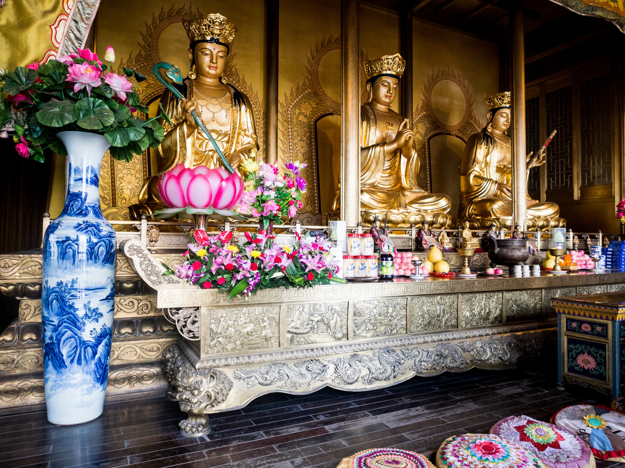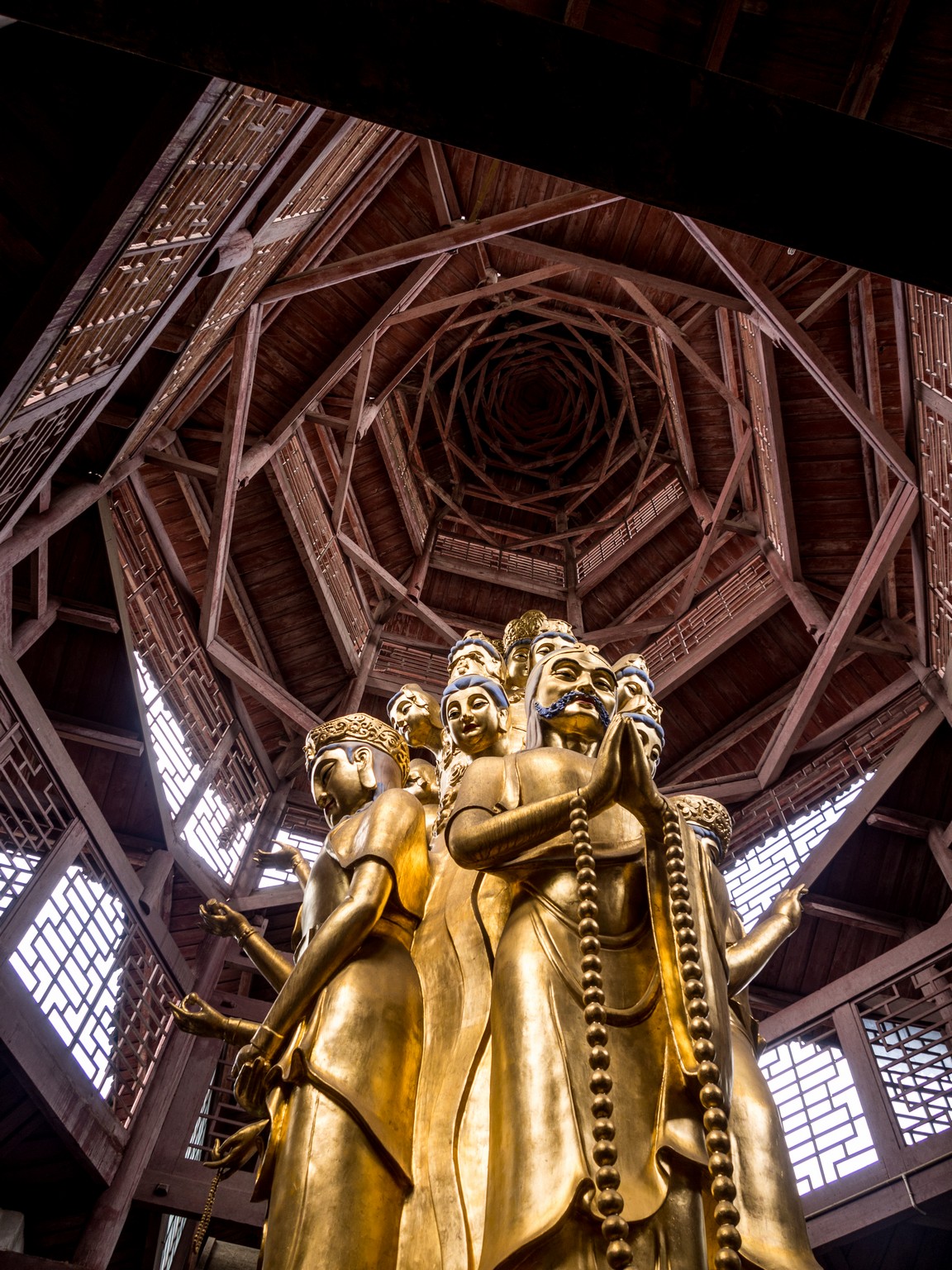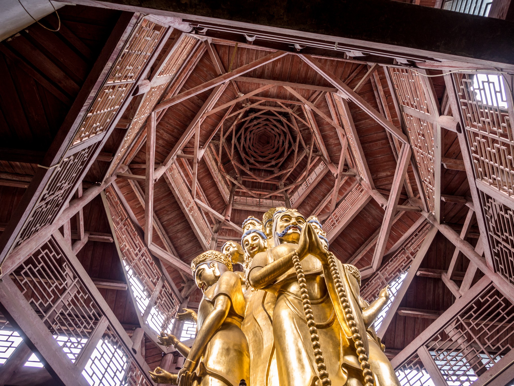 Après avoir fait le tour de la statue, nous nous dirigeons vers Huazang Temple, un ensemble de trois pavillons, tous aussi dorés que la statue ! L’abondance de dorures se poursuit jusqu’à l’intérieur même des pavillons, avec une opulence de décoration et de statues.