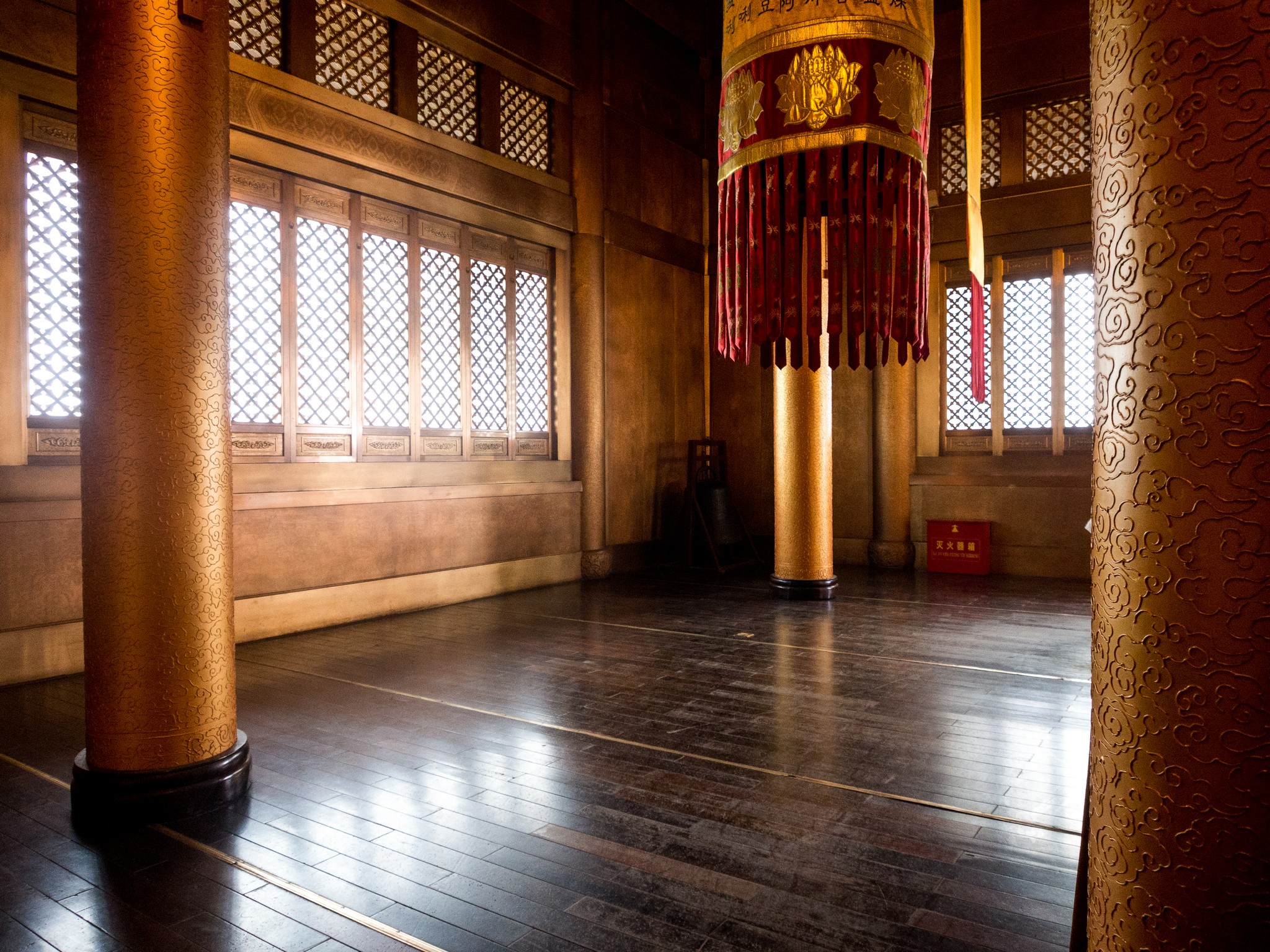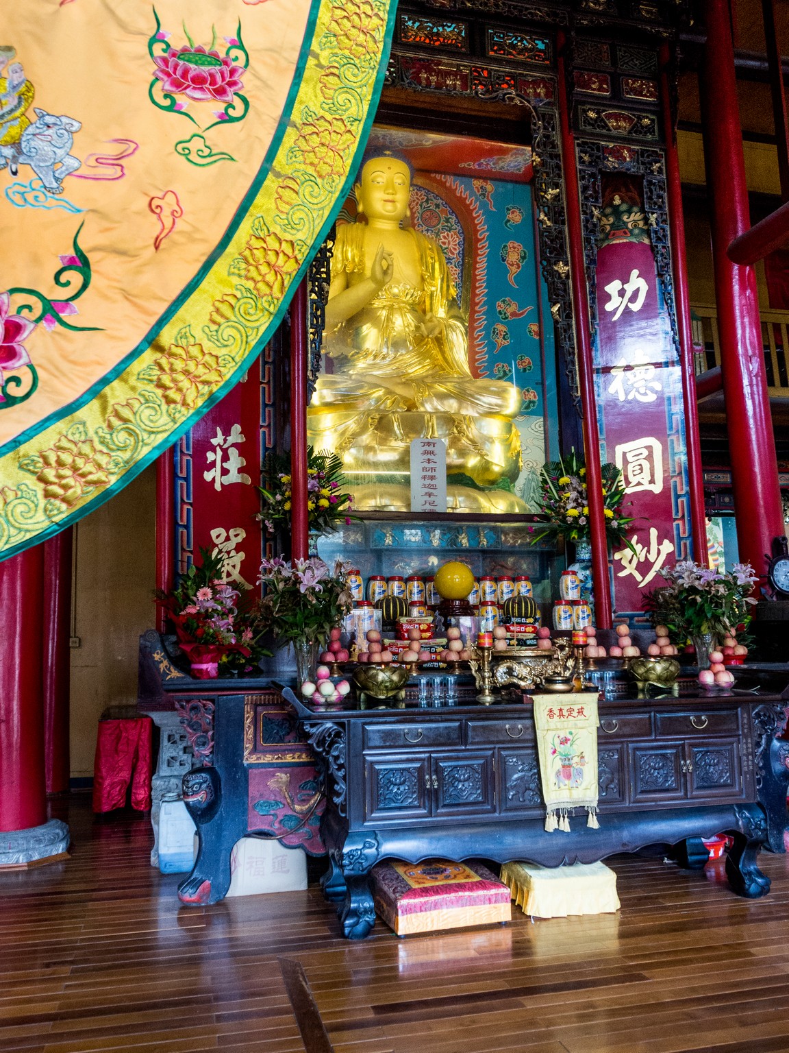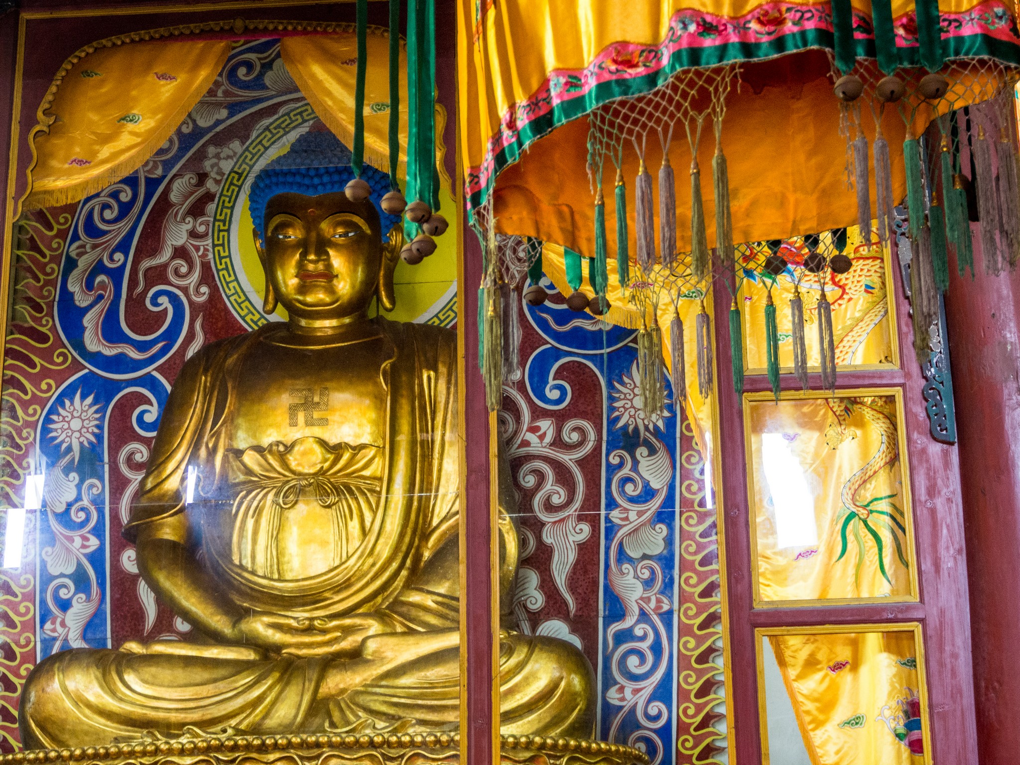 Après avoir fait le tour de la statue, nous nous dirigeons vers Huazang Temple, un ensemble de trois pavillons, tous aussi dorés que la statue ! L’abondance de dorures se poursuit jusqu’à l’intérieur même des pavillons, avec une opulence de décoration et de statues.