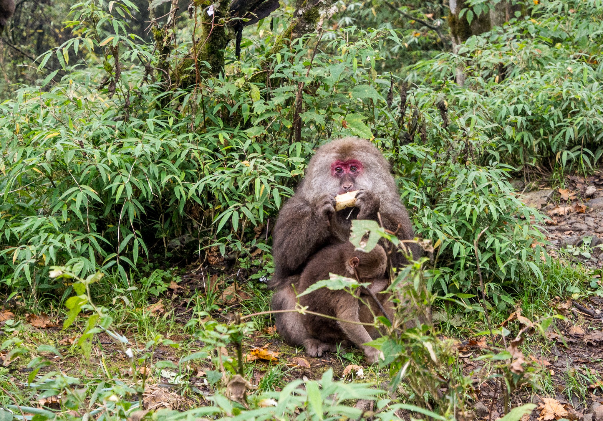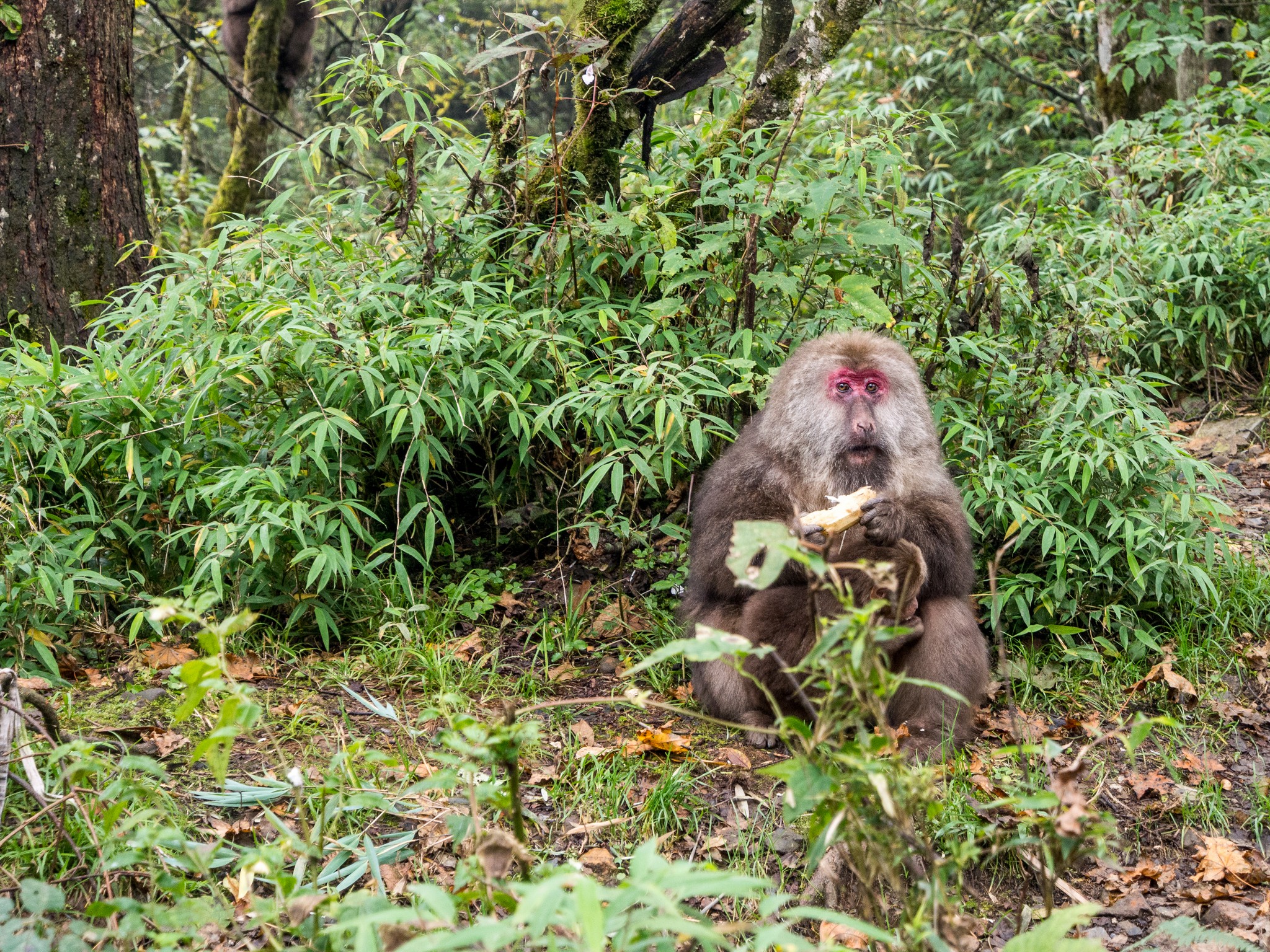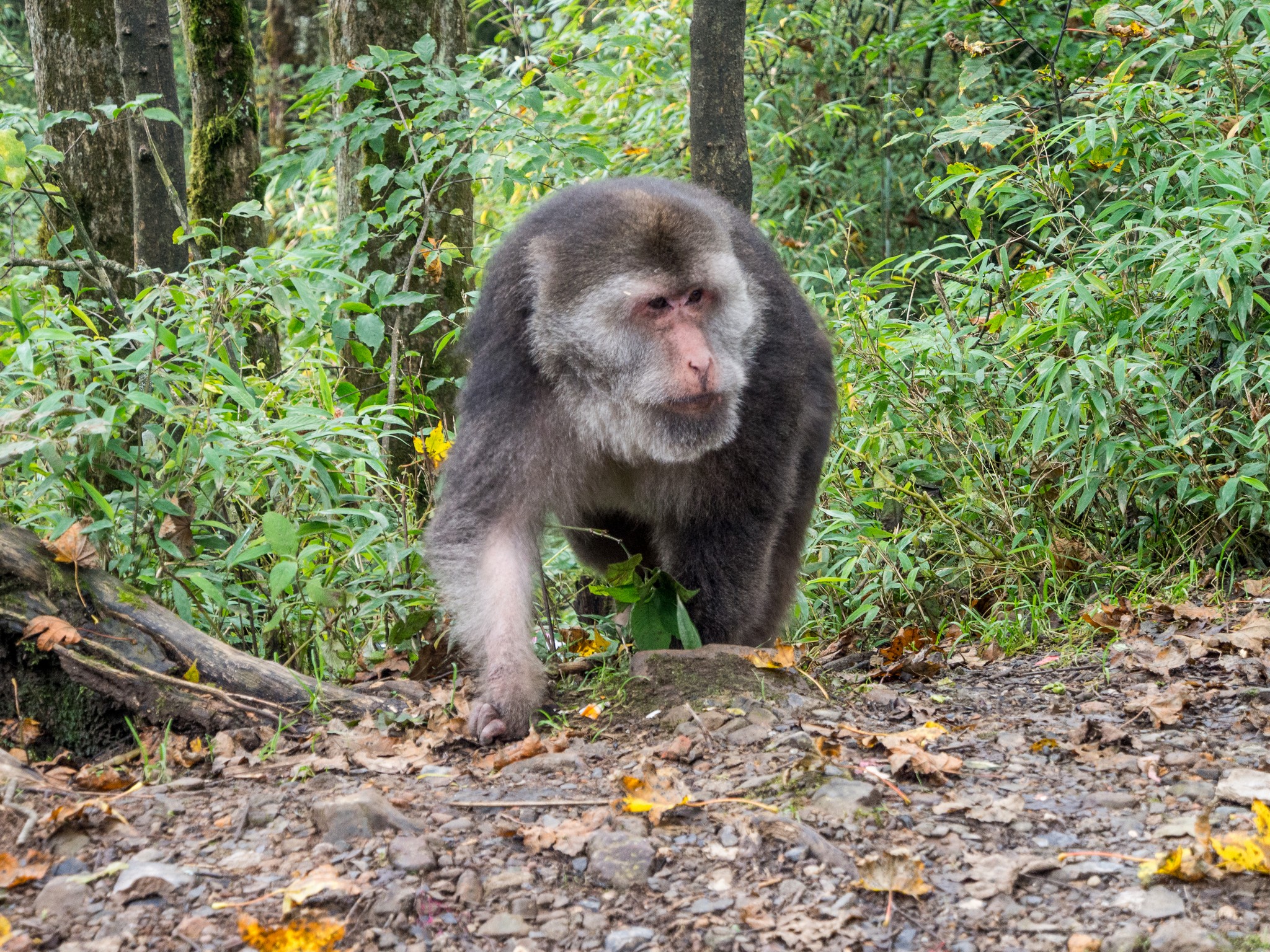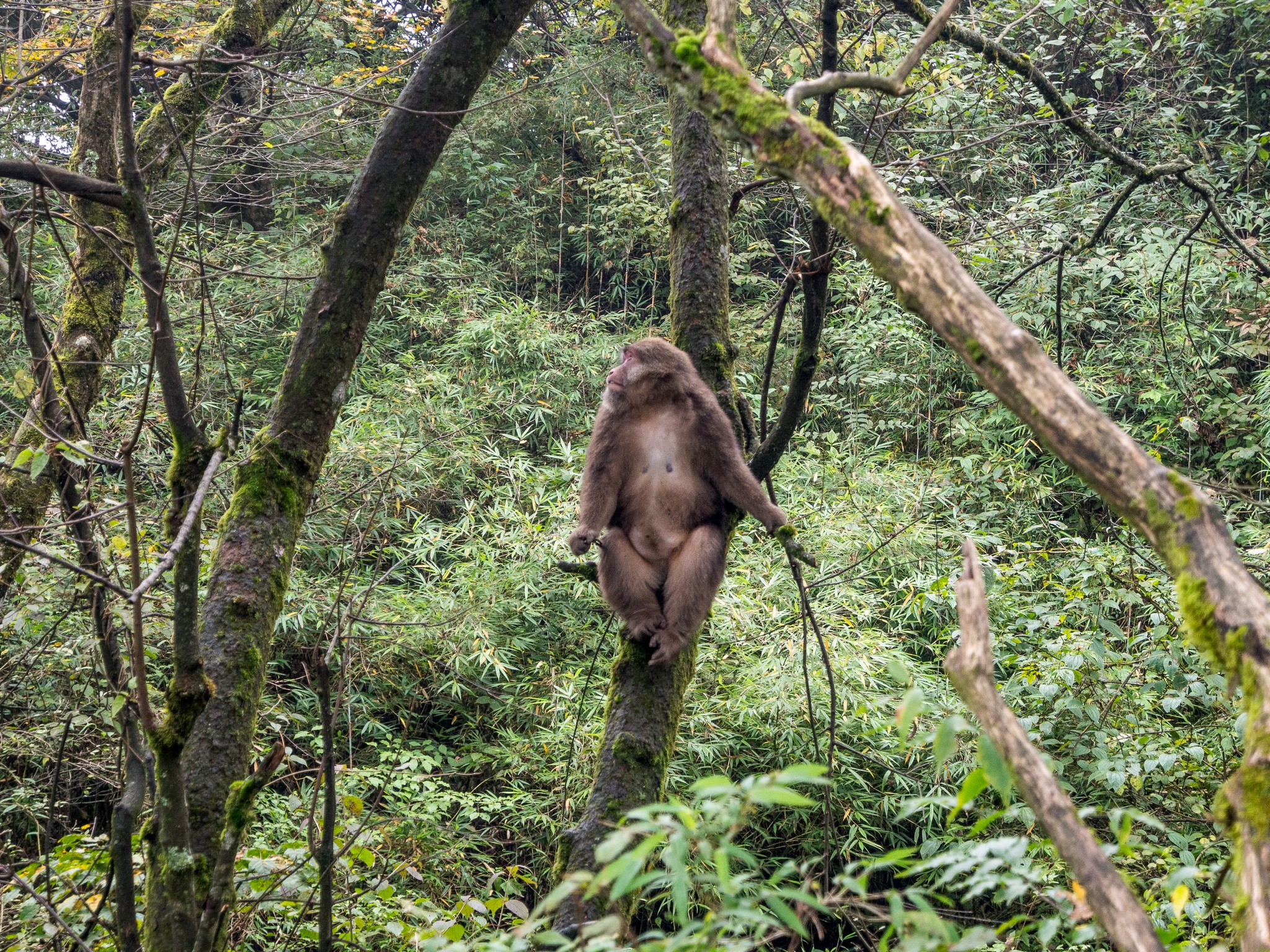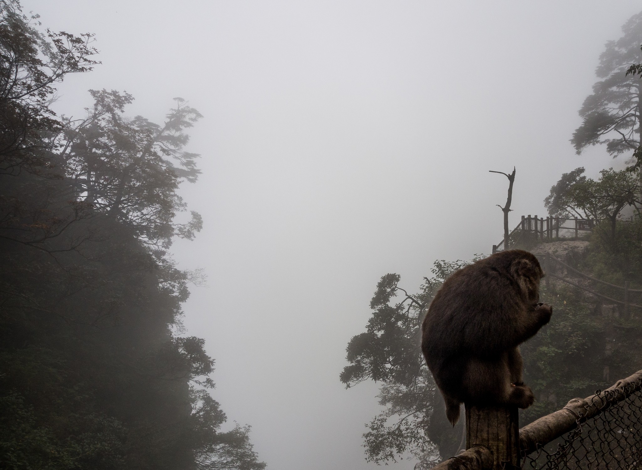 Après une bonne heure de bus sur une route qui ne fait que grimper, nous voilà arrivées au début du chemin. J’endosse ma polaire car même si le sommet est encore loin, la température a chuté. Un chemin bien aménagé emmène les visiteurs à travers une forêt dense et autant vous prévenir : ça grimpe… et même pas mal mais on prend son temps, d’autant plus que les visiteurs, surtout chinois, sont légion à Emeishan ! En route, vous croiserez sûrement les macaques qui y vivent. Ils sont bien différents de macaques que je connais, avec un pelage long et épais pour les protéger des rigueurs de l’hiver (le sommet du Mont Emei reste enneigé jusqu’au milieu du printemps). Comme à chaque fois que je vois un primate, j’ai l’impression de retomber en enfance mais méfiance ! Ces singes sont chapardeurs, encouragés par le fait que de nombreux touristes complètement inconscients tentent de les attirer avec de la nourriture. Je vais d’ailleurs assister à une scène plutôt triste où un singe assis sur un poteau sera carrément bombardé de cacahuètes par une dizaine de touristes, manquant de lui faire perdre l’équilibre alors qu’un précipice est derrière lui ! Prudence donc, gardez vos distances et faites attention à vos affaires !