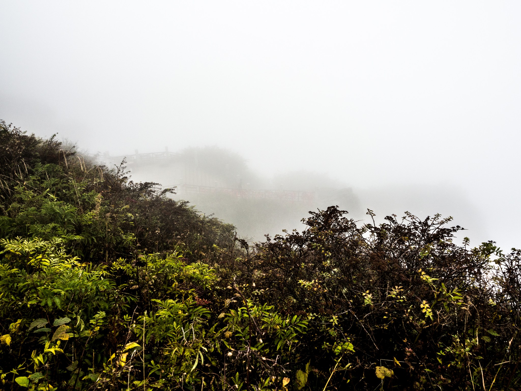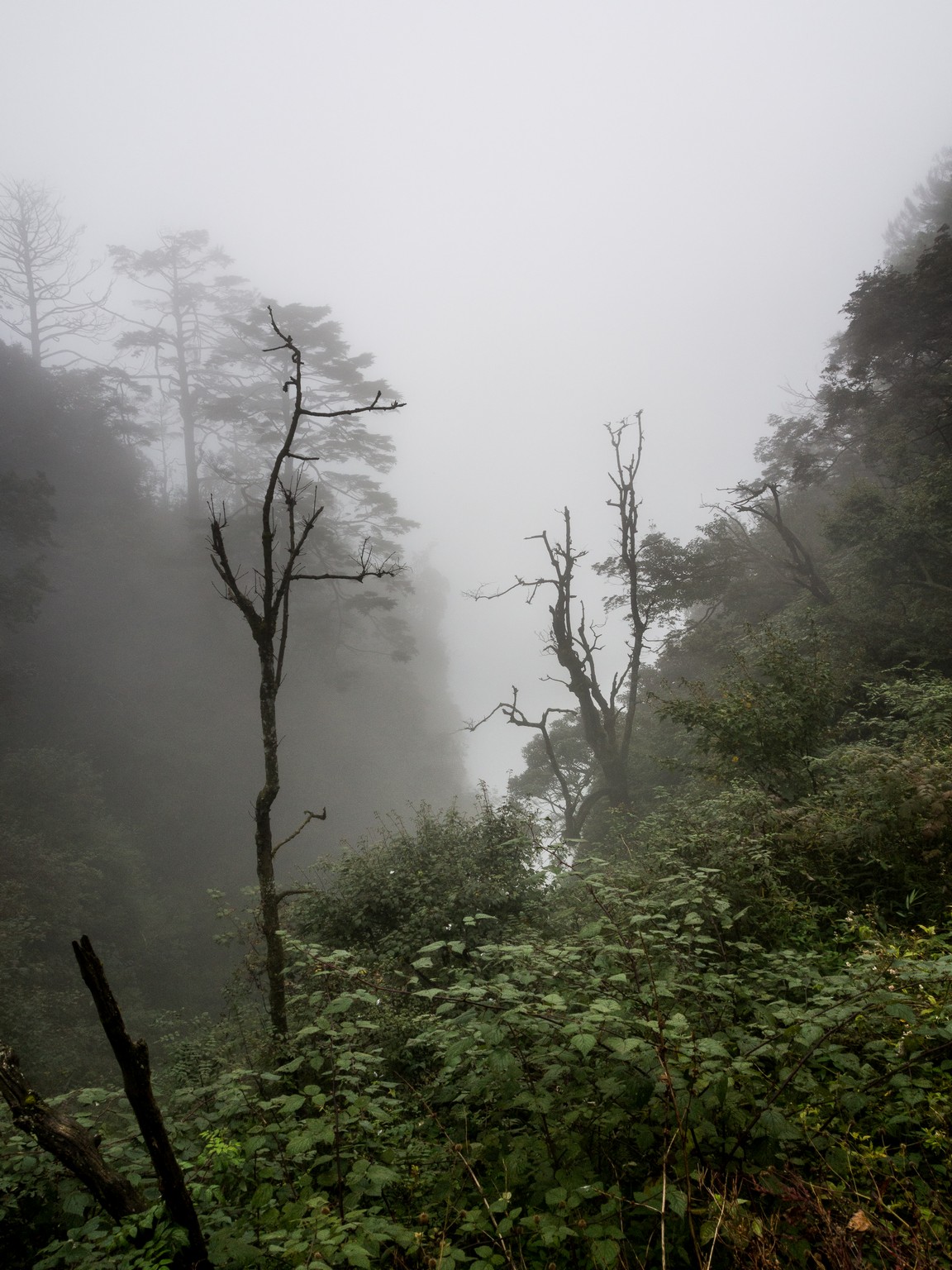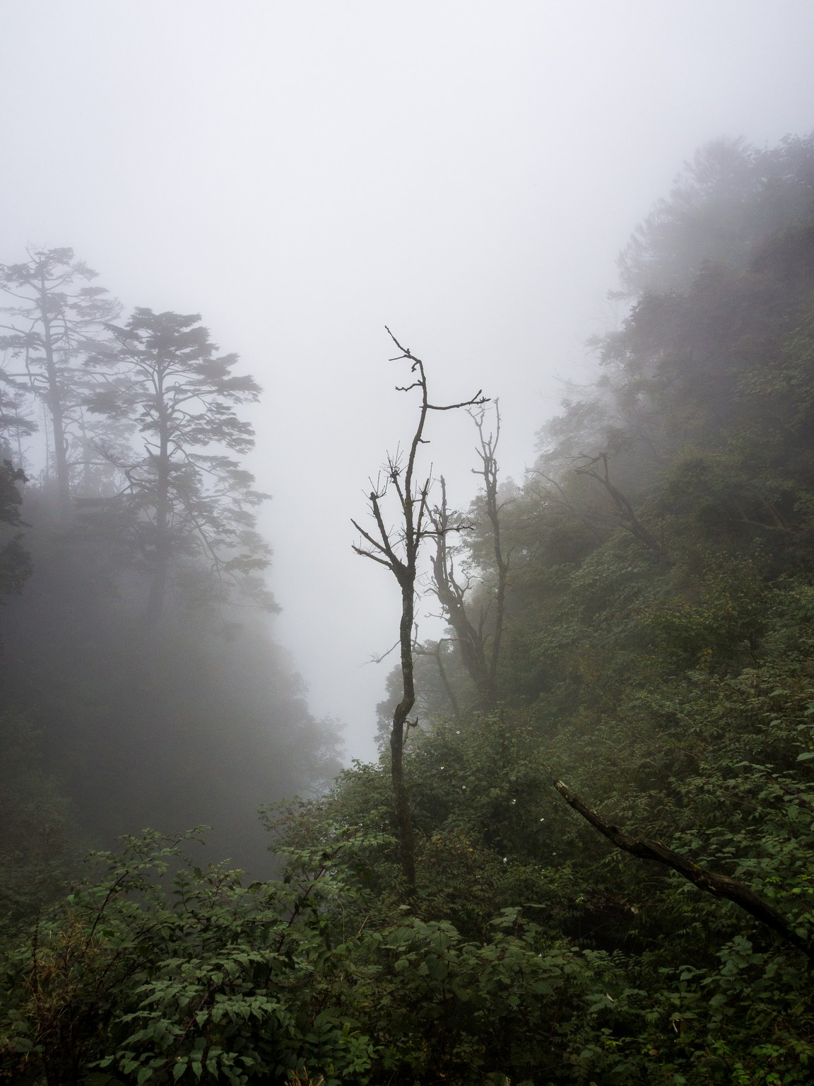 Au fur et à mesure de l’ascension, le brouillard se fait de plus en plus épais… en fait, nous sommes dans les nuages ! Cela donne au paysage un aspect mélancolique, hanté… j’ai l’impression d’avoir devant moi une estampe chinoise grandeur nature !