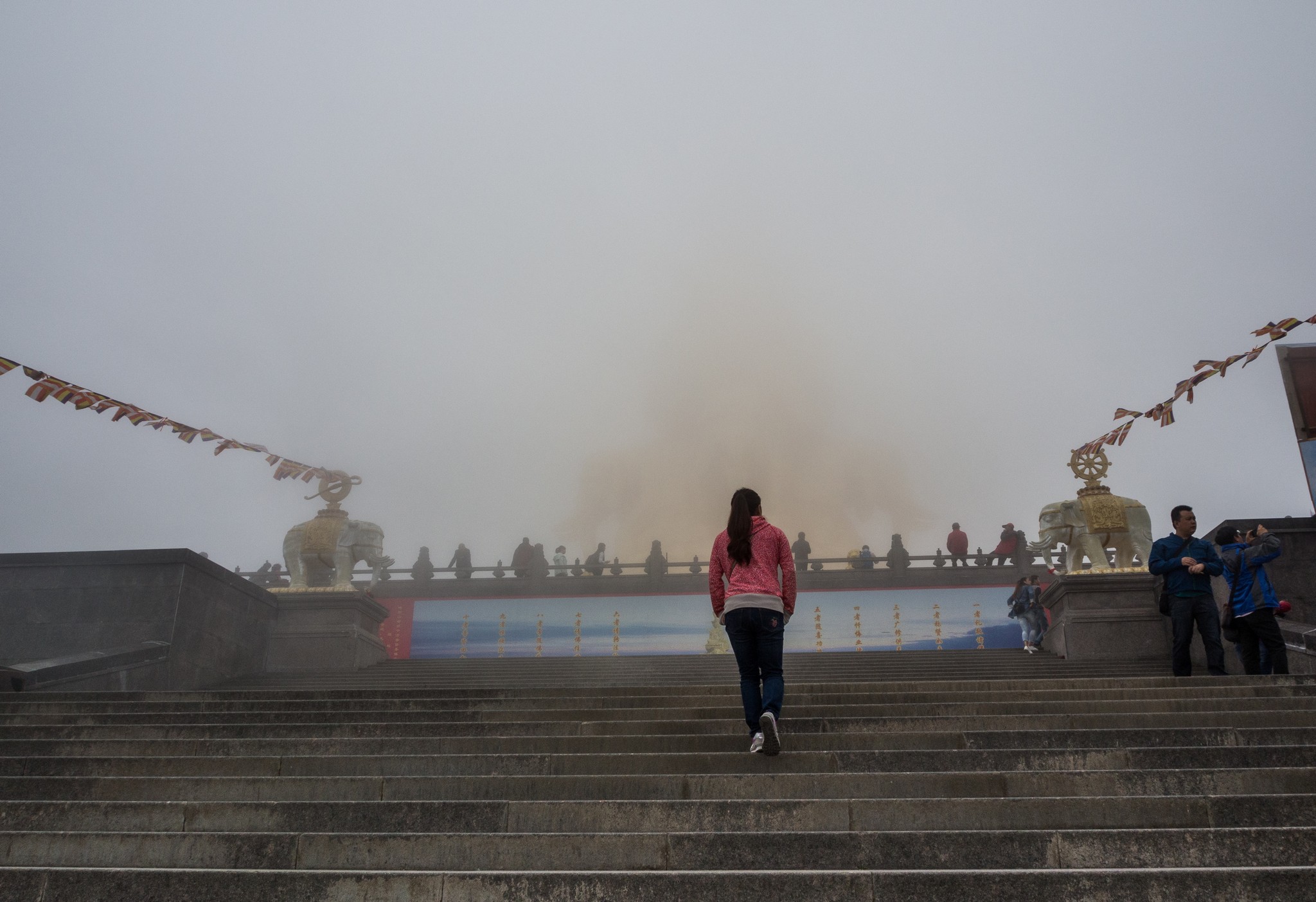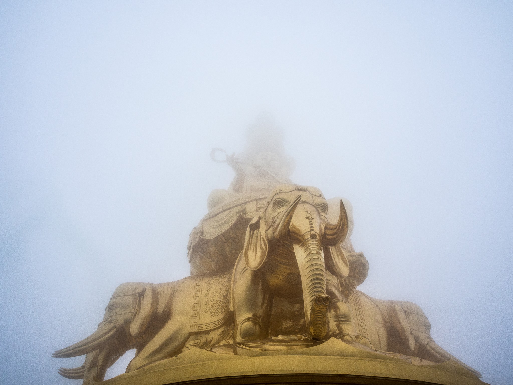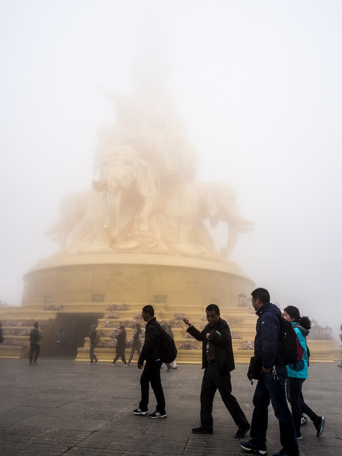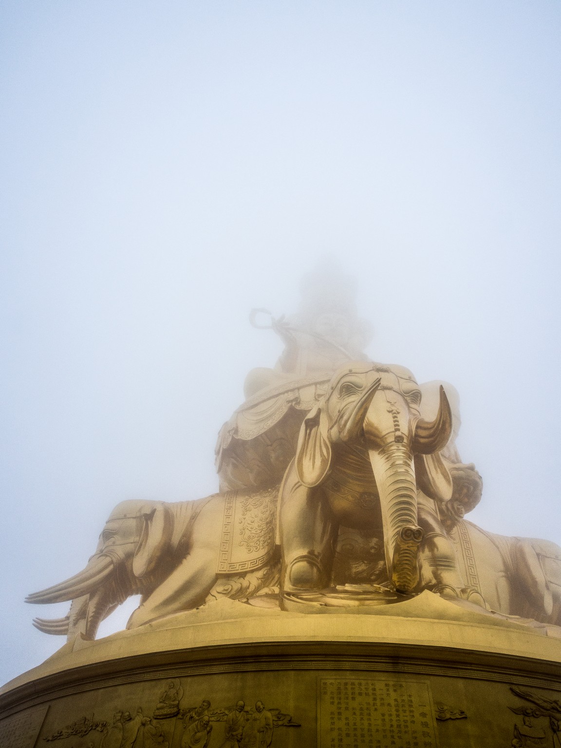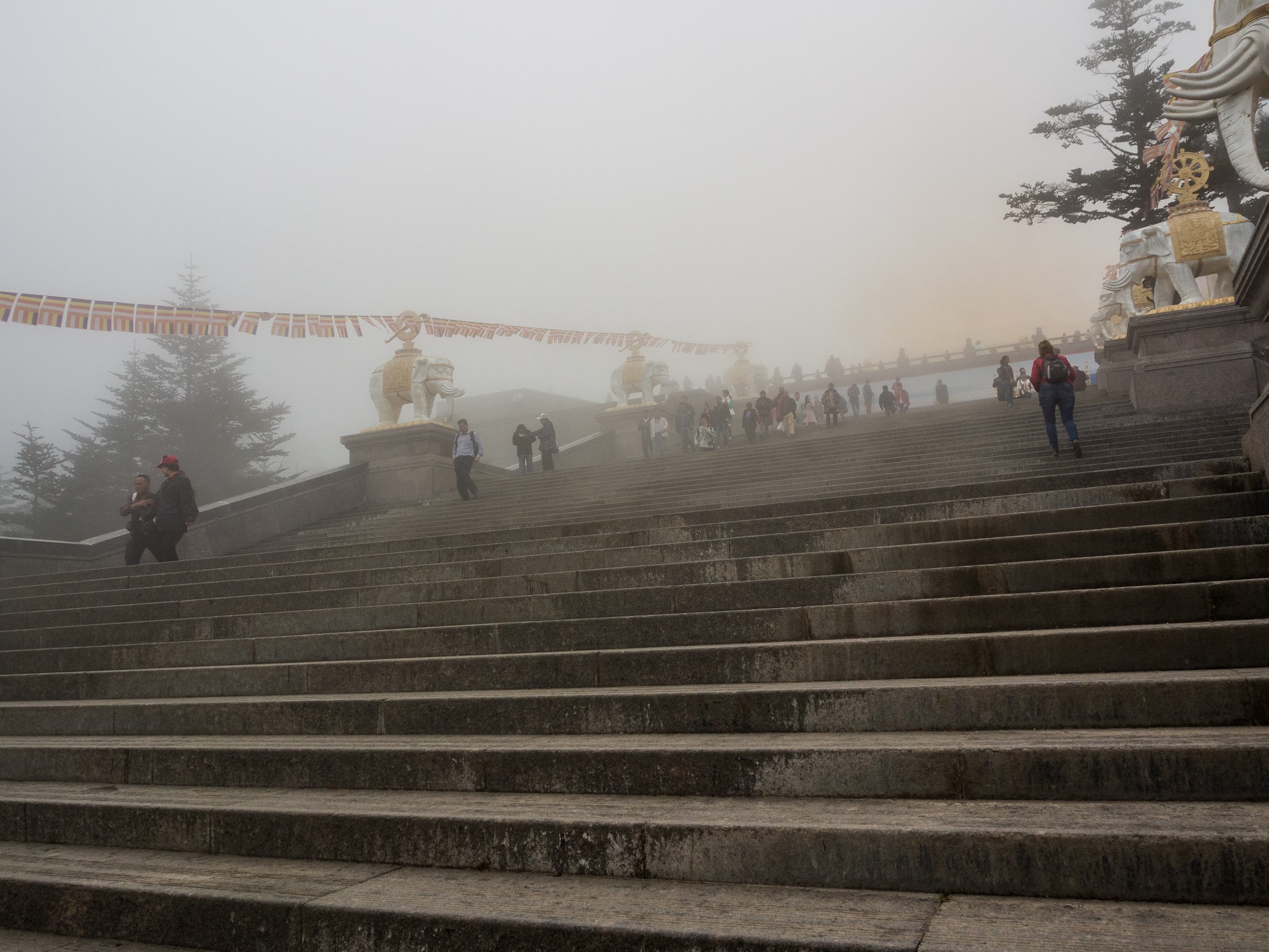 Enfin… après avoir monté encore quelques volées d’escaliers, nous voilà devant le dernier. Il est monumental et les nuages engloutissent presque son sommet ! Au fur et à mesure qu’on le gravit, une immense silhouette dorée commence à se dessiner : c’est ce que vient voir le pèlerin (ou l’amoureux de la randonnée) : une statue à multiple visages de Samantabhadra assis sur un quadruple éléphant. L’ambiance étrange procurée par le brouillard est encore amplifiée par le mal des montagnes. J’ai la tête qui tourne et le moindre effort s’il n’est pas une torture, demande pas mal de prendre sur soi (pas facile du coup de grimper les escaliers). N’oublie pas Lectrice, Lecteur, à 3000 mètres, on est déjà TRES haut et pour peu que tu sois sensible (de mon côté, les premiers symptômes apparaissent au-dessus de 2000 mètres), tu risques de passer un moment un peu compliqué au sommet ! Cela ne m’empêche heureusement pas de profiter de l’étrange beauté de ce lieu où toutes formes sont gommées. Enfin, en naviguant entre les nombreux visiteurs venus qui entrent et sortent du brouillard comme des fantômes.