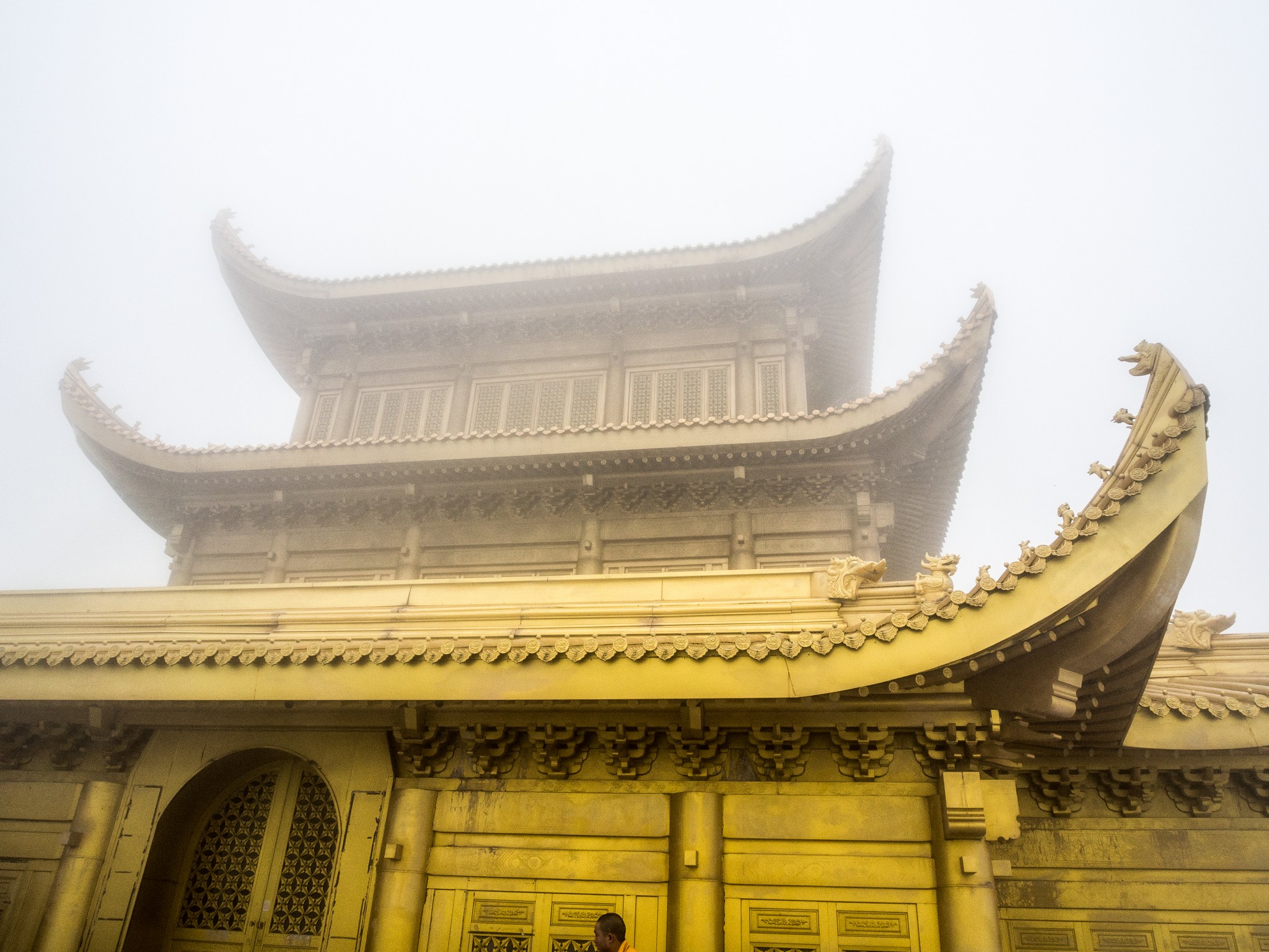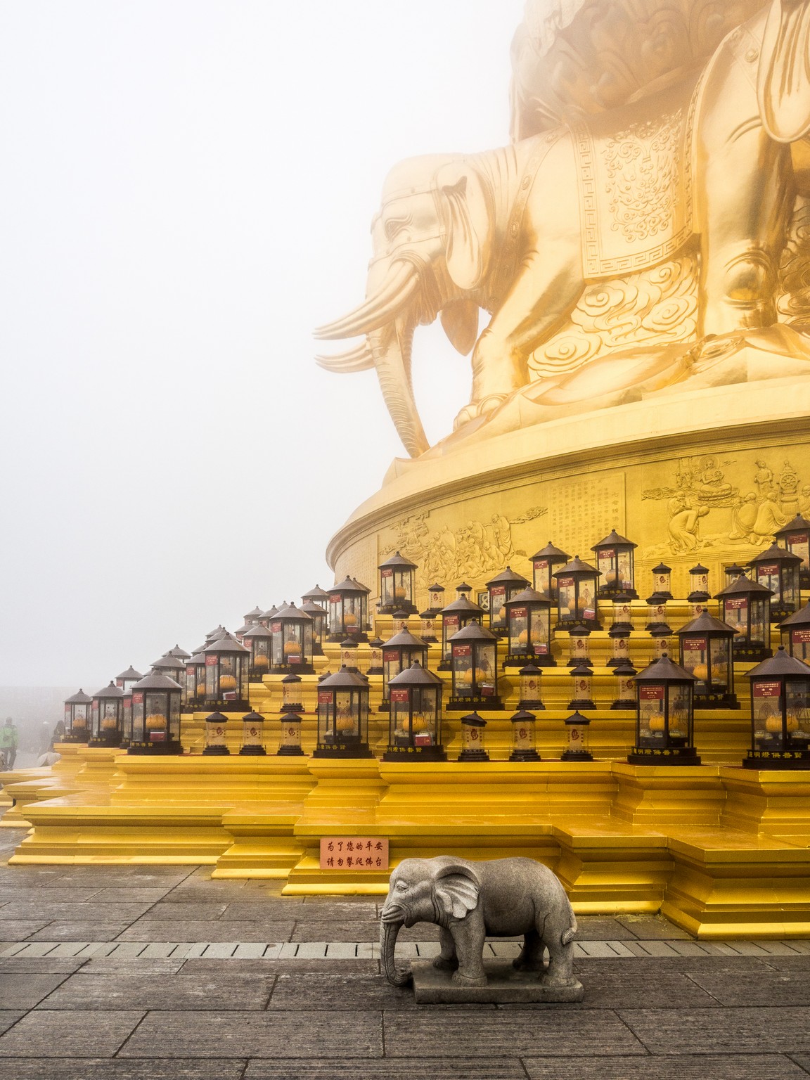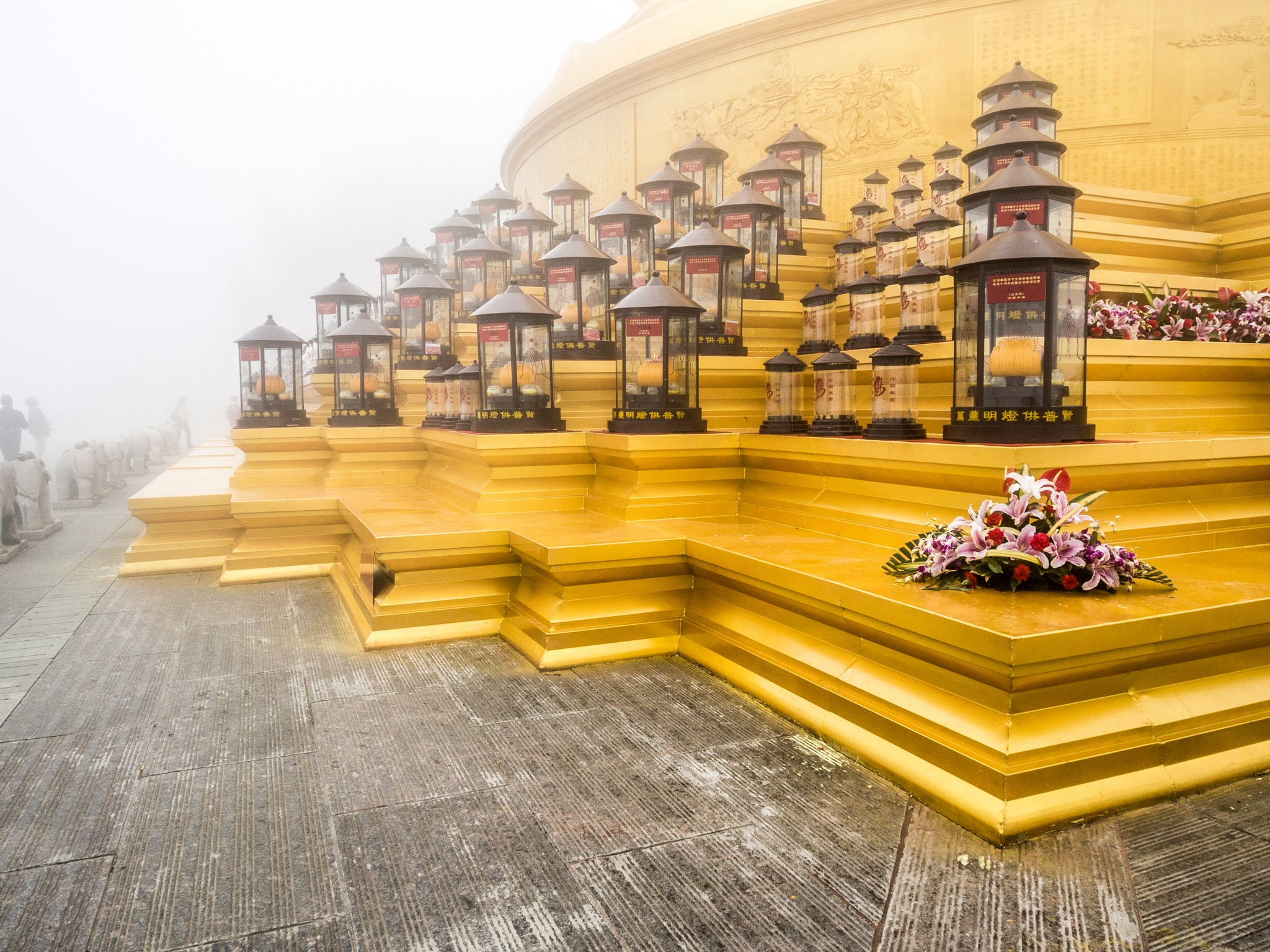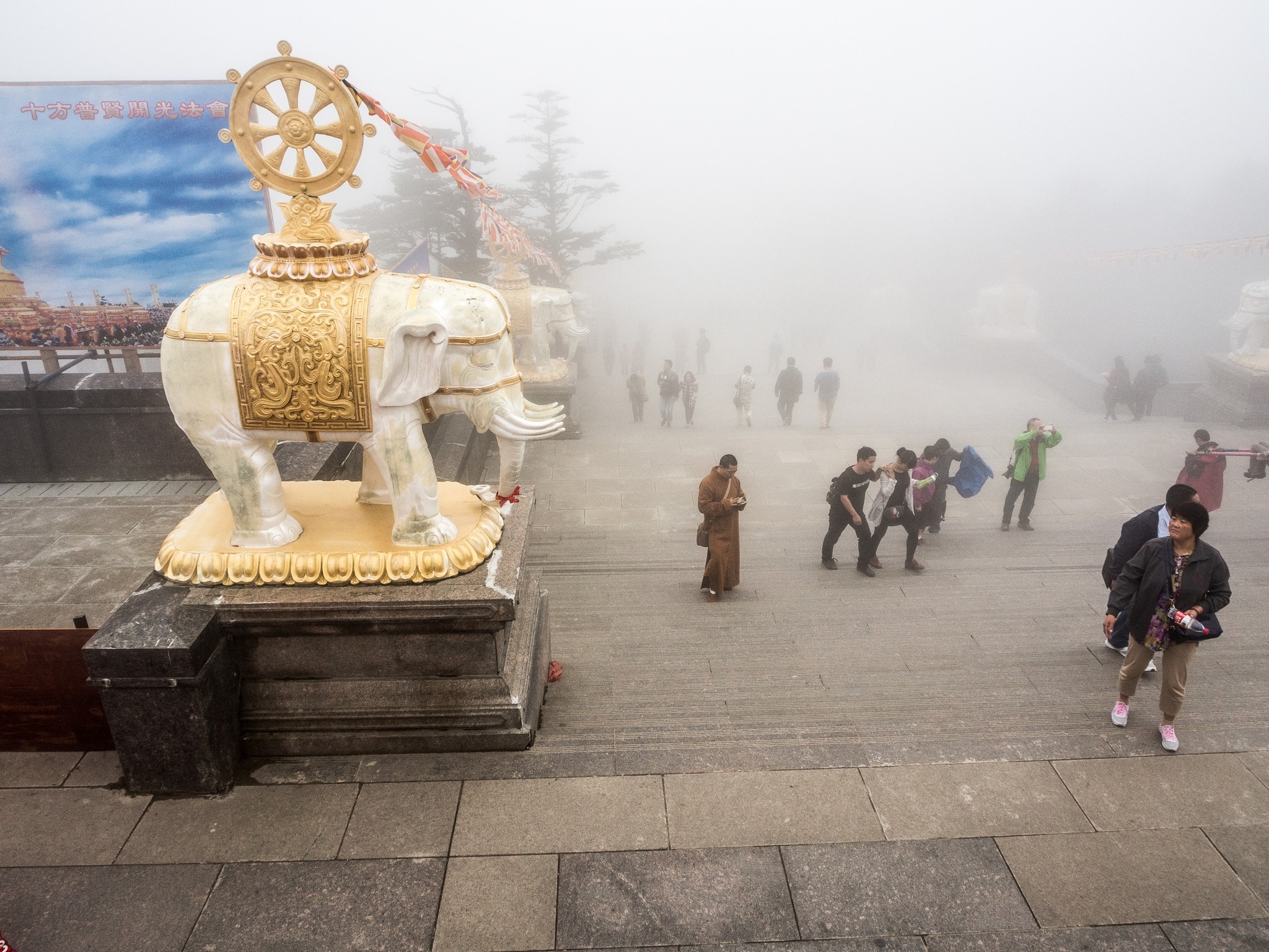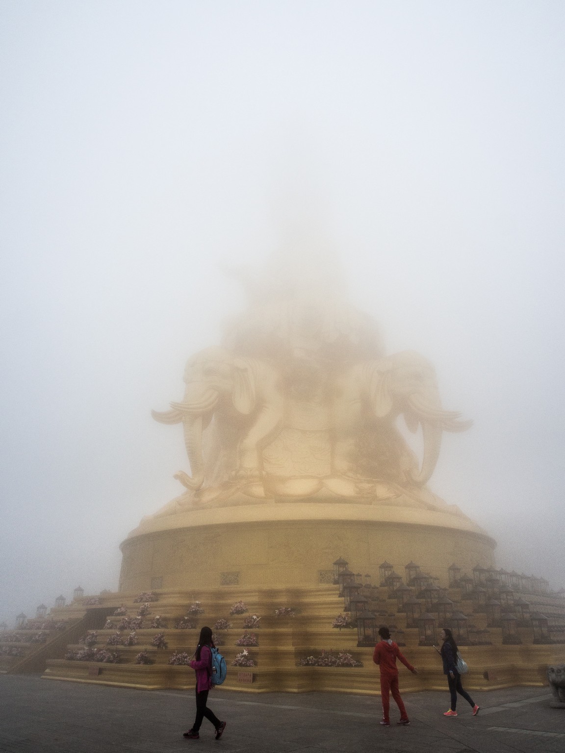 Enfin… après avoir monté encore quelques volées d’escaliers, nous voilà devant le dernier. Il est monumental et les nuages engloutissent presque son sommet ! Au fur et à mesure qu’on le gravit, une immense silhouette dorée commence à se dessiner : c’est ce que vient voir le pèlerin (ou l’amoureux de la randonnée) : une statue à multiple visages de Samantabhadra assis sur un quadruple éléphant. L’ambiance étrange procurée par le brouillard est encore amplifiée par le mal des montagnes. J’ai la tête qui tourne et le moindre effort s’il n’est pas une torture, demande pas mal de prendre sur soi (pas facile du coup de grimper les escaliers). N’oublie pas Lectrice, Lecteur, à 3000 mètres, on est déjà TRES haut et pour peu que tu sois sensible (de mon côté, les premiers symptômes apparaissent au-dessus de 2000 mètres), tu risques de passer un moment un peu compliqué au sommet ! Cela ne m’empêche heureusement pas de profiter de l’étrange beauté de ce lieu où toutes formes sont gommées. Enfin, en naviguant entre les nombreux visiteurs venus qui entrent et sortent du brouillard comme des fantômes.
