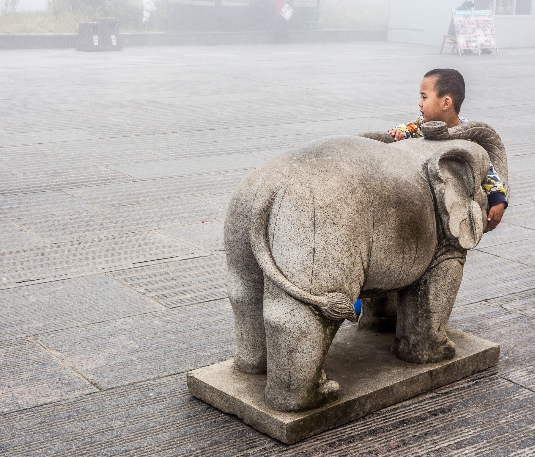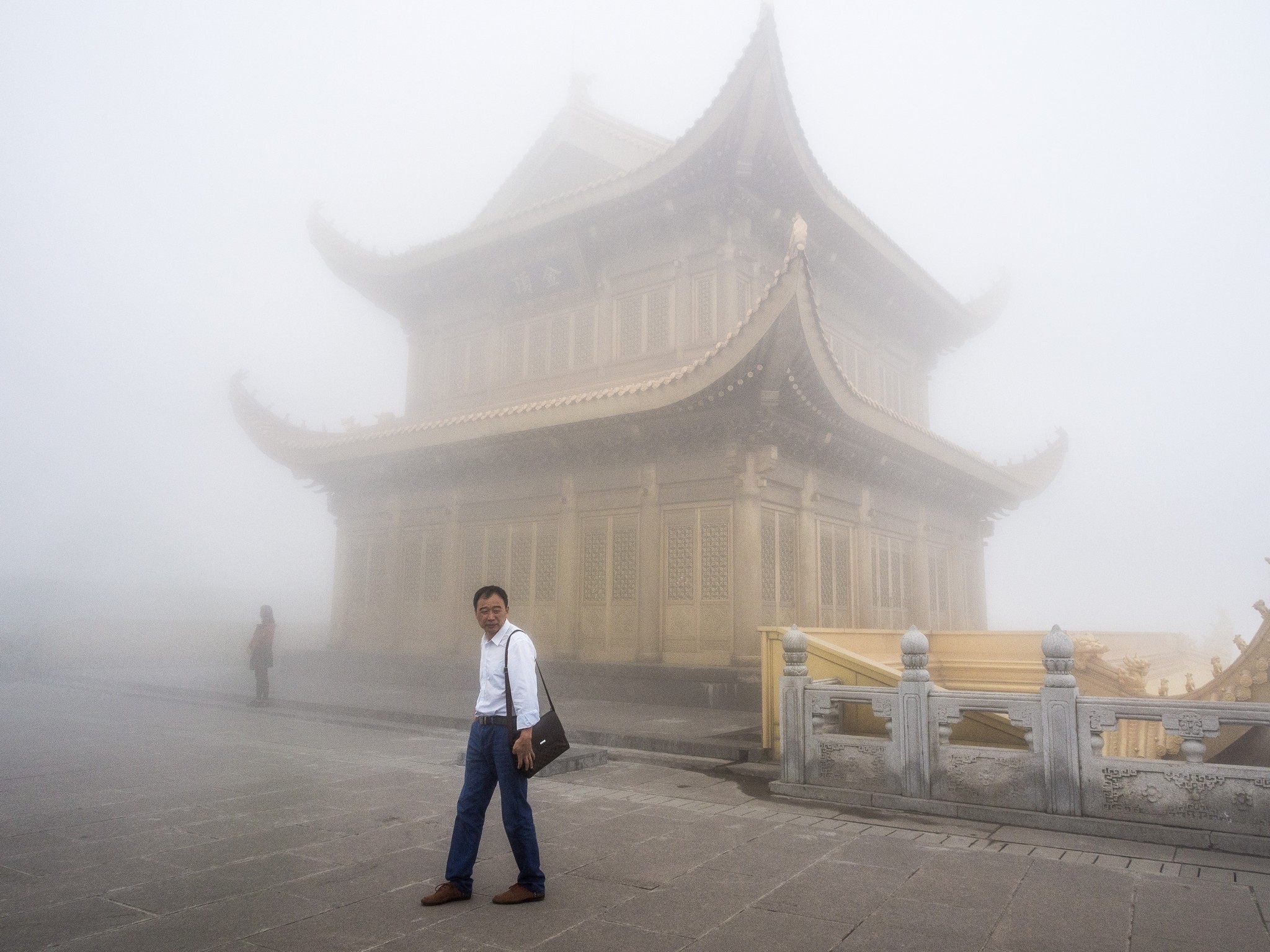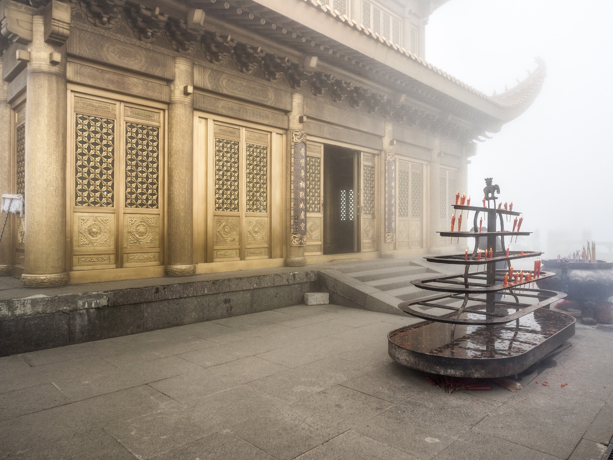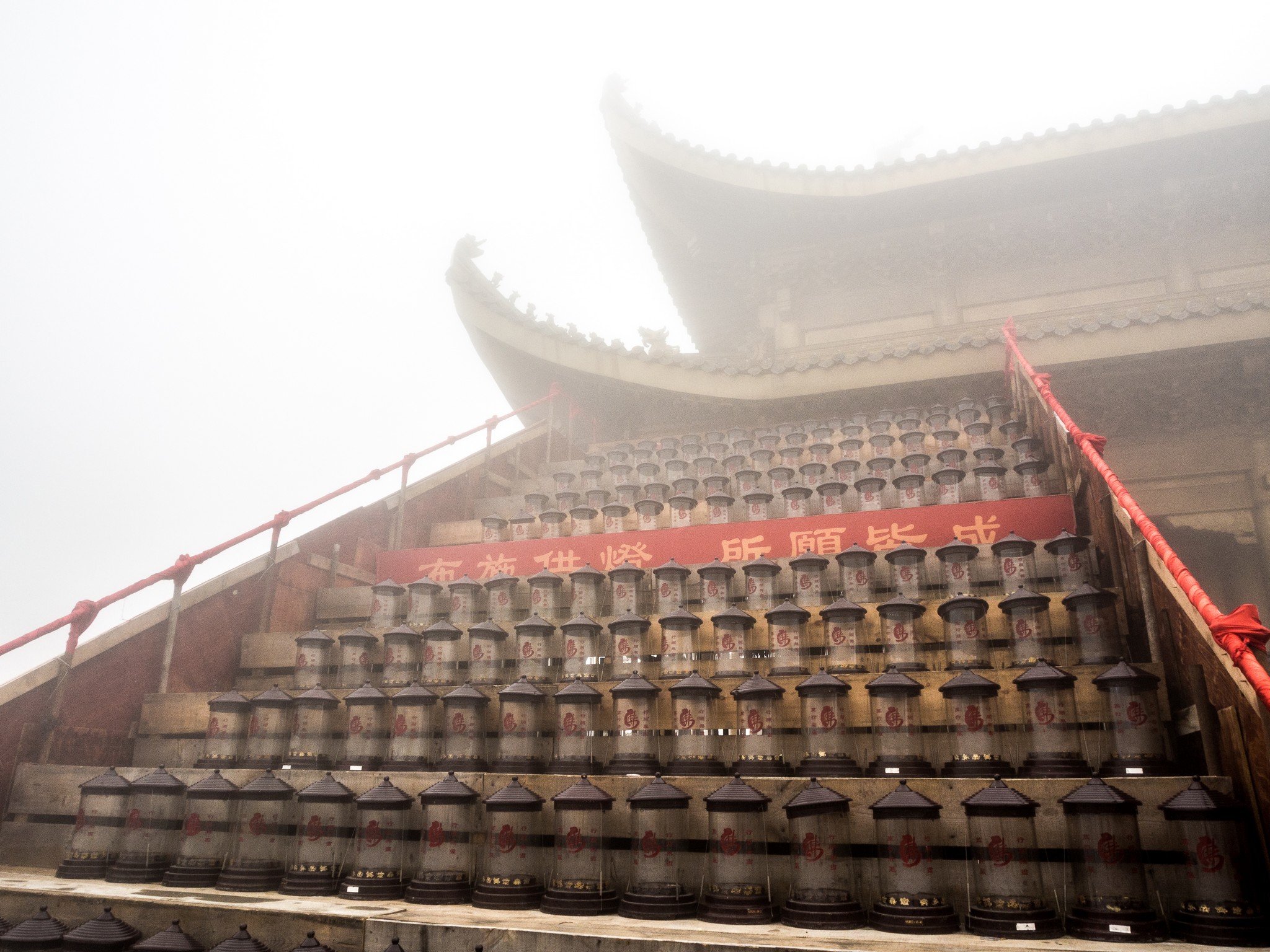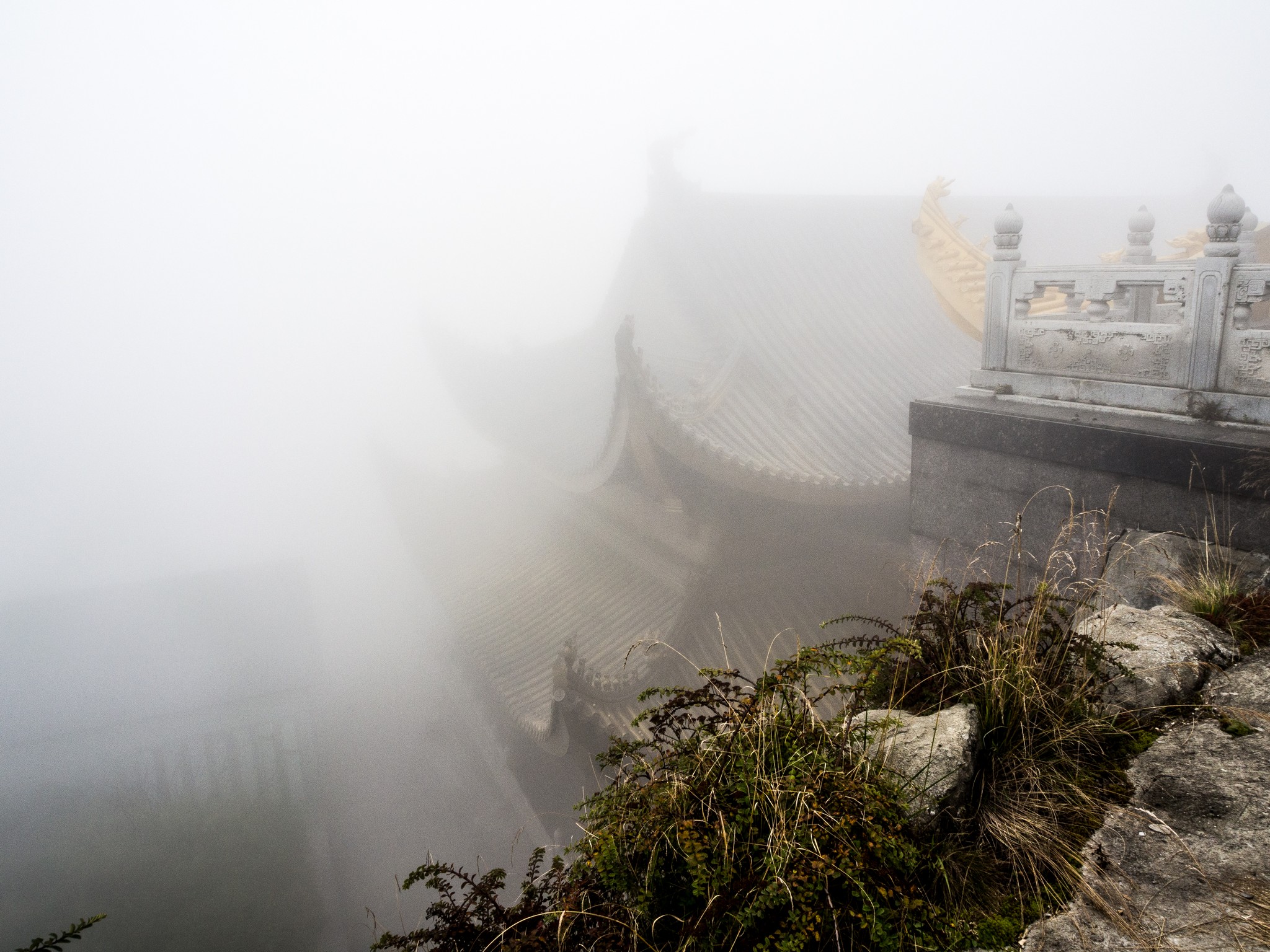 Enfin… après avoir monté encore quelques volées d’escaliers, nous voilà devant le dernier. Il est monumental et les nuages engloutissent presque son sommet ! Au fur et à mesure qu’on le gravit, une immense silhouette dorée commence à se dessiner : c’est ce que vient voir le pèlerin (ou l’amoureux de la randonnée) : une statue à multiple visages de Samantabhadra assis sur un quadruple éléphant. L’ambiance étrange procurée par le brouillard est encore amplifiée par le mal des montagnes. J’ai la tête qui tourne et le moindre effort s’il n’est pas une torture, demande pas mal de prendre sur soi (pas facile du coup de grimper les escaliers). N’oublie pas Lectrice, Lecteur, à 3000 mètres, on est déjà TRES haut et pour peu que tu sois sensible (de mon côté, les premiers symptômes apparaissent au-dessus de 2000 mètres), tu risques de passer un moment un peu compliqué au sommet ! Cela ne m’empêche heureusement pas de profiter de l’étrange beauté de ce lieu où toutes formes sont gommées. Enfin, en naviguant entre les nombreux visiteurs venus qui entrent et sortent du brouillard comme des fantômes.