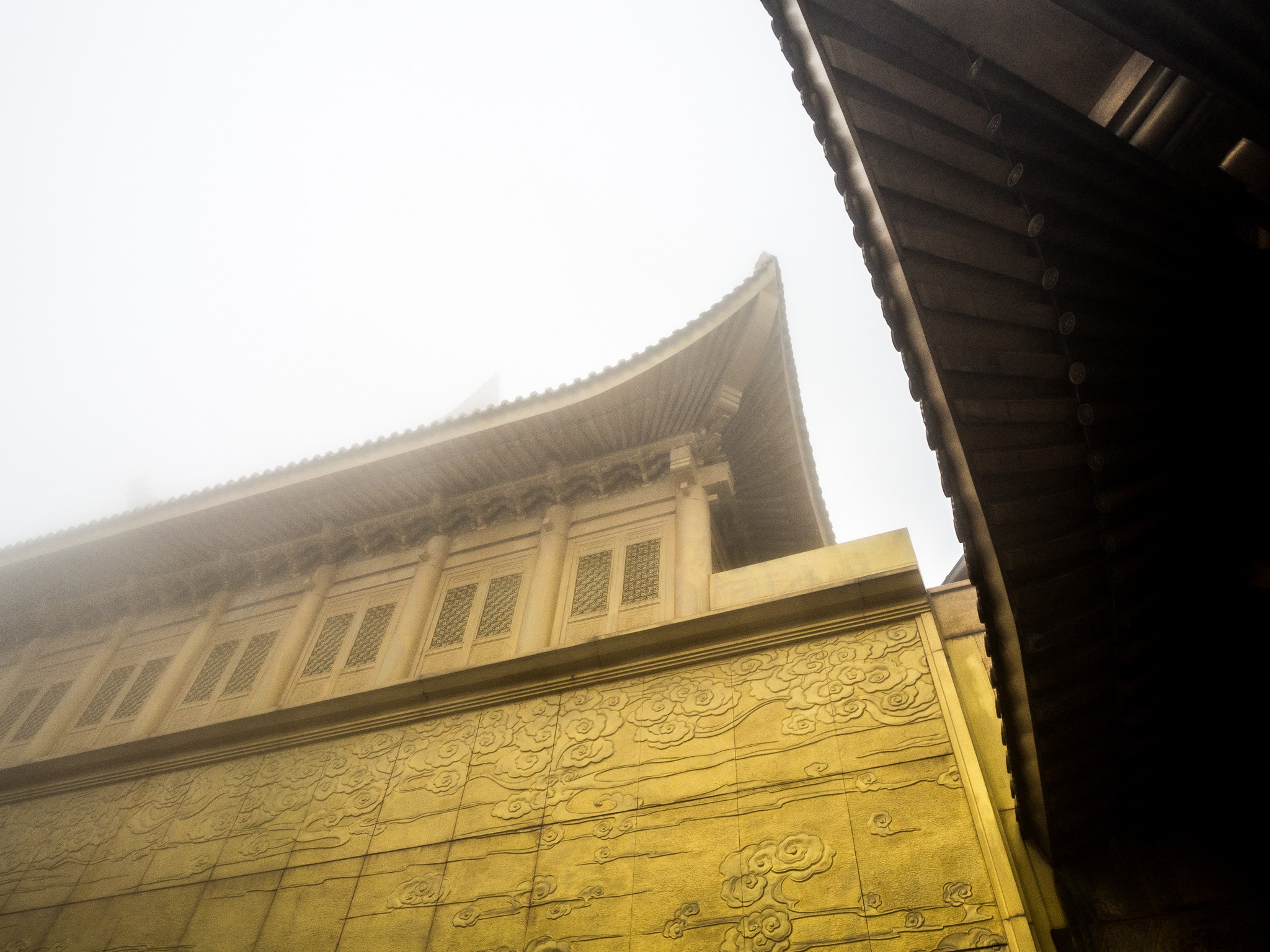 Situé juste à l’entrée du parc, Baoguo est un grand temple qui consiste en quatre pavillons où l’on trouve de nombreuses statues, peintures et artefacts, notamment une représentation de Samantabhadra sur son éléphant et un large Bouddha de porcelaine dorée. Tu le verras te sourire Lectrice, Lecteur, assis sur un lotus. La galerie des sept bouddhas vaut aussi le coup. Ce qui m’a le plus frappée dans ce temple, c’est l’harmonie qui y règne. On se sent transportée comme dans un monde parallèle où chaque bouffée d’air apporte un parfum d’encens et où les apparitions furtives de bonzesses habillées de gris viennent rythmer la vie.