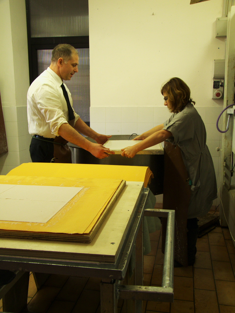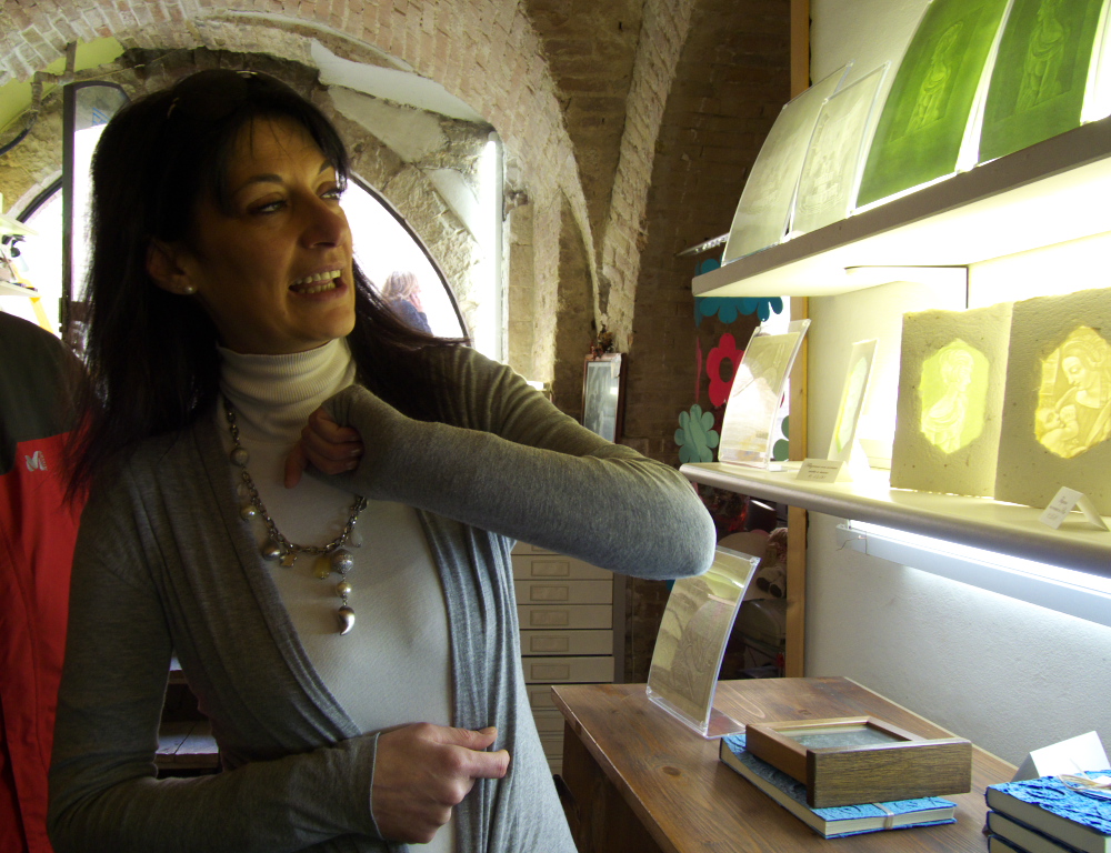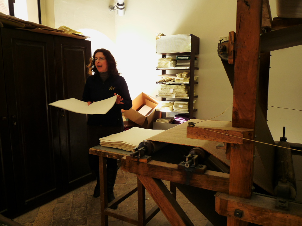 Fabriano est créditée comme la capitale du papier et du filigrane. Fabriano, c’est un peu une histoire de grandeur et décadence ! Développée depuis le XIIIe siècle et l’essor de la fabrication du papier, elle fut ville libre, puis asservie à la famille Chiavelli avant de passer dans le giron des Etats Pontificaux (« ce qui explique le grand nombre de garibaldistes, d’anarchistes et de francs-maçons » nous confia Euro en riant), elle devint plus tard ville industrielle. Merloni y avait ses usines, et y a encore son siège puis boum. La crise. Pour s’en sortir, Fabriano s’est retournée vers ses traditions, la fabrication de papier de haute qualité, notamment à destination d’artistes, mais aussi la culture, puisque la ville a donné naissance à une école de peinture gothique dont le plus célèbre exemple est Gentile de Fabriano. Ô ironie, il ne reste plus aucune de ses peintures en ville.