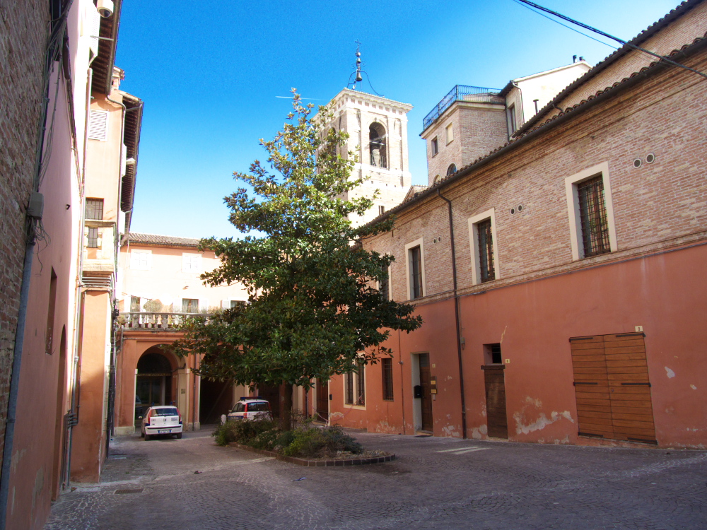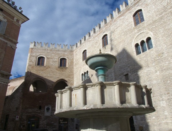 La Piazza communale sera probablement comme pour nous votre point de départ. Cette place à la forme trapézoïdale regroupe quelques-uns des plus beaux bâtiments de la vile : le Palazzo del Podesta et son arche aux vieilles fresques presque toutes effacées, le Palazzo Chiavelli et la Loge San Francesco. Au rez-de-chaussée de la loge, se tient un petit marché mais on y trouve surtout un marchand de charcuteries et fromages avec un bar où l’on peut tout de suite déguster ses achats. Ça tombe bien Fabriano fabrique un salami de jambon dont Garibaldi raffolait (un « salami de légende » dit le prospectus, j’ai ri).
