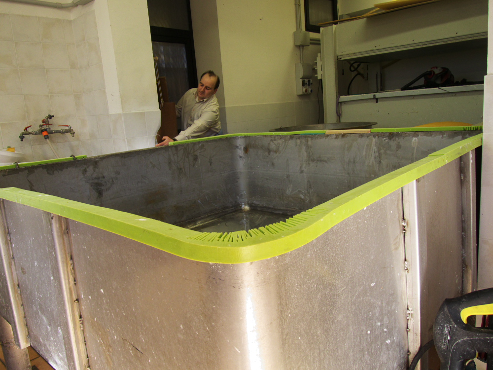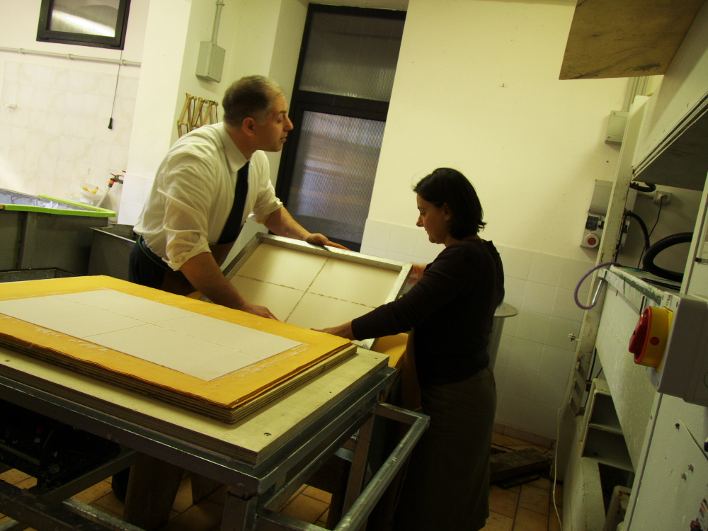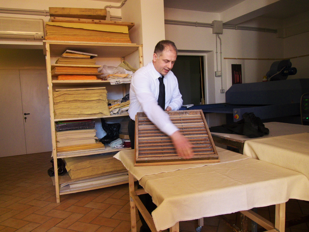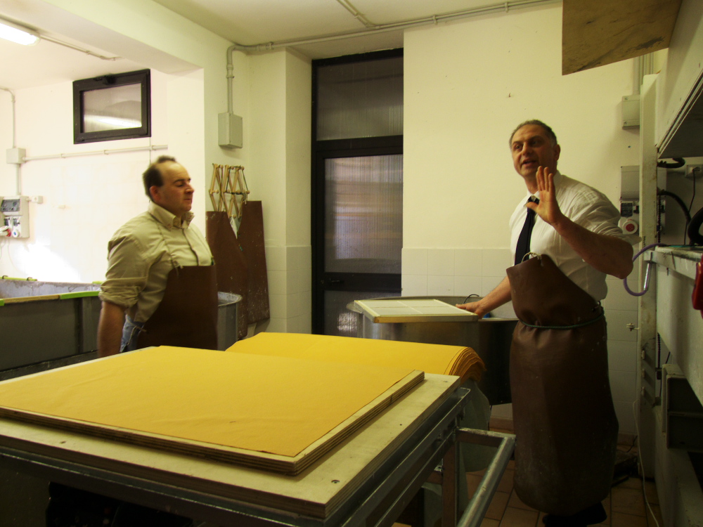 Premier arrêt de l’après-midi, le petit atelier de Cartegia Artigiana qui fabrique du papier de haute qualité à base de fibres de coton et joue un rôle d’intégration sociale en y organisant des activités pour des malades psychiques qui résident dans une institution voisine. Une thérapie de l’intégration par le travail qui donne des résultats étonnants.