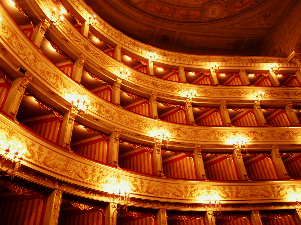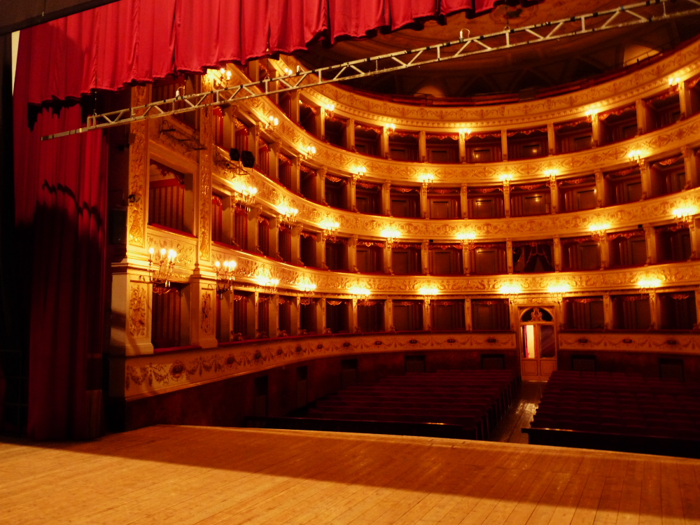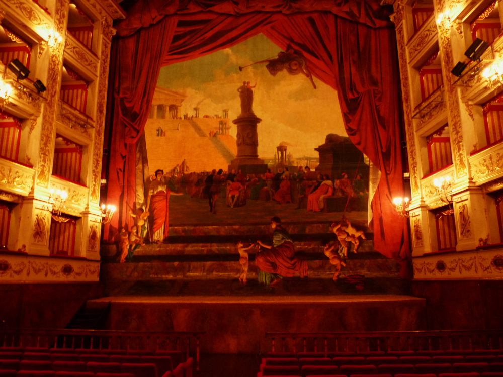 « Venez, nous entrons au Théâtre par la porte des artistes ». Impossible d’imaginer derrière cette petite porte et ce bâtiment que se cache un magnifique exemple du Théâtre à l’italienne : Teatro del Gentile. Nous voilà littéralement propulsés sur scène ! Le machiniste est là pour nous accueillir… A me retrouver sur la scène d’un pareil endroit, j’ai des frissons, la vue depuis ici est impressionnante ! Des rangées de balcons tendus de rouge et de blanc s’enroulent autour de nous… Et quand nous prenons place côté public, le machiniste a eu le temps de descendre le magnifique rideau d’apparat…
