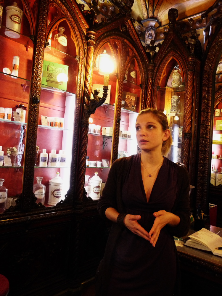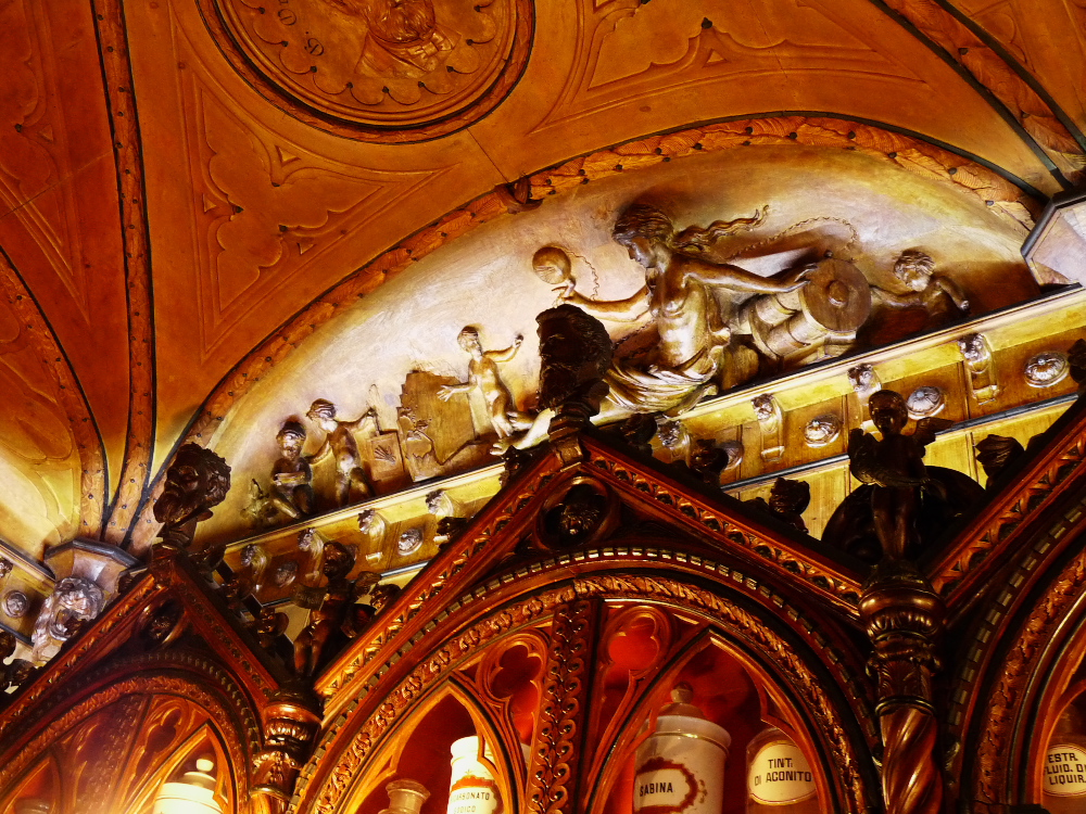 Pas le temps de s’émerveiller, nous voilà enlevés vers une vieille pharmacie, la pharmacie Mazzolini-Giuseppucci, Cette boutique de la fin du XIXe siècle a été conservée dans l’état, et pour cause, il est recouvert de sculpture en bois néo-gothiques. On y trouve des grands noms de la science, bien entendu un Hippocrate mais ce qui m’a le plus étonné, c’est une allégorie dans le plus pur style classique, à la découverte des rayon X. La pharmacie fonctionne toujours, mais elle s’est reconvertie en point de vente de produits de beauté à base de plantes bio, de sa propre fabrication.