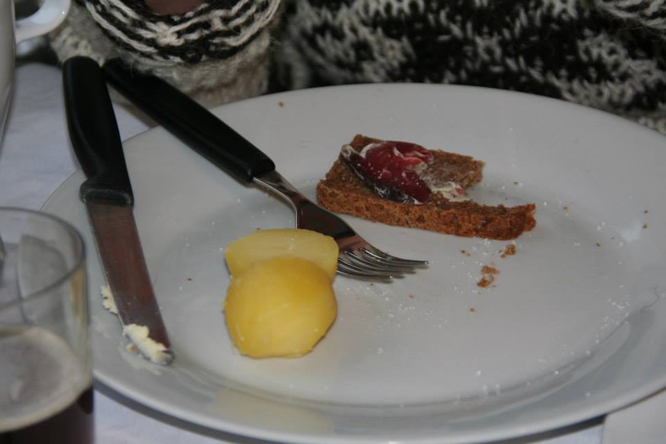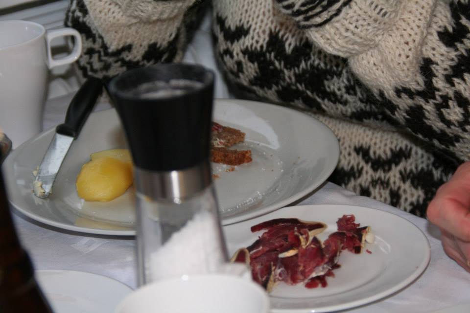 Pour faire honneur à mes hôtes, j’ai revêtu mon beau pull 100% laine de mouton et Ásmundur s’installe à ma gauche pour me coacher. Devant moi, des pommes de terre, des tranches de charcuterie (de la saucisse danoise, du saucisson de mouton, de la morue séchée, une cuisse d’agneau faisandé) et dans une petite assiette, de fines tranches de viande séchée, presque noire, accompagnées de deux autres assiettes de tranches blanches-roses : de la viande de baleine-pilote (qui sont en fait des dauphins) servie avec son gras. GLOUPS !