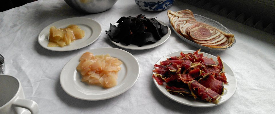 Deuxième étape, le jambon d’agneau séché… Je me fais expliquer le processus : la cuisse sèche à l’air et au vent pendant 5 à 9 mois avant d’être dégustée. Je me sers un morceau sur une tranche de pain de seigle. Je renifle d’abords. Ça sent moins que ce à quoi je m’attendais mais l’odeur est clairement là… enfin, je mords dedans. C’est un peu sûr, un peu difficile à mâcher mais loin d’être mauvais. J’en reprends même une deuxième tranchette et pose fièrement avec mon jambonneau, à la grande hilarité de mes hôtes.