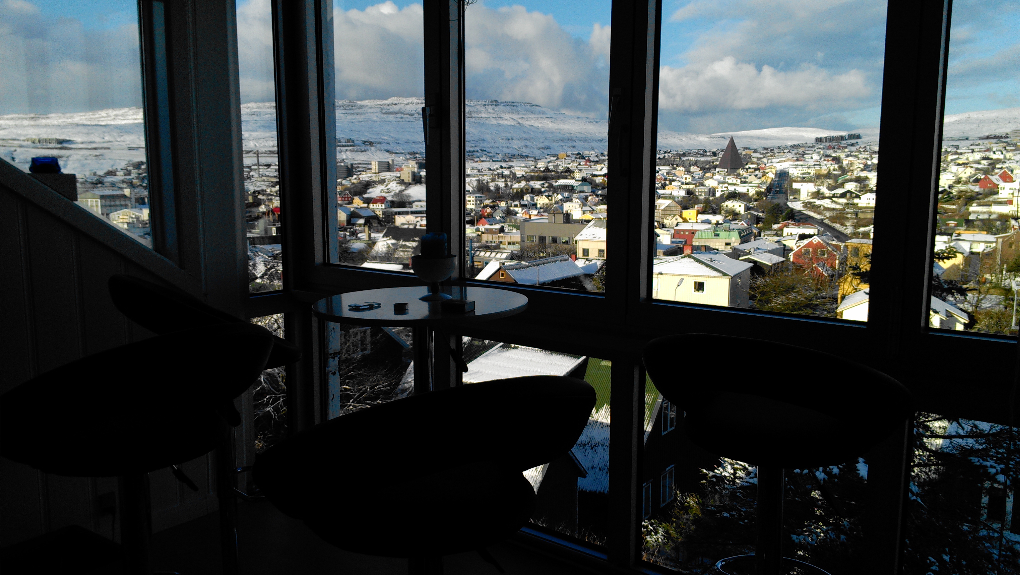 Elle m’emmène à l’étage vers mon domaine temporaire. J’ai droit à un deux pièces : une chambre et un superbe salon qui surplombe toute la ville. C’est juste superbe. Quand tombera enfin la nuit et que les lumières s’allumeront, Tórshavn, qui a une forme d’amphithéâtre, apparaîtra beaucoup plus grande qu’elle ne l’est.
