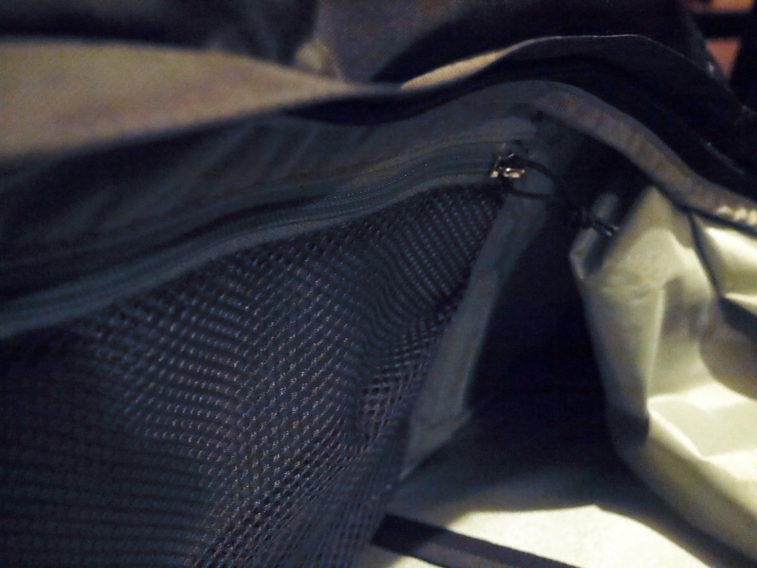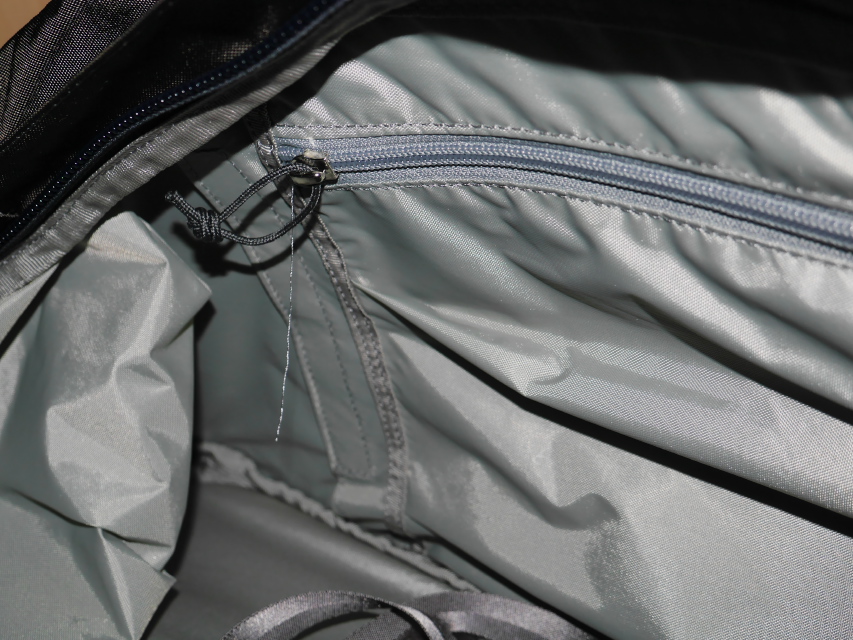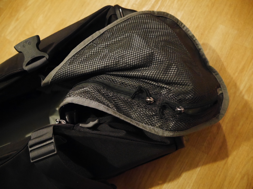 - Tout en haut du sac, bien caché (il a fallu que je trouve le manuel de l’utilisateur sur le web pour le savoir), on trouve une sangle pour maintenir un sac à dos (dans mon sac, ce sera mon sac de couchage) et sur les côtés, 4 attaches pour y fixer un petit sac-à-dos, au cas où il serait trop encombrant.