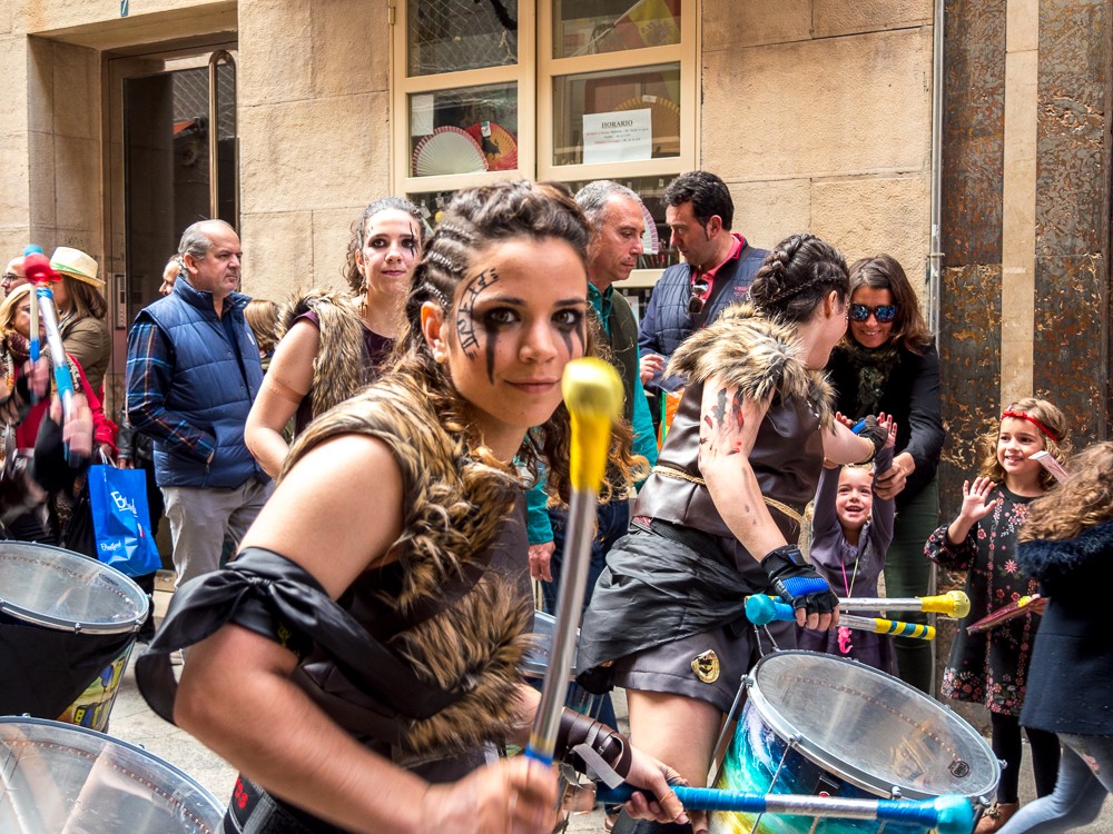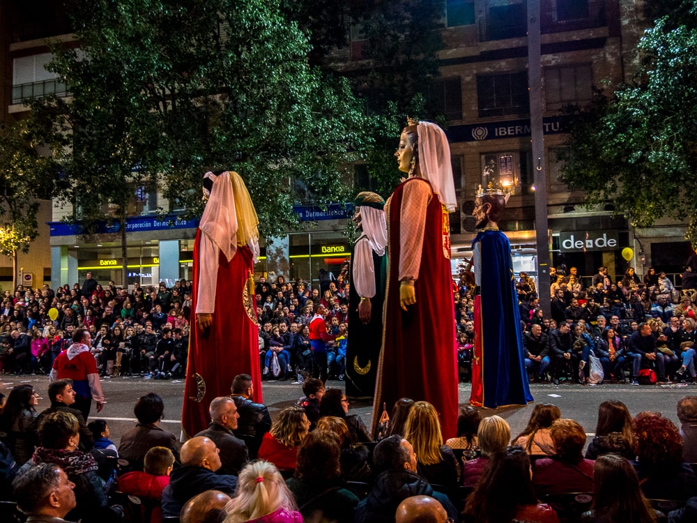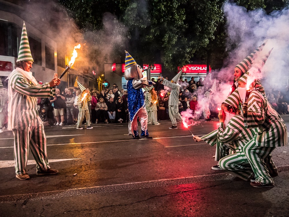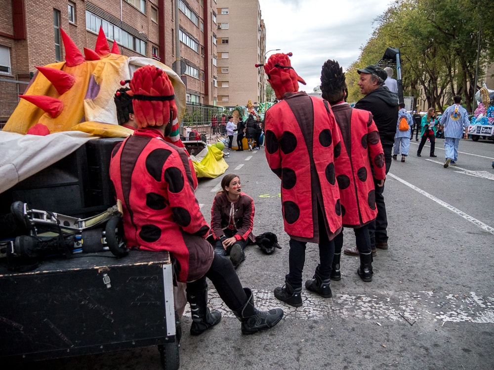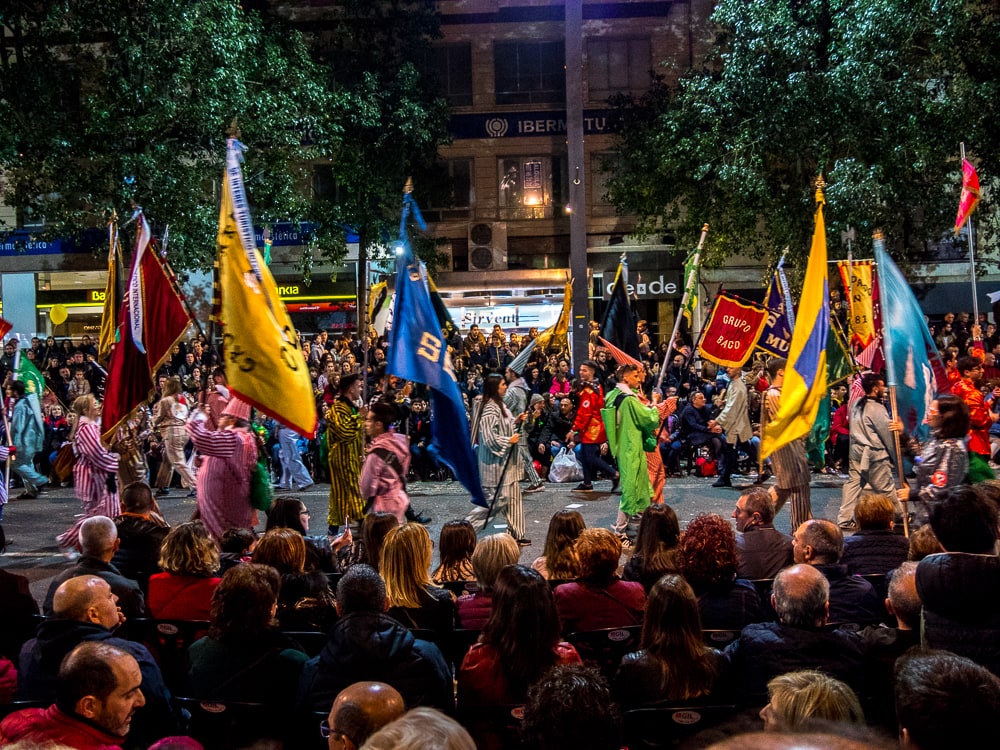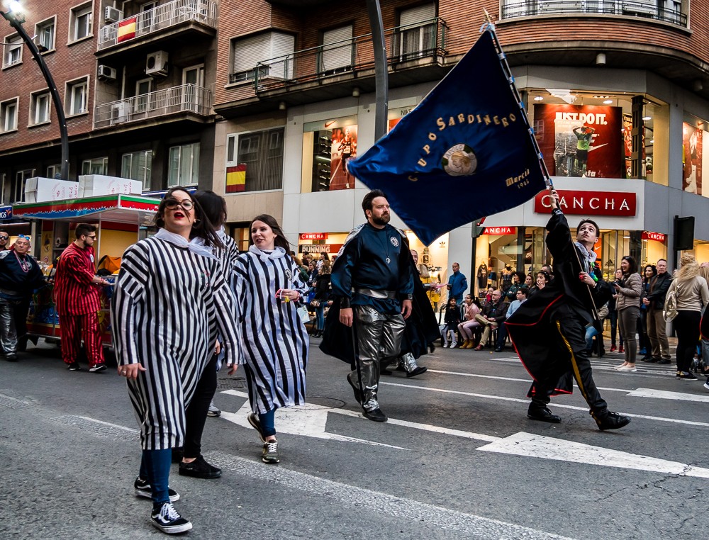 Le vendredi, c’est le branle-bas de combat à Murcia ! Arrivés de bon matin, les ouvriers municipaux sont en train d’installer chaises et tribunes pour le défilé de ce soir car le vendredi, c’est le jour de la Lecture du testament de Doña Sardina et le moins que l’on puisse dire, c’est qu’être bien situés demandent de l’investissement en temps : pour être sûrs d’avoir les meilleures places pour le défilé, nous serons là deux heures à l’avance (ça donne une idée de la popularité de ce festival) (et vive les smartphones bien chargés pour passer le temps). Enfin, voilà le défilé ! Un vrai défilé de Carnaval où se mélangent groupes folkloriques venus de Murcia et d’ailleurs (voire, de très ailleurs comme un groupe carnavalesque bolivien, une fanfare polonaise et une autre irlandaise), confréries de Sardineros, écoles de danse… Un grand melting pot joyeux et bruyant et comme nous sommes aux premiers rangs, nous avons vraiment l’impression d’être dans le show !