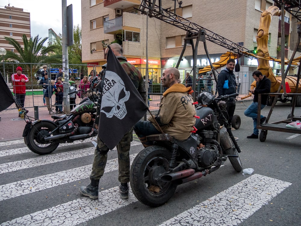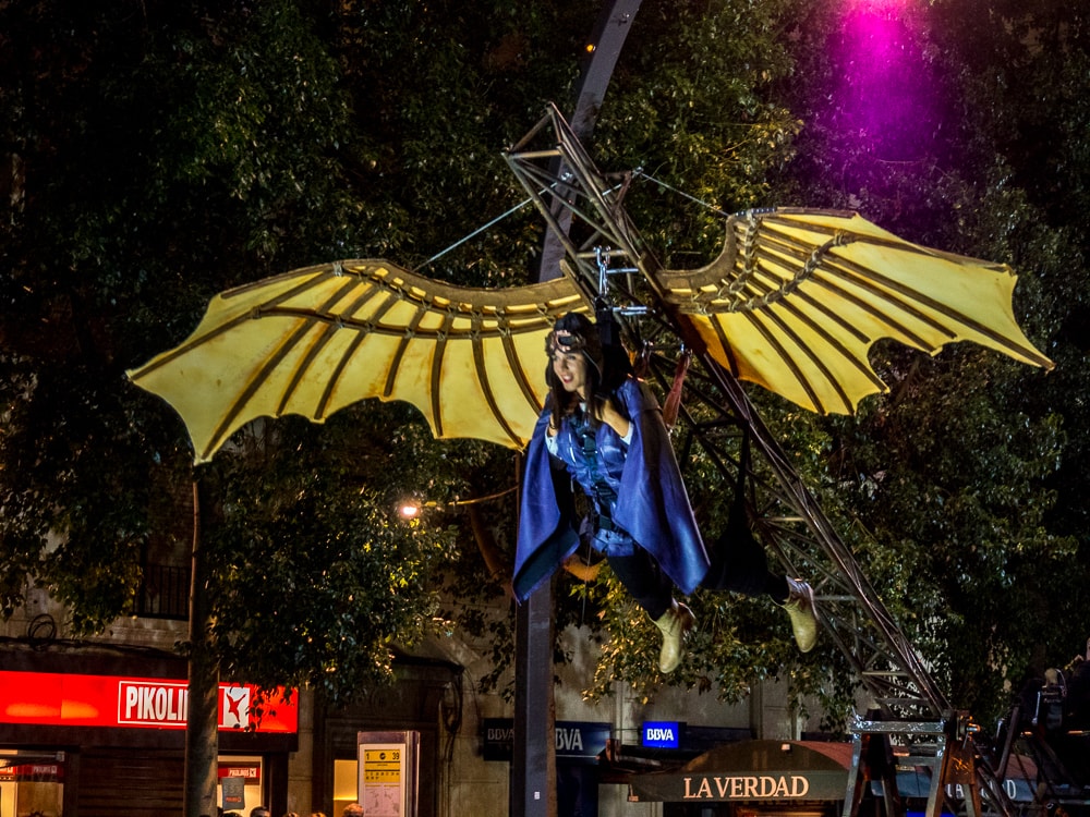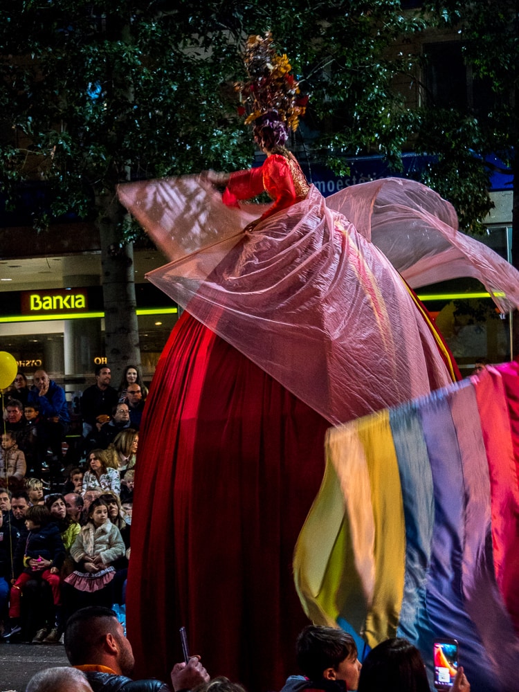 Après une bonne demi-heure de marche, nous y voilà enfin : la tribune réservée aux médias et cette fois, nous avons nos places. Malheureusement, plus au premier rang mais cela nous donnera une nouvelle perspective ! Après un TRES long défilé des sponsors (j’avais un peu l’impression de voir passer la caravane du Tour de France), la tête du cortège se montre : ce sont les porteurs de drapeaux de différentes municipalités de la région de Murcia qui participent à la fête. Comme la veille, il s’agit d’un défilé de différents groupes, certains faisant leur réapparition mais la grande particularité, ce sont les chars qui accompagnent les groupes. Evidemment, le plus salué est celui de la Sardine, qui a plutôt l’air bien vivante (où serait-ce son fantôme venu faire la fête ?). S’en suivent différents tableaux, des allégories aux saisons, un tableau « Mad Max » avec motos vrombissantes et tronches cassées, un autre célébrant « Gatsby le Magnifique », etc. On alterne entre le beau, le poétique, le kitsch, le carrément WTF… mais on en prend plein les yeux, comme cette acrobate attachée à un cerceau suspendu dans les airs par des dizaines de ballons gonflés à l’hélium.