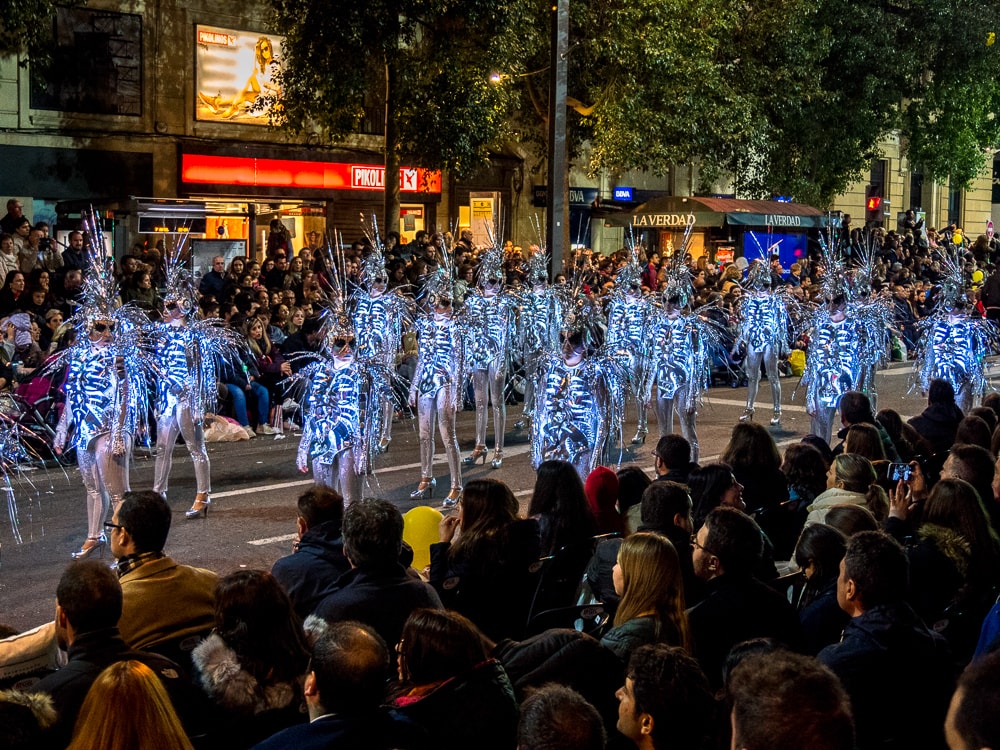 Enfin, dans un grand fracas de bruit, on arrive aux protagonistes les plus importants du défilé : les chars des confréries des Sardineros. La plupart du temps décorés en papier mâché, ils représentent chacun des caractéristiques de leurs divinités et personnages patrons : un grand bateau pour la confrérie « Ulyse », un char aux motifs chauds bouillants pour « Eros », un squelette pour « Pluton » ou encore des représentations des 12 travaux pour « Hercules »… Et là, c’est la folie puisque chaque confrérie distribue à la volée des cadeaux : ballons, jouets, peluches, sifflets… C’est à qui attirera l’attention d’un sardinero ou d’une sardinera ou aura le bras assez long pour attraper un lot au vol. C’est la folie, tout le monde hurle, siffle, tend les bras pour essayer de saisir quelque chose. Je me prends au jeu en agitant les bras pour faire signe aux sardineros mais rien à faire, assise bien trop loin pour qu’un lot puisse m’atteindre. Mais c’est sans doute le moment le plus drôle de toutes les festivités.
