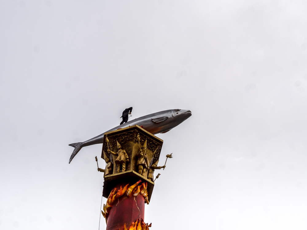 Outre la Sardine, d’autres personnages importants sont du défilé : les géants et grosses têtes, personnages typiques du Levante et qui me rappellent furieusement les géants que nous connaissons en Belgique mais aussi le Dragon de Conte, une énorme bête de papier mâché cracheuse de feu. Cette oeuvre d’un artiste local y est chaque année !