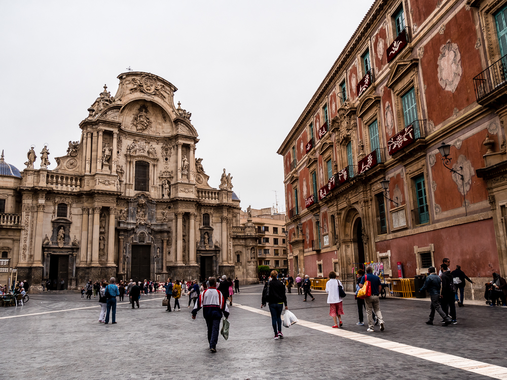 La Place de la Cathédrale est sans aucun doute le joyau de Murcia. Dans le fond, la Cathédrale, juste à sa droite, le Palais épiscopal, résidence de l’évêque (et que l’on peut visiter) et à gauche, de jolis cafés et restaurants qui donnent fort, fort envie qu’on s’y attarde ! Mais comme nous venons à peine d’avoir englouti notre petit déjeuner, nous passons notre chemin pour aller visiter la cathédrale, bel exemple du style baroque de la contre-réforme.