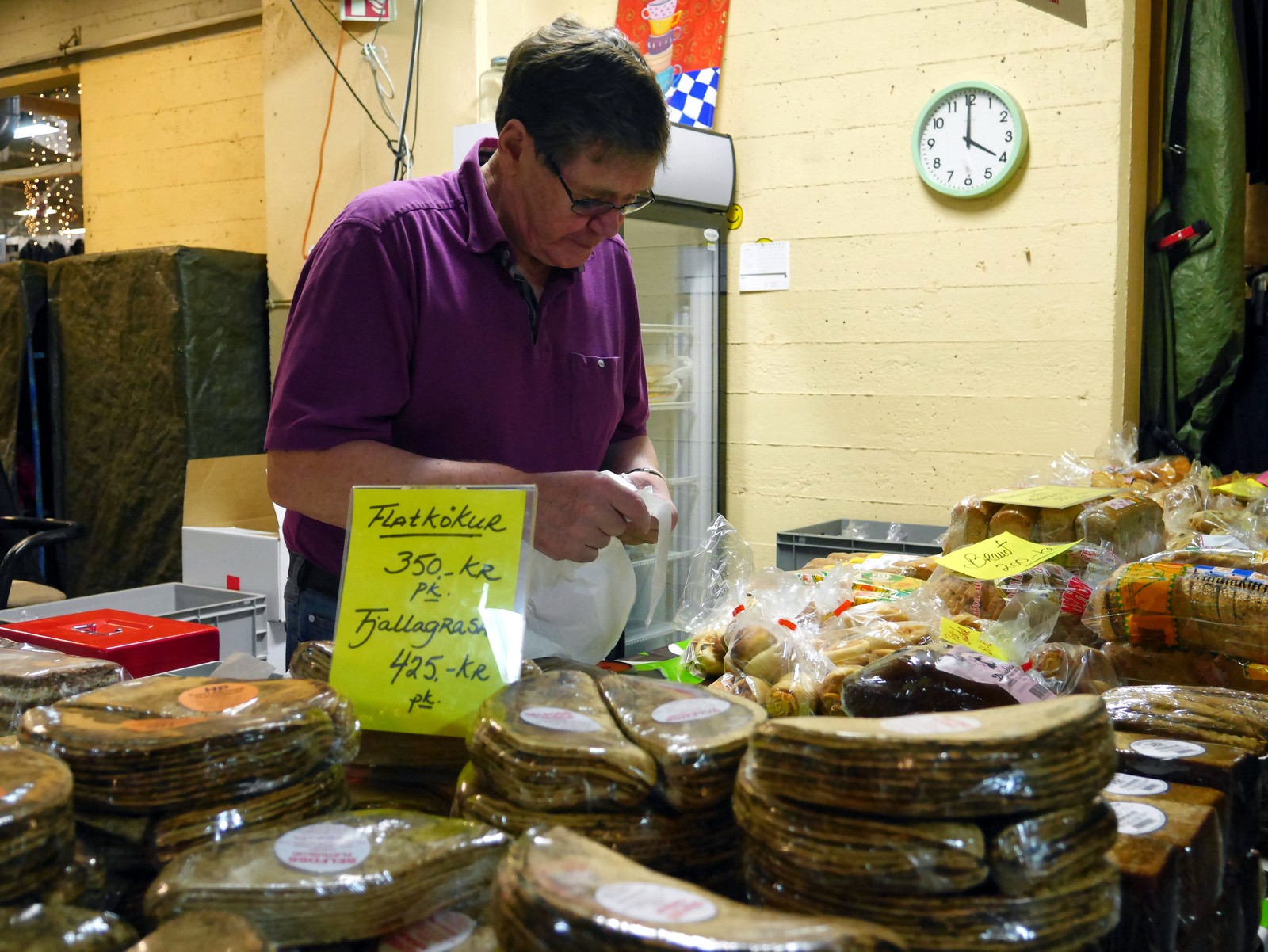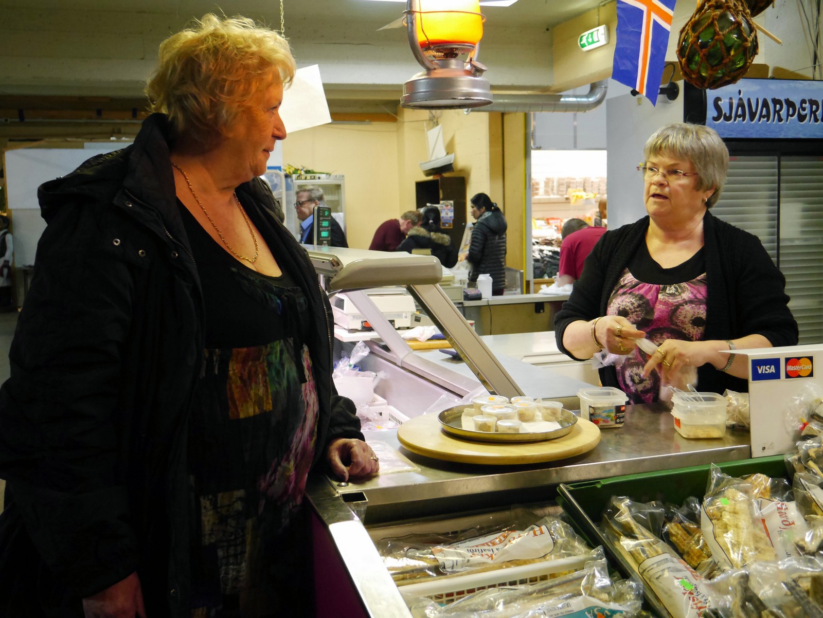 En me baladant, je jette un regard amusé sur les bandes dessinées. Tintin est là, en islandais. Je suis presque tentée d’acheter… mais surtout, je trouve « Les 4 As », une BD que je n’ai plus lu depuis l’âge de 12 ans. Je n’avais aucune idée qu’ils étaient connus jusqu’ici ! Nos achats terminés, nous nous dirigeons vers la partie « nourriture » du marché. Il y a un petit café et bien entendu, plusieurs poissonneries. Pour moi, c’est le moment où jamais pour tester une spécialité typiquement locale : l’aileron de requin faisandé.