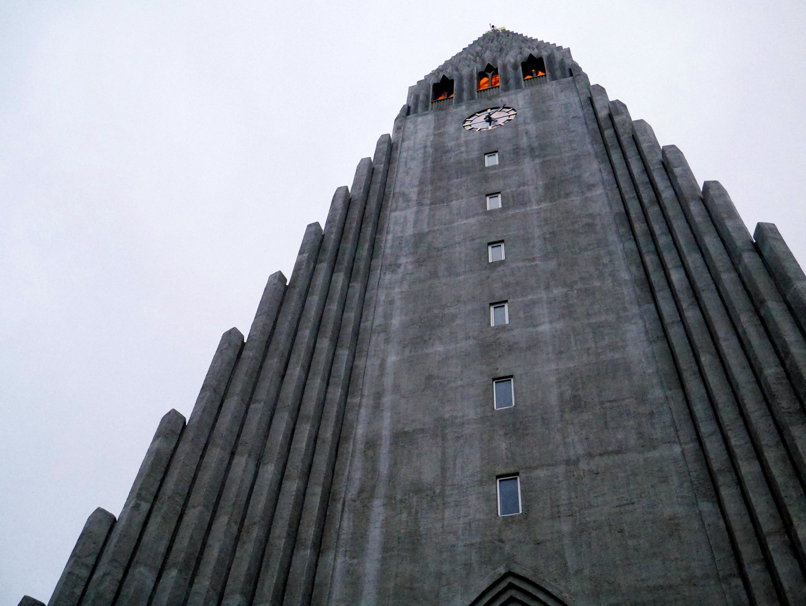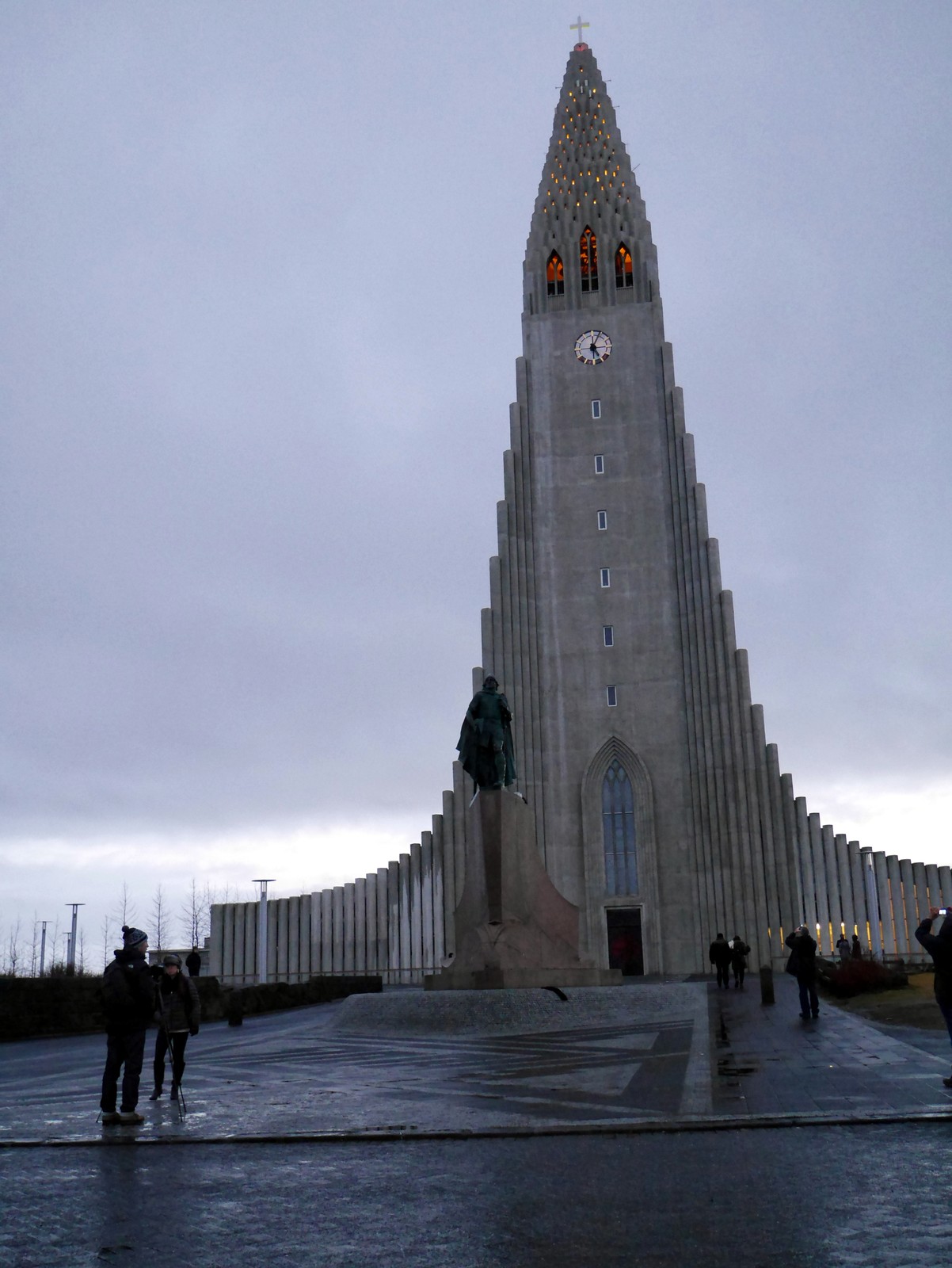 A 17 heures, le marché ferme… on quitte un peu plus tôt pour se rendre à Hallgrímskirkja, une grande église luthérienne moderne qui surplombe la ville, comme une flèche grise. Il a arrêté de pleuvoir, un peu. Sophie est déçue. Elle aurait voulu me faire traverser un Tjörnin gelé… mais il ne reste quasi plus de glace. A seulement deux heures de Reykjavík, il y avait de la neige et du gel mais ici, il fait un bon petit 5 degrés. En plus d’une météo changeante, le pays est une mosaïque de micro-climats (facteur à prendre en compte si tu prépares un voyage là-bas, surtout en automne-hiver-printemps). Monter au sommet de l’église pour avoir une vue de toute la baie de Reykjavík est aussi dans la liste de choses à faire mais pas de chance. Quand nous arrivons, nous trouvons porte close.
