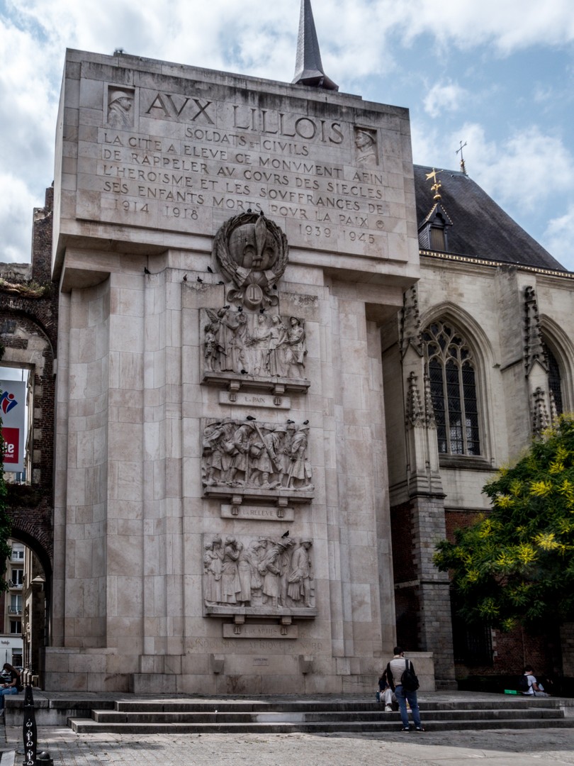 On commence tout de suite au cœur du sujet avec une visite guidée de la Grand-Place et de ses environs. Nous avons rendez-vous avec notre guide devant l’office de Lille Tourisme qui se trouve dans le Palais Rihour, dans l’ancienne salle de garde. Ce bâtiment est tout ce qui reste du vaste palais qui fut construit par Philippe-le-Bon, duc de Bourgogne. Un palais que Philippe ne verra jamais fini car il prit 20 ans pour être complété. Le bâtiment original avait une forme carrée avec une cour d’honneur en son centre. Très vite, les ennuis commencent pour le Palais. Construit sur un terrain marécageux, il a rapidement besoin de rénovation. En 1700, l’aile nord subit un incendie. Moins de 50 ans plus tard, c’est l’aile ouest qui prend feu. En 1916, en pleine occupation allemande, le palais est à nouveau ravagé par les flammes. Il abritait alors la mairie. Cette fois, il ne sera pas reconstruit ou rénové mais rasé en grande partie, en ne gardant que le petit coin que l’on peut voir aujourd’hui. Malheureusement, lorsqu’on vient vers lui depuis la Grand-Place, on le remarque à peine, tout caché qu’il est par l’immense Monument aux morts de la guerre 14-18.