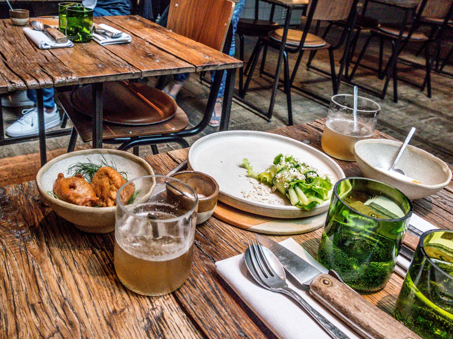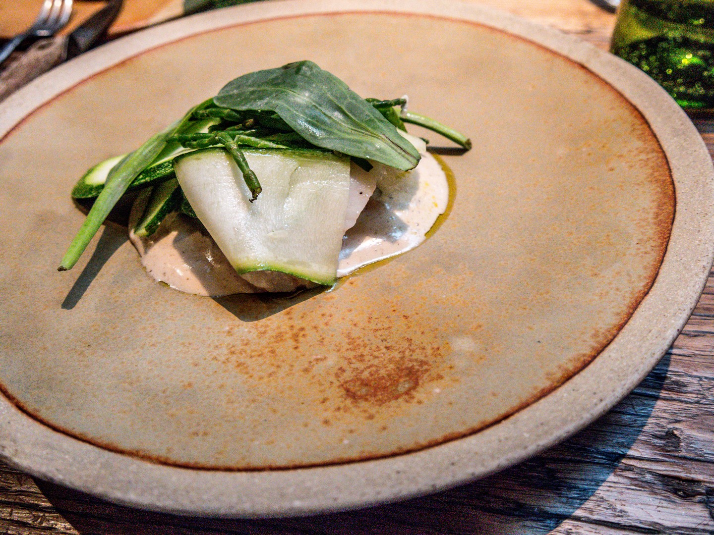 Au fond d’une cour, nous découvrons une salle qui semble avoir été un entrepôt ou une grange (c’était en fait un atelier de menuiserie). L’espace est brut, avec des tables et chaises en bois, un plancher presque tel quel… et bien sûr, pas mal de plantes en pot. Le concept du Bloempot est de proposer une cuisine avec des ingrédients locaux (qu’on est allé chercher dans un rayon de kilomètres restreints (c’est-à-dire pas de poivre ou de café). Seuls les vins échappent à la règle (même si on a vu des vons belges à la carte). Parce qu’on sortait à peine de l’Echappée Bières et pour jouer encore plus le jeu du local, nous avons choisi l’accord mets-boissons sans alcool (composé de diverses infusions, kombucha et autres boissons fermentées).