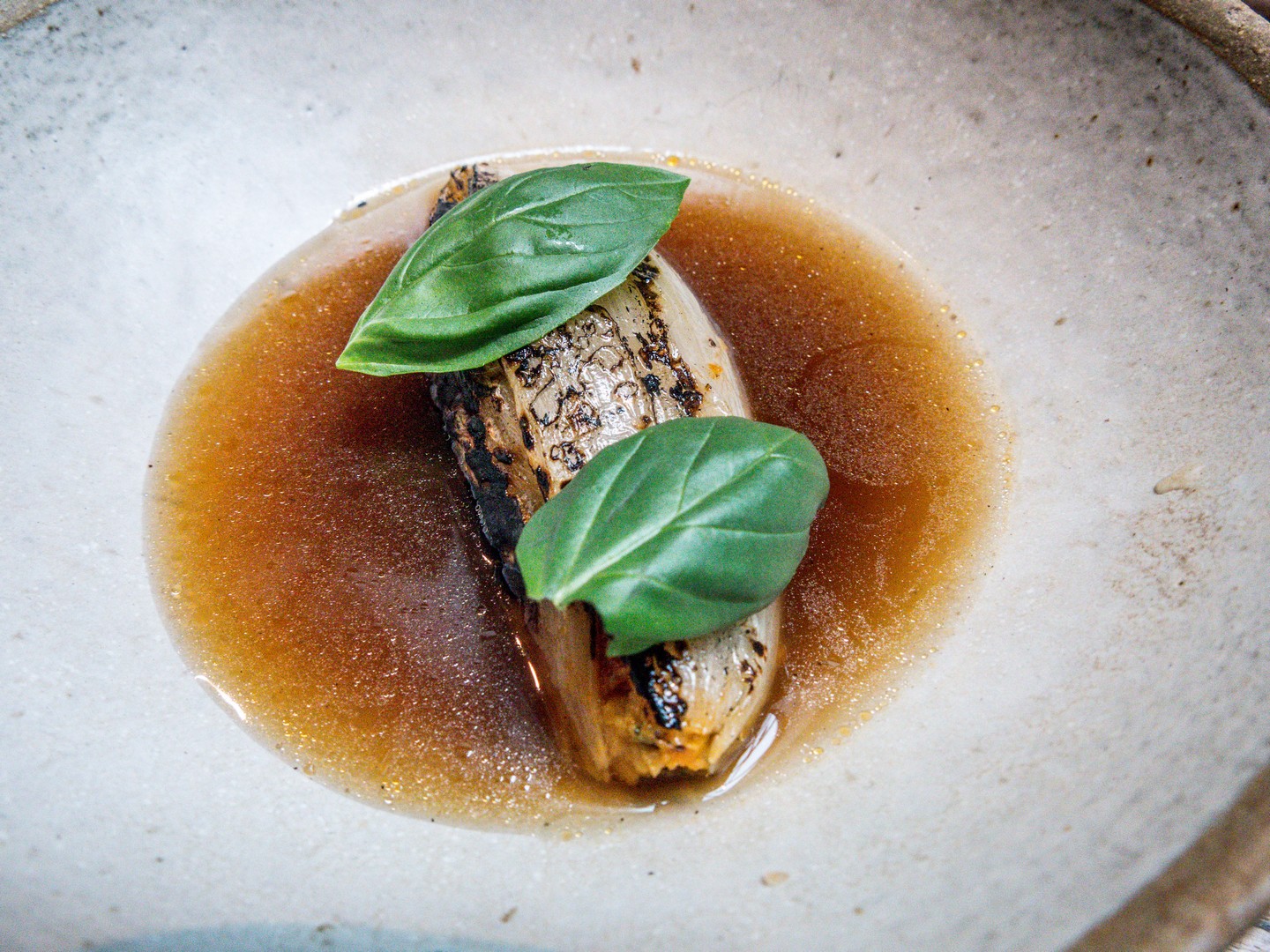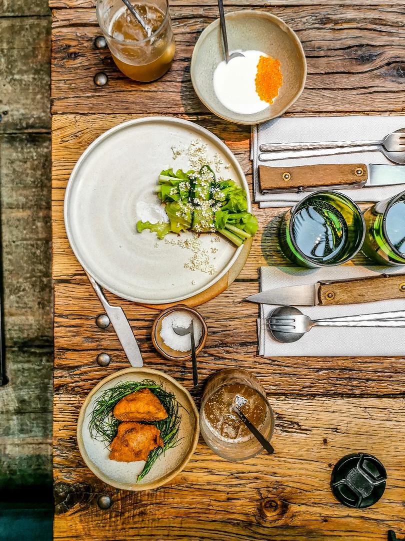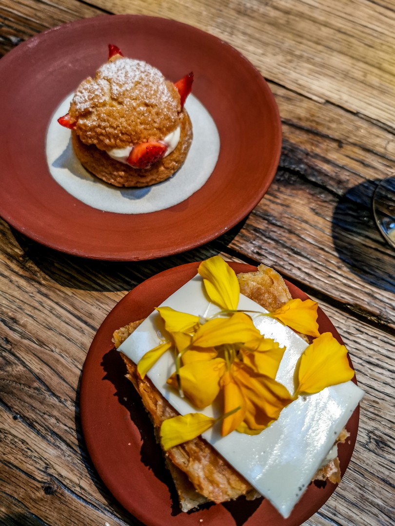 Le menu 5 services, agrémentés de petites pauses gourmandes. Au menu, des « rouleaux de printemps » au concombre, beignets de fenouil et œufs de truite, un oignon farci accompagné d’un bouillon de betterave jaune en entrée, un entre-plat de tartelettes à l’aubergine brûlée, courgettes au beure de reine-des-prés suivie d’une splendide échine de porc au barbecue et poireaux, d’une assiette de fromages et d’une assiette dessert de folie avec 3 propositions sur l’assiette : une faisselle de chèvre à la rhubarbe et fleurs de sureau recouverte de fleurs, un délicieux chou au géranium et aux fraises bien joufflu et enfin, un surprenant millefeuille à la tagète, recouvert d’un voile de lait.