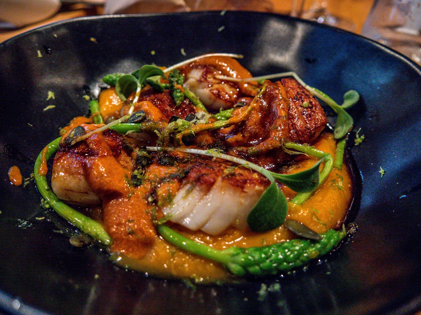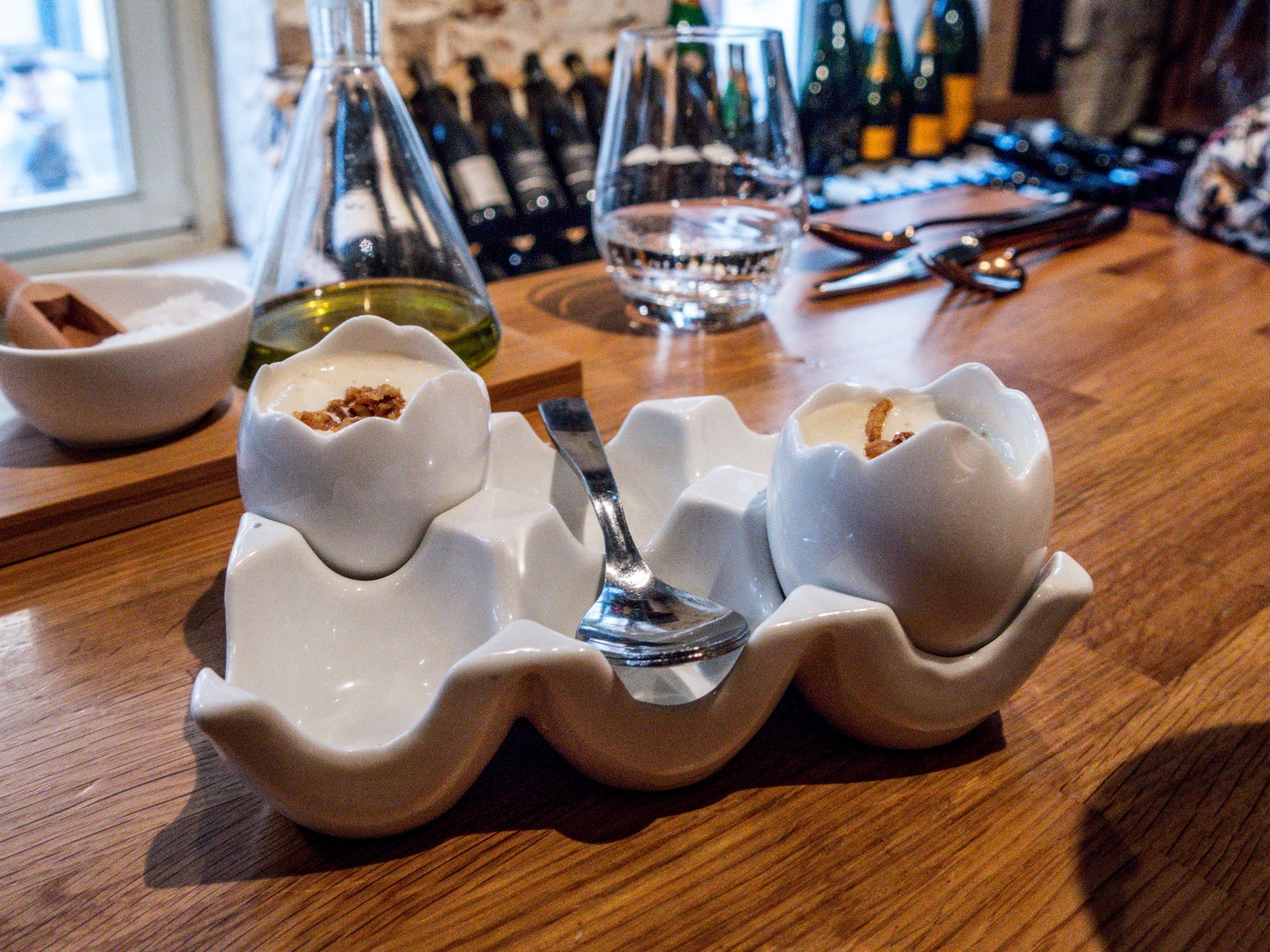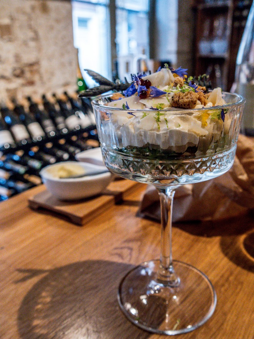 On peut choisir dans une carte courte, mais bien fournie, de plats bien alléchants ou, si tu es joueur ou joueuse, Lectrice, Lecteur, choisir la « dégustation à l’aveugle » où le chef, Clément Richevaux, façonne un menu 3, 4 ou 5 services avec des produits de saison et selon vos allergies. Notre service consistait en des classiques de la cuisine mais soit revisités ou déstructuré à ne pas être reconnaissable à l’œil nu, soit présentés en trompe-l’œil. On s’est bien amusées à reconnaître les différents plats (notre serveur venait nous révéler les plats après avoir débarrassé le plat fini). Très sympa pour se faire une bonne table sans prise de tête.