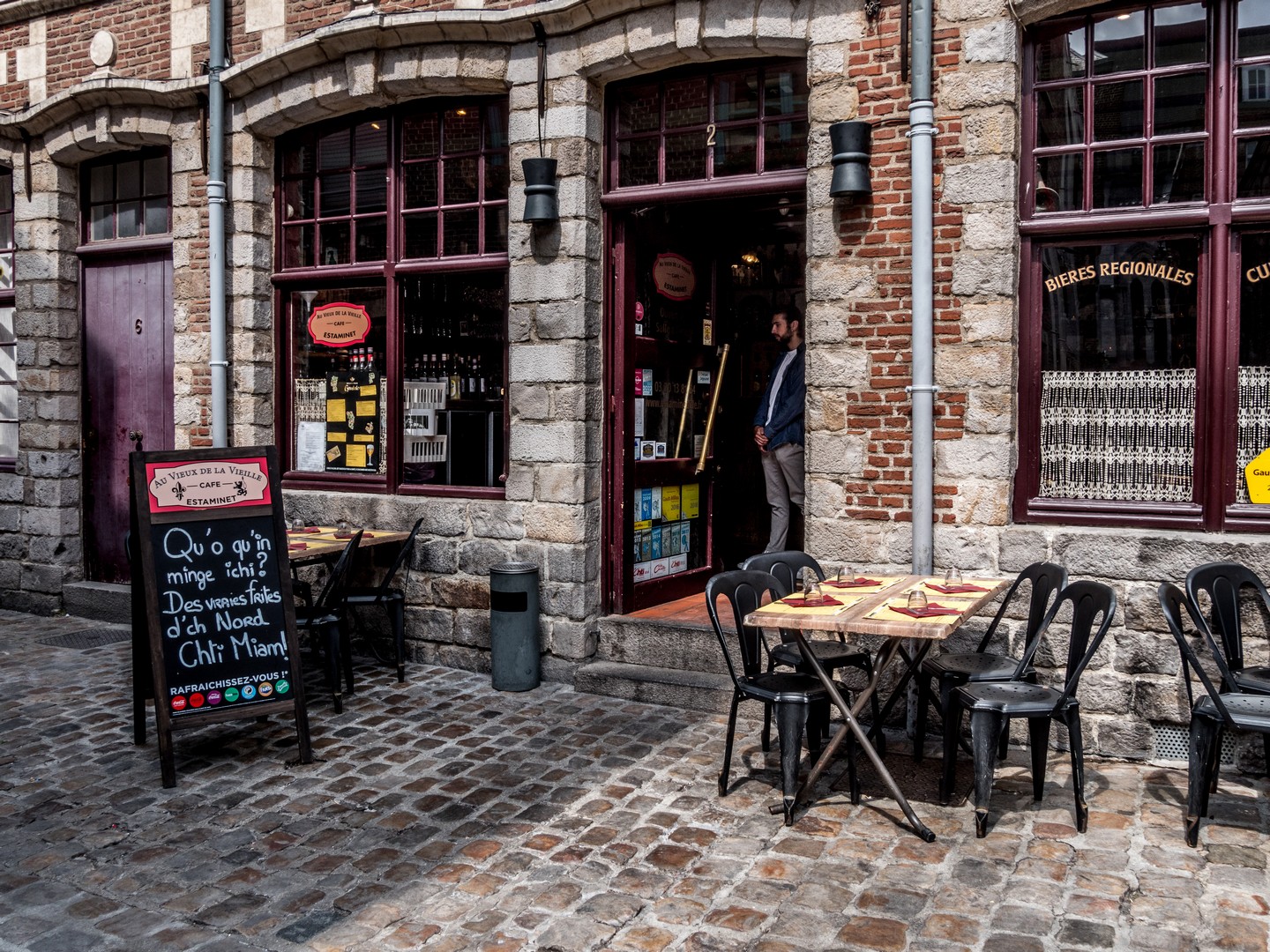 Juste dehors, plusieurs cafés étalent leurs terrasses au soleil. Notre guide attire notre attention sur celle de « Morel et Fils », une ancienne bonneterie. Regardez bien le haut de la façade et vous verrez… un boulet de canon fiché dedans. Il ne s’agit pas de vrais boulets qui auraient été tirés pendant le Siège de Lille mais de boulets en fer destinés à rappeler, avec humour, cet évènement.